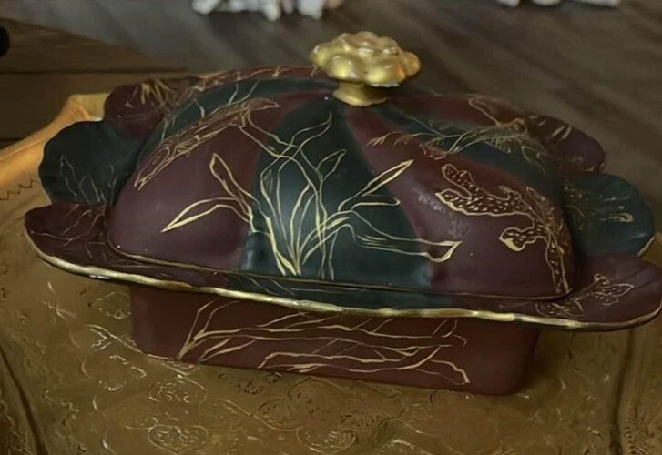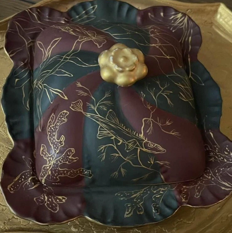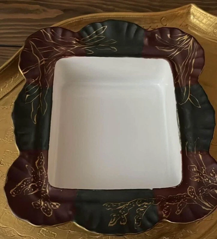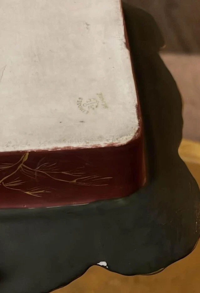 Rare find. Marked on bottom as in picture - I cannot find this pattern. Handpainted red and green with gold fish seaweed outlines? Great shape for being from the early 1900s. There is one tiny chip underneath - see picture. Marking is from early late 1800s early 1900s. Square approx 6 1/4”.