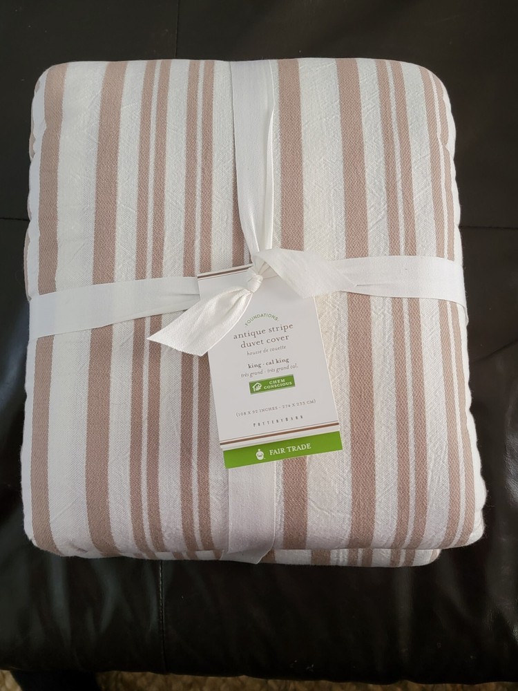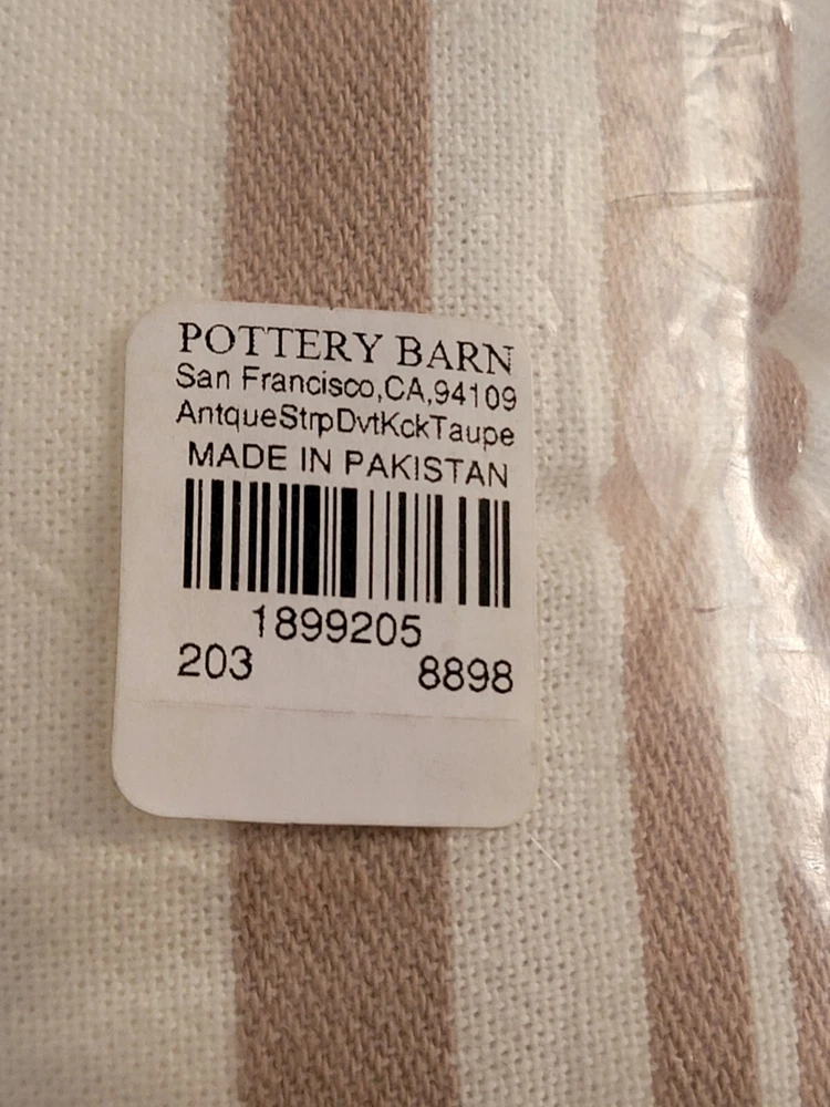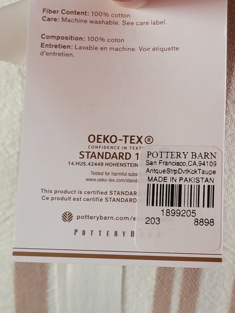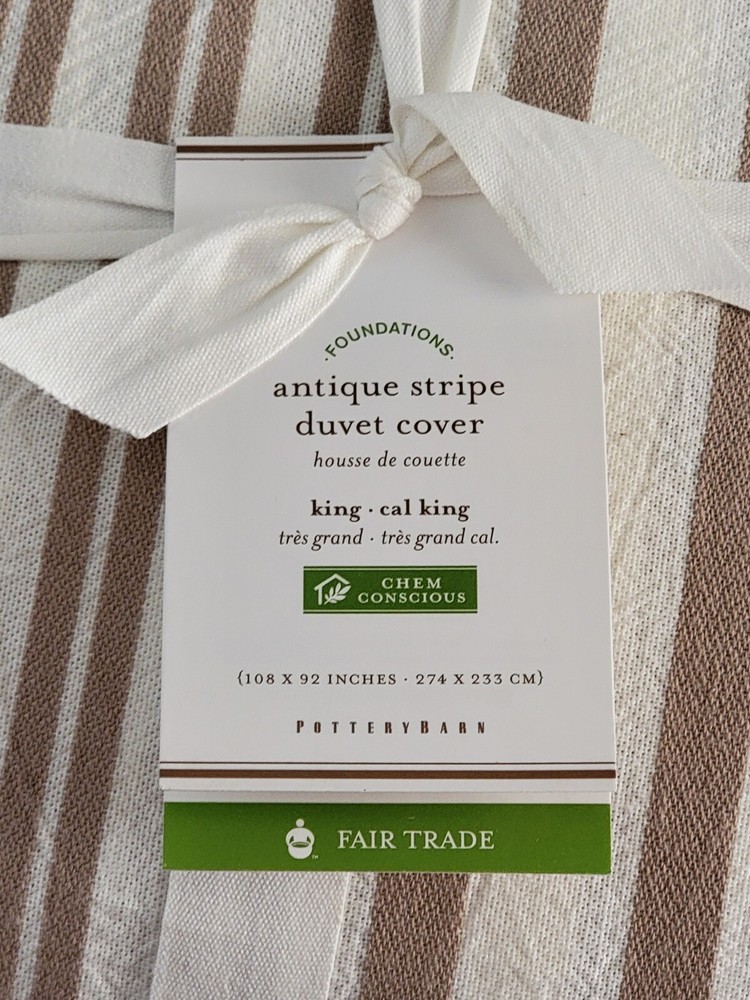 Antique Stripe Duvet Cover King Pottery Barn Taupe Add a touch of antique elegance to your bedroom with this beautiful Pottery Barn king duvet cover in taupe. The striped pattern adds a classic touch to any room. Made of cotton material and crafted with care in Pakistan, this duvet cover is STANDARD 100 by OEKO-TEX certified for ultimate comfort and safety. Care instructions are easy with machine wash capabilities, ensuring that your duvet cover stays looking like new for many nights to come. This set includes one duvet cover with button closure for easy use. Personalization options are available but not included. Perfect for adult bedrooms, this duvet cover fits a king size bed with dimensions of 92 inches in length and 108 inches in width. Transform your bedroom into an antique haven with the Pottery Barn Antique Stripe Duvet Cover.