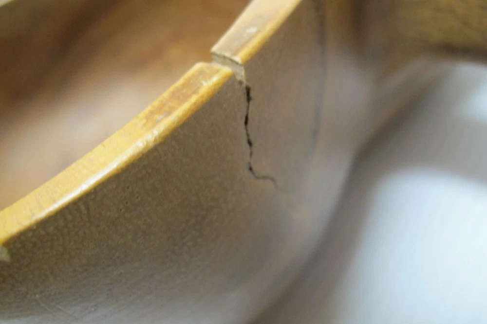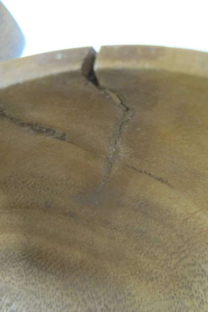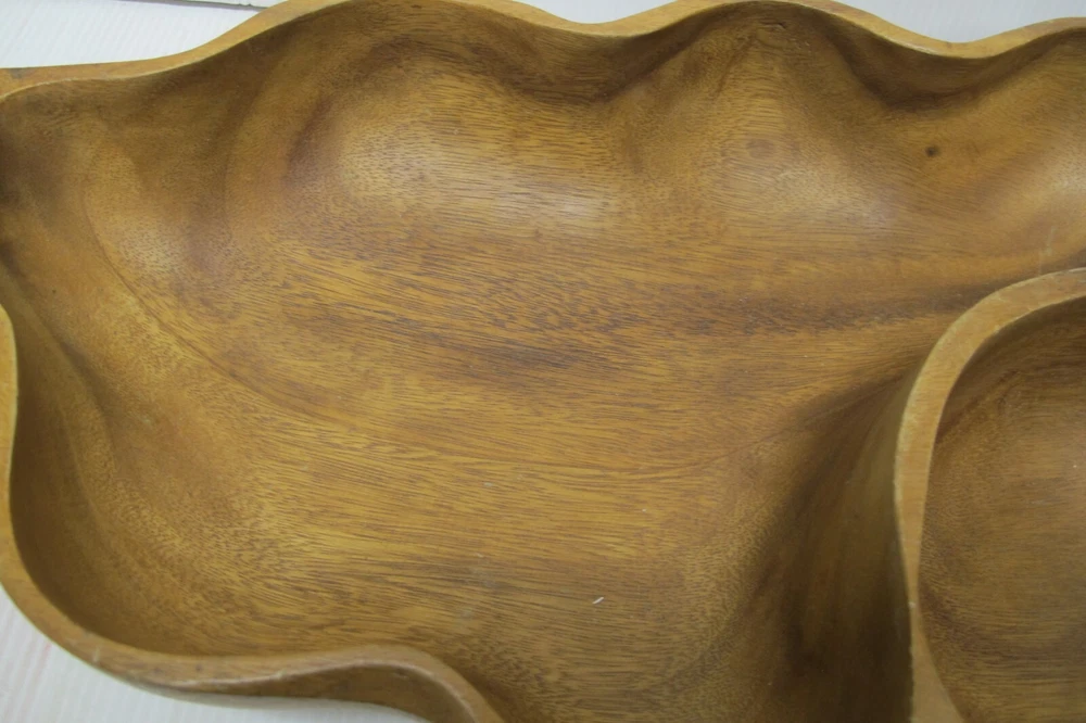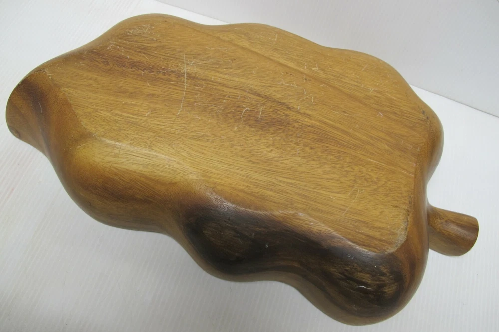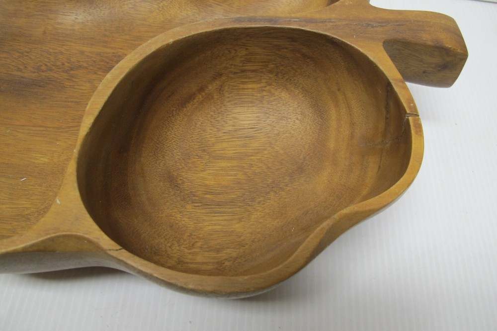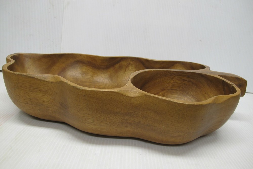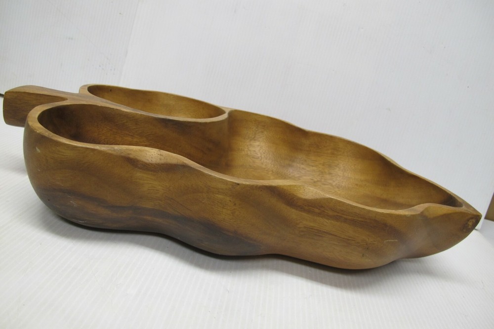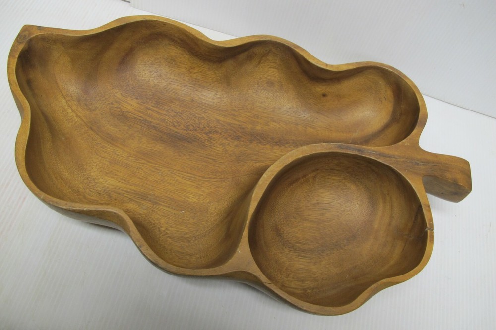 This is an antique or vintage original large mahogany wooden hand made leaf shaped chip and dip bowl. It was possibly made in Haiti but it has no markings or labels on it. It is a very nice bowl in good condition with normal wear due to age and use. including a small stress crack at the one end. It is heavy and solid wood and it measures approximately 19-1/2" long, 11-1/4" wide and 3-1/2" tall. Please look carefully at the pictures and email me with any questions prior to purchasing.