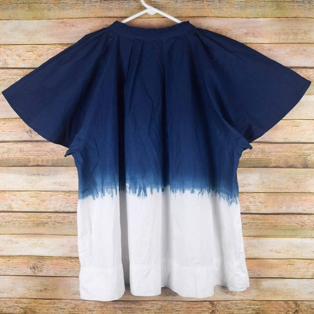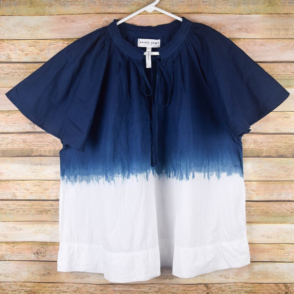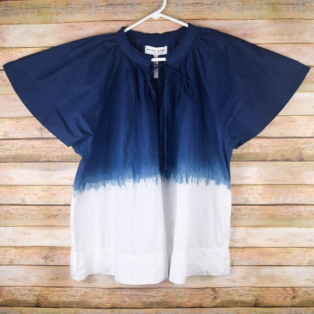 Apiece Apart Women's Blue White Dip Dye Front Tie Peasant Blouse Top Butterfly Sleeves - Size L Vera Petal Sleeve Top Retail $245 Cut from fine organic cotton, every Vera Petal Sleeve Top is dip-dyed, making each piece one of a kind and uniquely beautiful. This best-selling blouse pairs perfectly with your favorite skirts and denim, complete with flutter sleeves and a gathered self-tie neck. Length: 25" Armpit to armpit: 25" Pre-owned, in excellent condition Check out my other items!