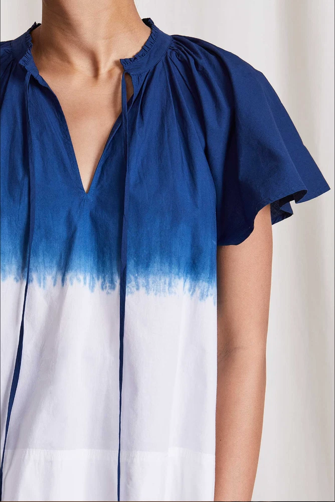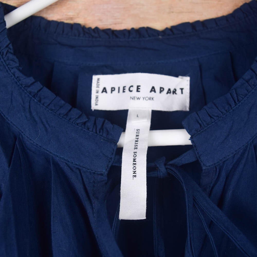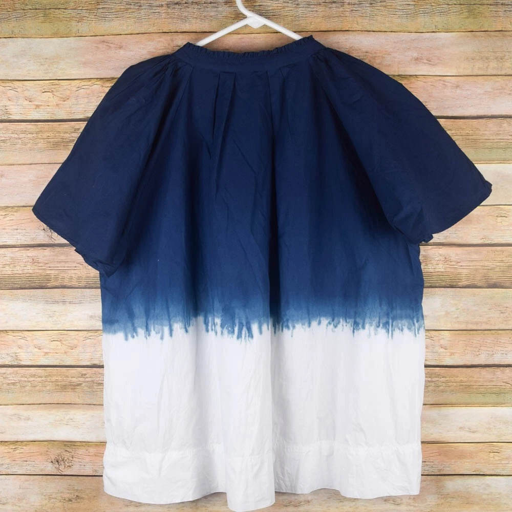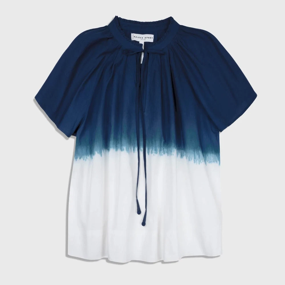 Apiece Apart Women's Blue White Dip Dye Front Tie Peasant Blouse Top Butterfly Sleeves - Size L Vera Petal Sleeve Top Retail $245 Cut from fine organic cotton, every Vera Petal Sleeve Top is dip-dyed, making each piece one of a kind and uniquely beautiful. This best-selling blouse pairs perfectly with your favorite skirts and denim, complete with flutter sleeves and a gathered self-tie neck. Length: 25" Armpit to armpit: 25" Pre-owned, in excellent condition Check out my other items!