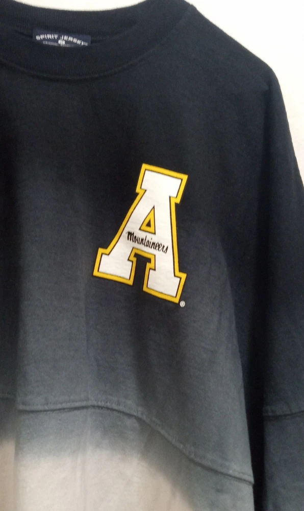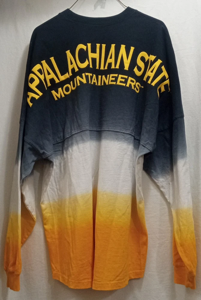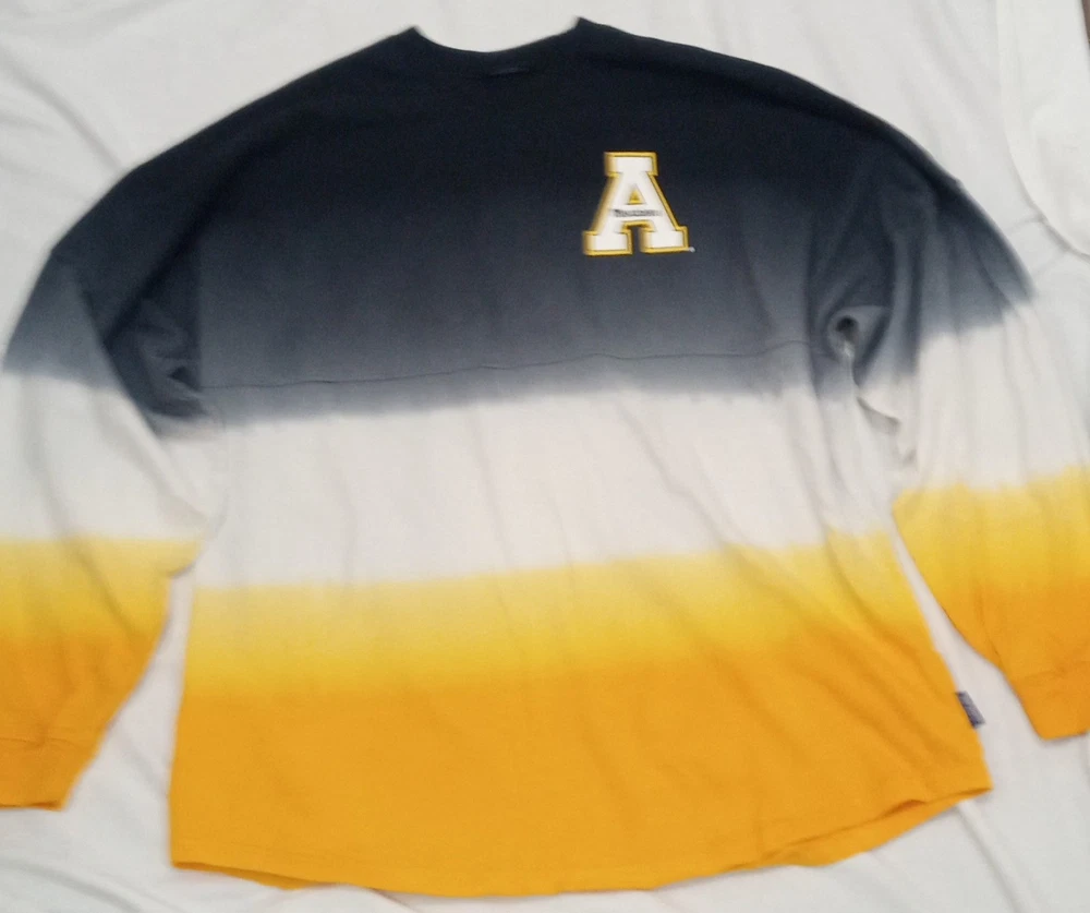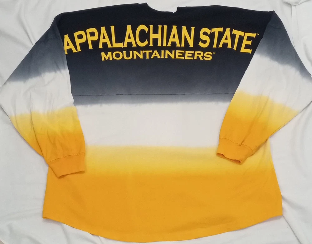 This RARE, beautifully colored Appalachian State Mountaineers shirt is new without tags. This is a Women's XL Appalachian State Mountaineers Spirit Jersey in yellow ombre color, officially licensed by NCAA. It features long sleeves and a dip-dyed design. Perfect for football fans wanting to show team spirit during the regular season. ***All of my clothing items get a light spray of Febreze Fabric. Please let me know if you would like this omitted.***