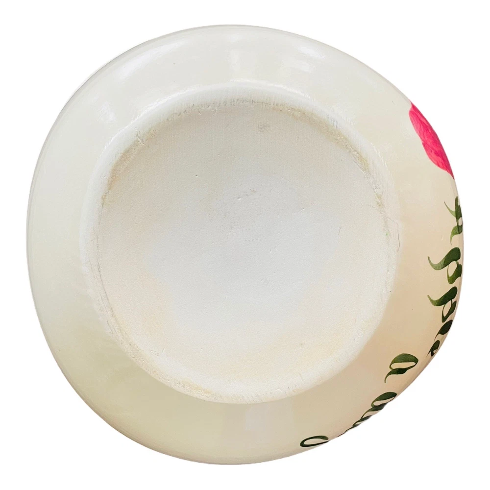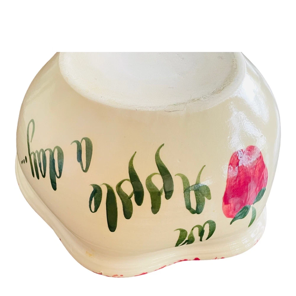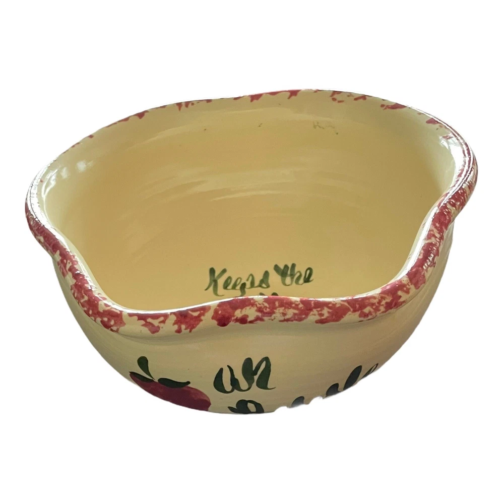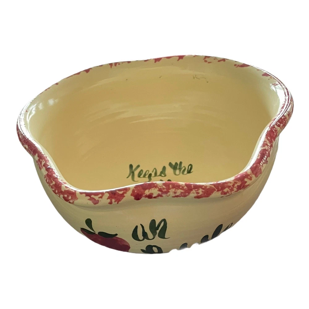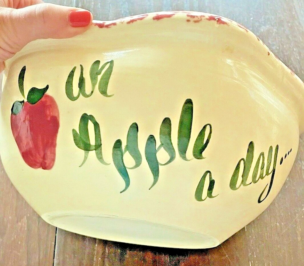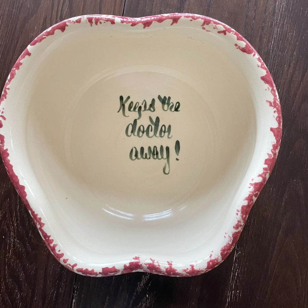 HANDMADE STONEWARE APPLE SHAPED BOWL WITH SAYING, "AN APPLE A DAY KEEPS THE DOCTOR AWAY". THE PERFECT APPLE BOWL THIS BOWL IS CREAMY WHITE AND RED THE PERFCT MEDICAL SCHOOL GRADUATION GIFT OR FOR THE DOCTOR YOU LOVE. JUST FILL IT WITH APPLES"AN APPLE A DAY KEEPS THE DOCTOR AWAY"HAND MADE IN EXCELLENT CONDITION, NO CHIPS OR CRACKS.NON SMOKING HOME THE SIZE ON THIS IN APPROX BECAUSE OF THE IRREGULAR APPLE SHAPE THE HEIGHT IS 5.5 INCHES LENGTH ACROSS IS 10 INCHES