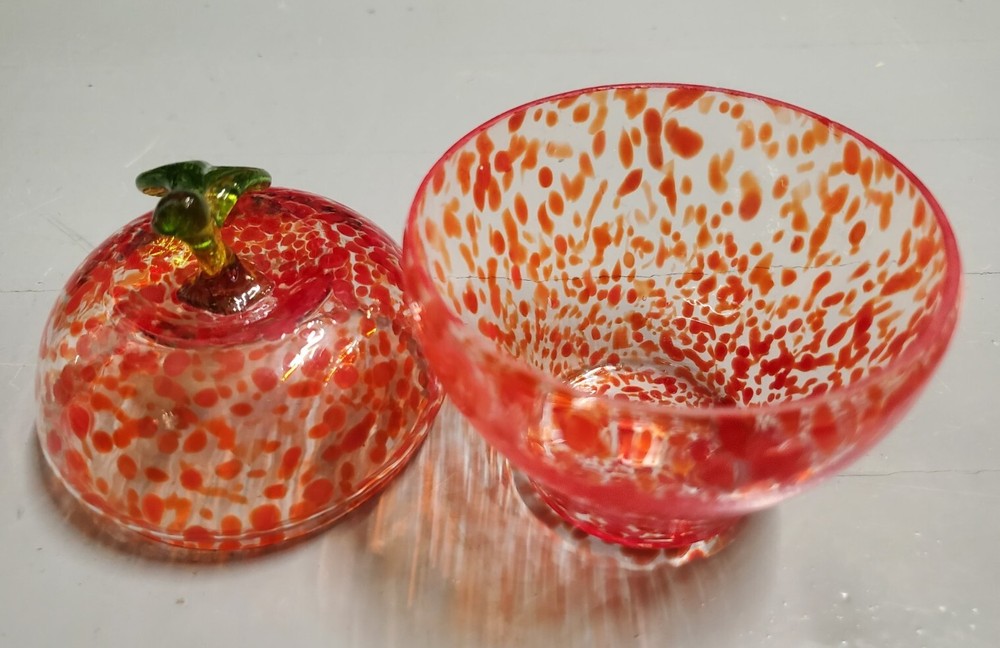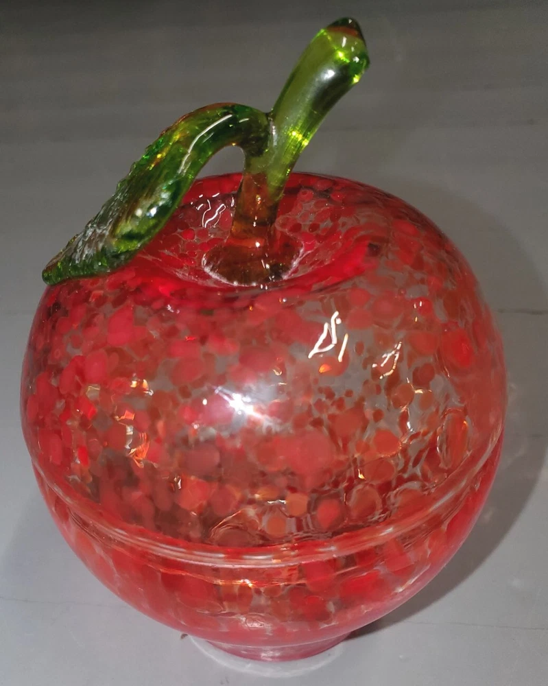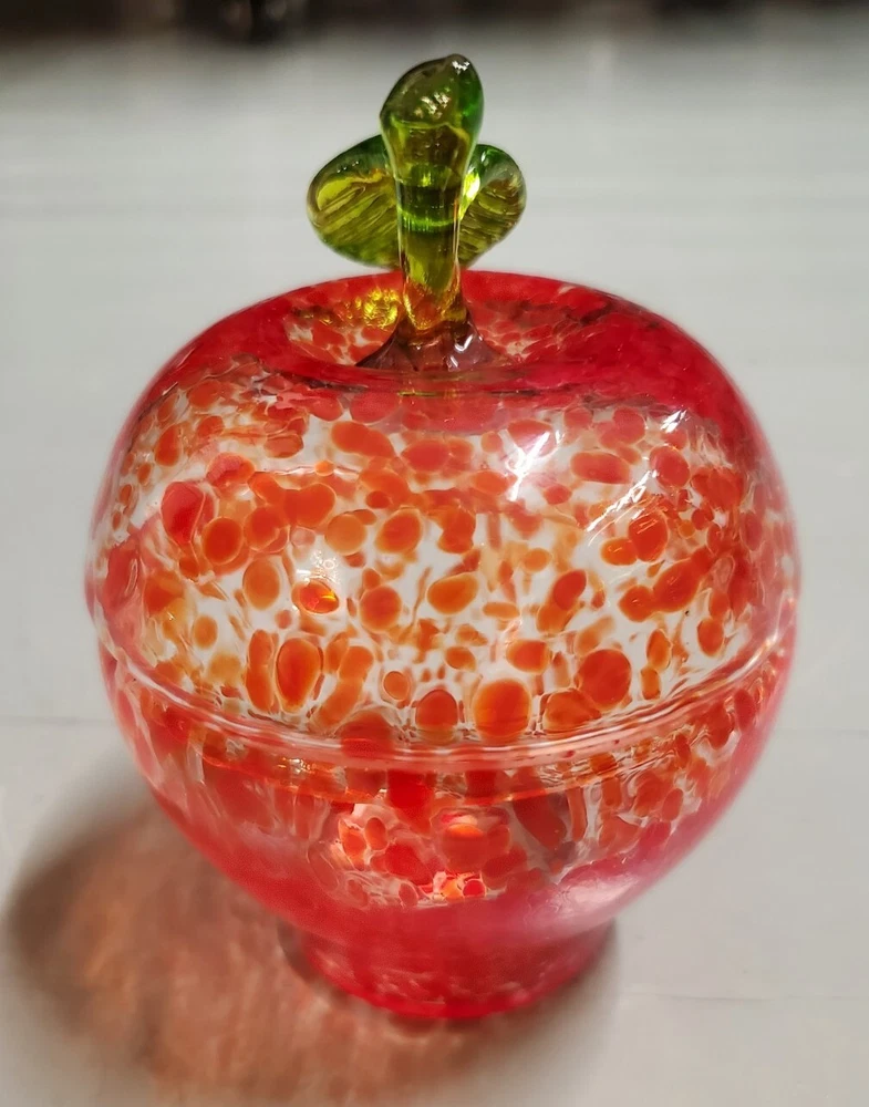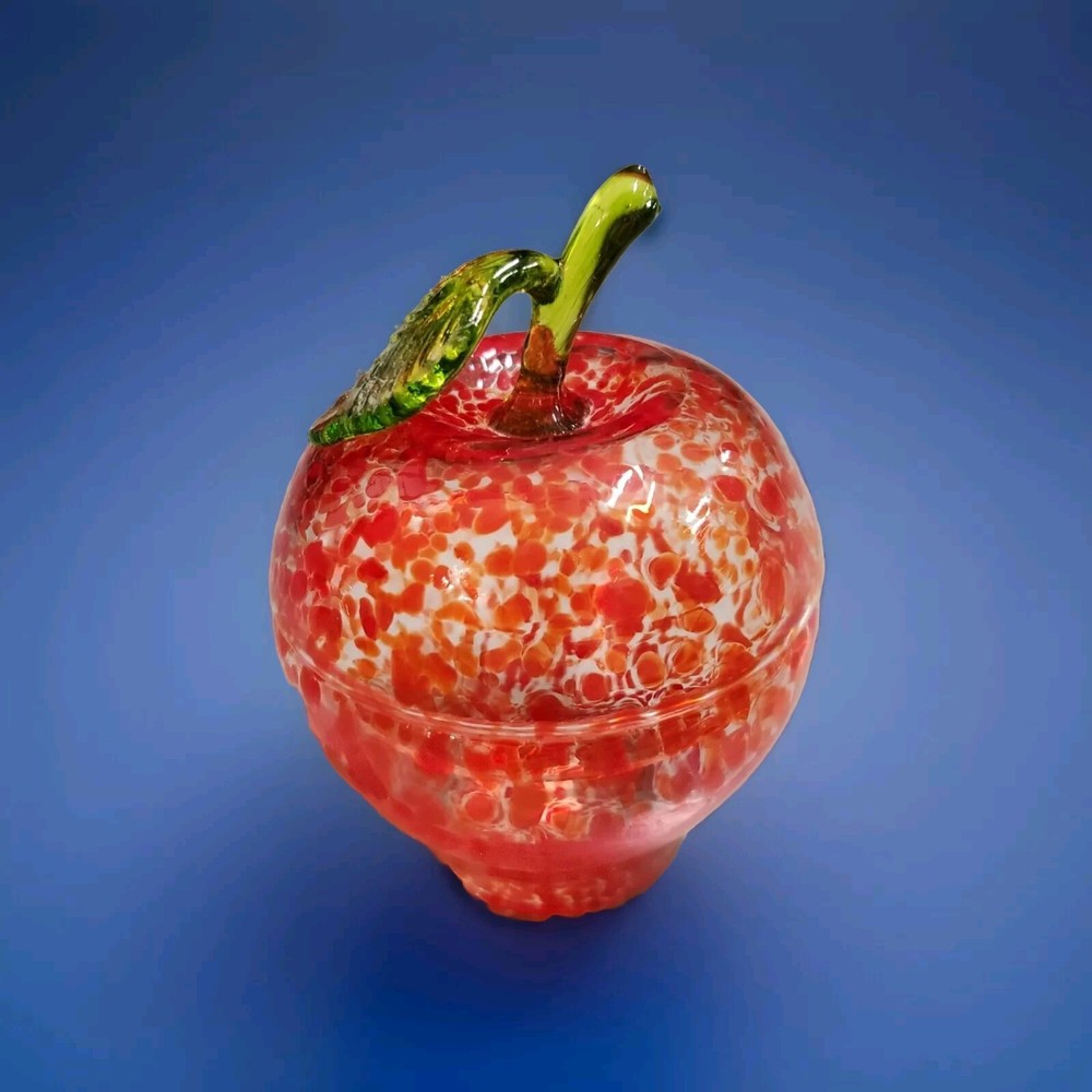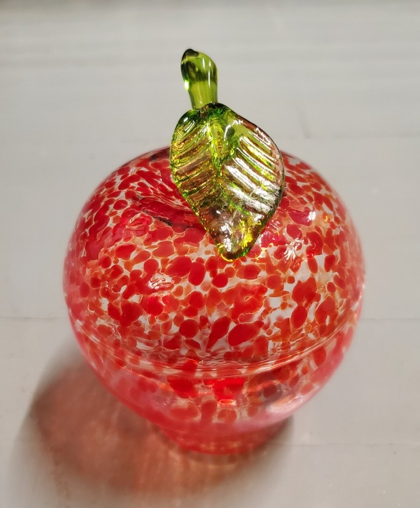 Beautiful, lightweight, quality glass dish. Bowl with lid. The leaf on top does have a repaired break. Not super noticeable unless you know it's there. See all photos prior to purchase! Sold as-is. This beautiful splatter glass apple dish from Romania is sure to add a pop of color to your vanity or dining table. The vibrant red and green stem leaf design is hand blown into a glossy finish, creating a unique and artistic piece. Measuring 3.5 inches in diameter and height, this trinket box is perfect for storing candy, jewelry, or other small items. The removable lid and curved design make it both decorative and functional, while the production technique of hand blown glass adds a touch of artistry to each piece. This item weighs less than 2 pounds and is unmarked, making it a unique addition to any collection.