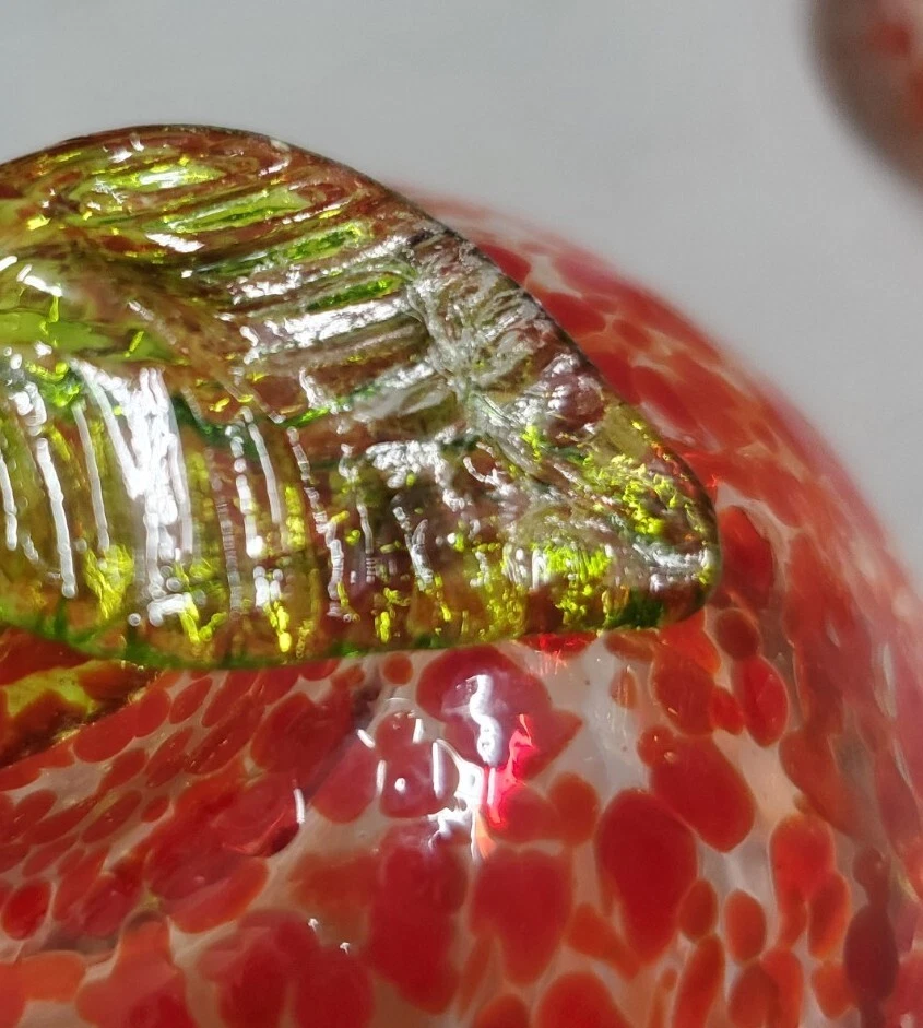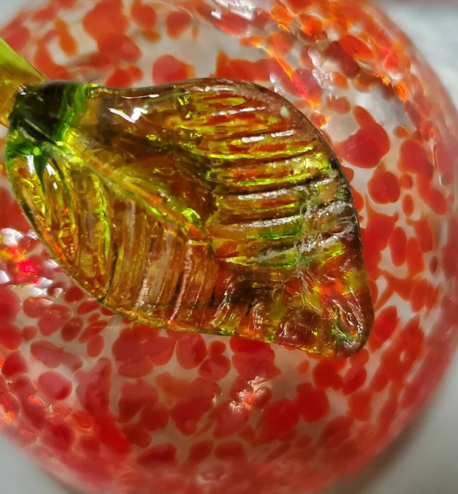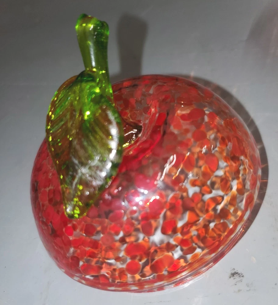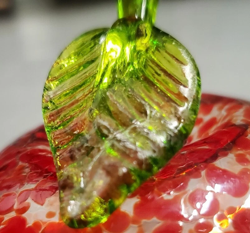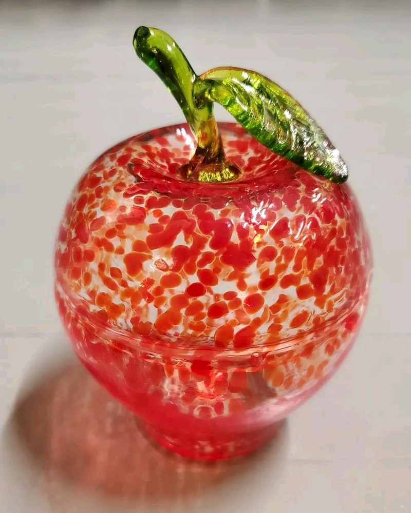 Beautiful, lightweight, quality glass dish. Bowl with lid. The leaf on top does have a repaired break. Not super noticeable unless you know it's there. See all photos prior to purchase! Sold as-is. This beautiful splatter glass apple dish from Romania is sure to add a pop of color to your vanity or dining table. The vibrant red and green stem leaf design is hand blown into a glossy finish, creating a unique and artistic piece. Measuring 3.5 inches in diameter and height, this trinket box is perfect for storing candy, jewelry, or other small items. The removable lid and curved design make it both decorative and functional, while the production technique of hand blown glass adds a touch of artistry to each piece. This item weighs less than 2 pounds and is unmarked, making it a unique addition to any collection.