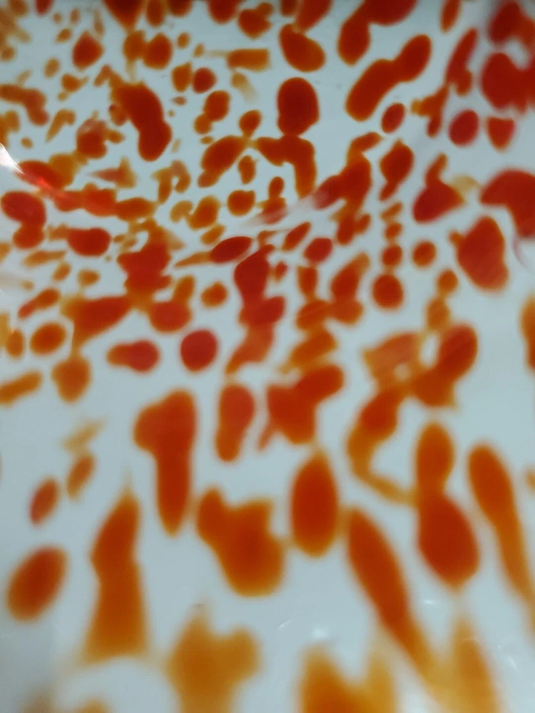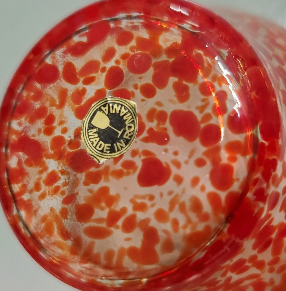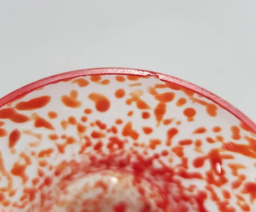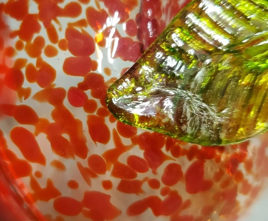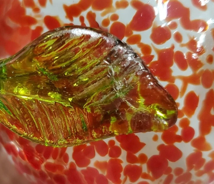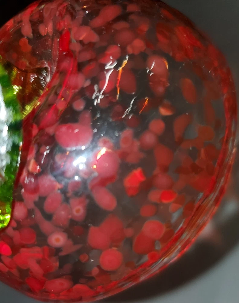 Beautiful, lightweight, quality glass dish. Bowl with lid. The leaf on top does have a repaired break. Not super noticeable unless you know it's there. See all photos prior to purchase! Sold as-is. This beautiful splatter glass apple dish from Romania is sure to add a pop of color to your vanity or dining table. The vibrant red and green stem leaf design is hand blown into a glossy finish, creating a unique and artistic piece. Measuring 3.5 inches in diameter and height, this trinket box is perfect for storing candy, jewelry, or other small items. The removable lid and curved design make it both decorative and functional, while the production technique of hand blown glass adds a touch of artistry to each piece. This item weighs less than 2 pounds and is unmarked, making it a unique addition to any collection.