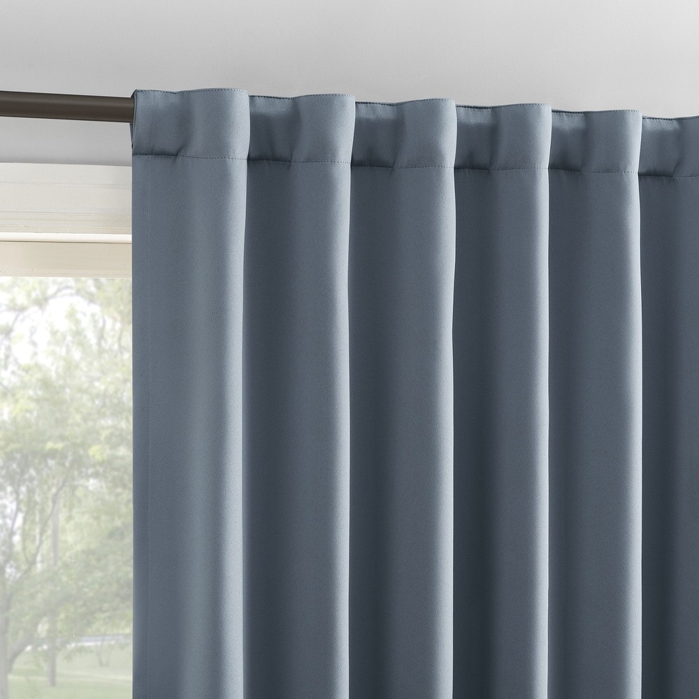 Product details Sun Zero Aria Curtain Panel Pairs provide the ultimate in light blocking technology coupled with magnetic closures to keep out even the harshest of light while bringing an elegant urban sophistication to any room of your home. Sun Zero Extreme Blackout technology is laboratory tested to block out 100% of light, reduce outside noise by up to 45%, and decrease energy lost through your windows by up to 50%. Comfort is optimized with thermal properties that help keep summer heat and winter chill out of your home. Hidden back tabs allow for easy slide-through installation on curtain rods up to 1.5" in diameter. Hang in your entertainment room to eliminate screen glare and reduce distracting outside noise, or in your bedroom for enhanced privacy and a sounder, more uninterrupted sleep. Pair includes 2 panels measuring 104" width by 84" length. Measure carefully before selecting your desired size and quantity. Machine wash cold on gentle cycle. Use non-chlorine bleach when needed. Tumble dry on low heat, using a cool iron as needed. Extreme Blackout technology with magnetic closure blocks out 100 percent of outside light Energy Efficient design reduces energy lost through your windows by up to 50 percent Thermal properties help keep summer heat and winter chill out of your home Noise reduction by up to 45 percent helps you get a sounder, more uninterrupted sleep Hidden back tabs fit curtain rods up to 1.5" in diameter Pair includes two (2) panels measuring 52" w each. Measure carefully prior to purchase. Curtain rod not included. Double rod may be needed for layering.