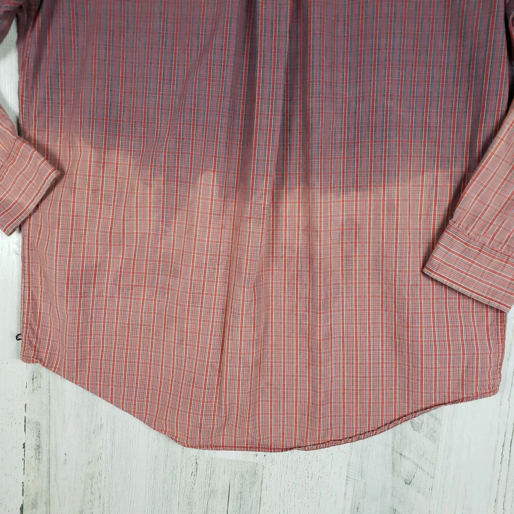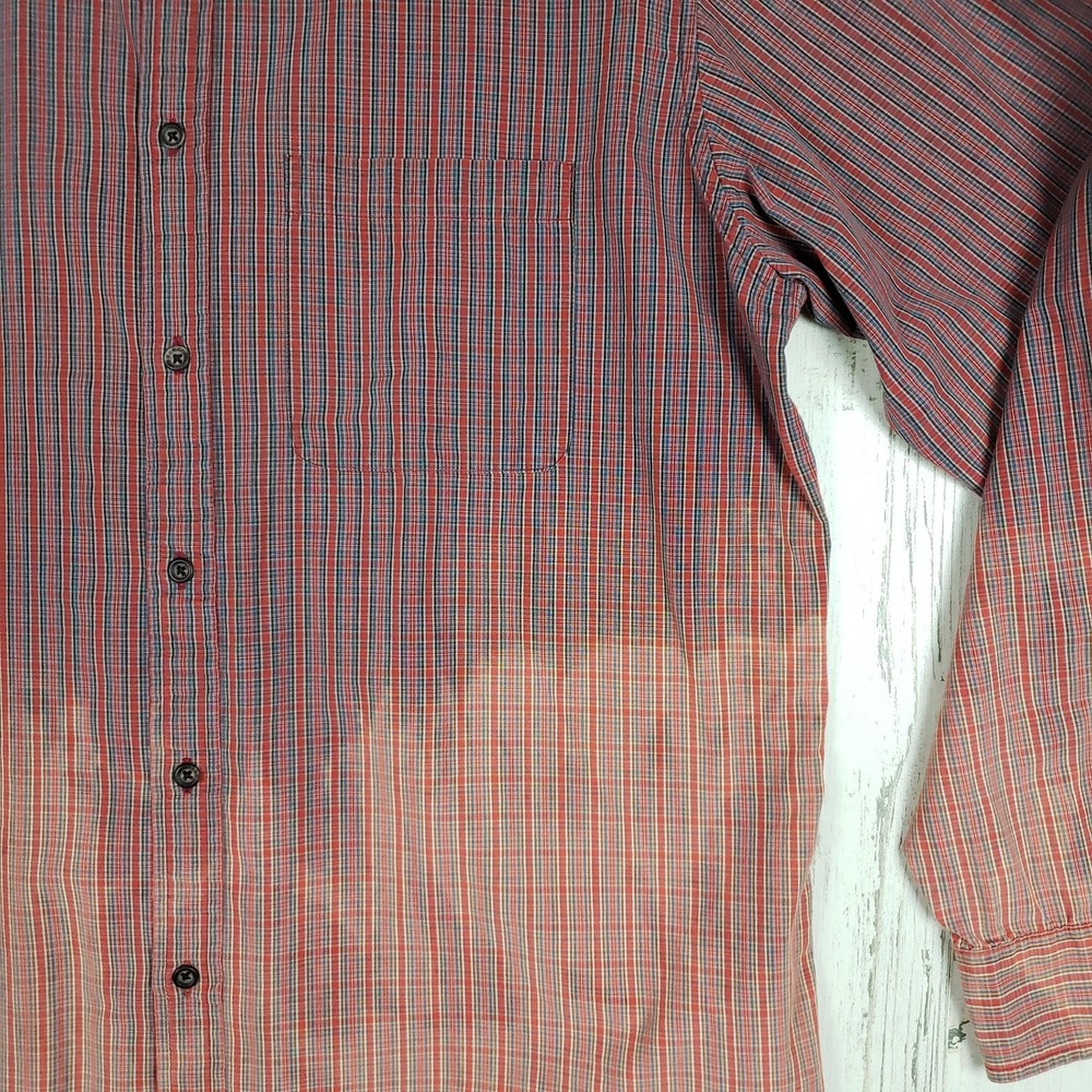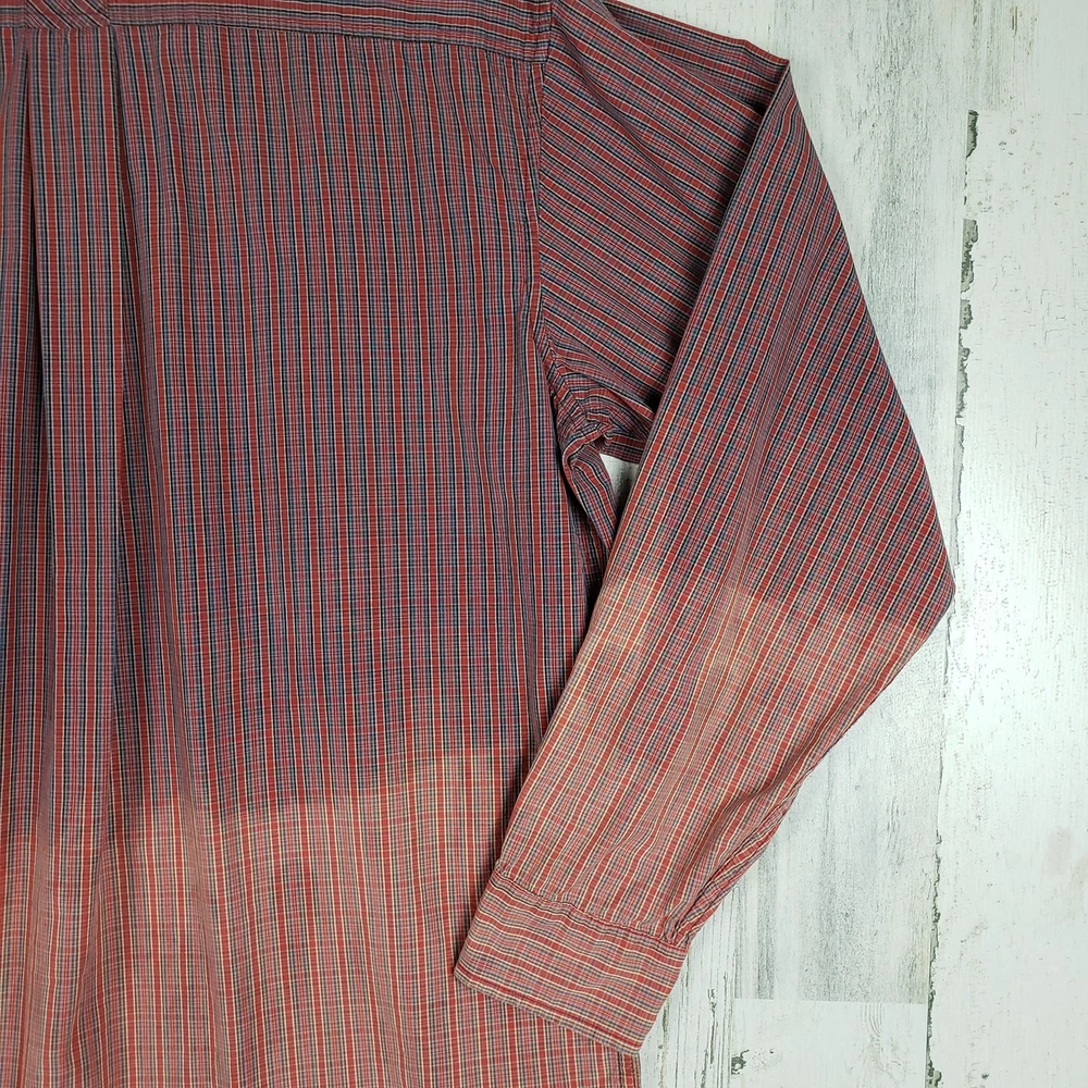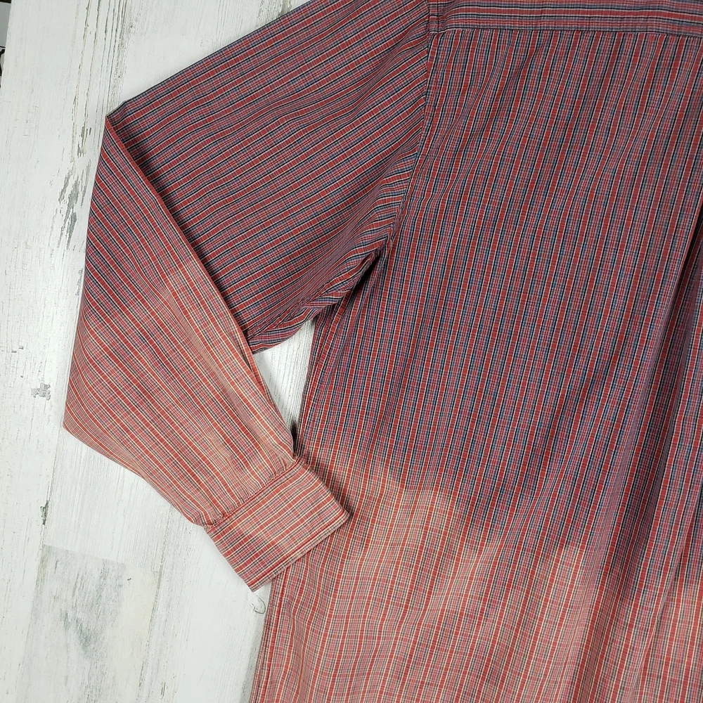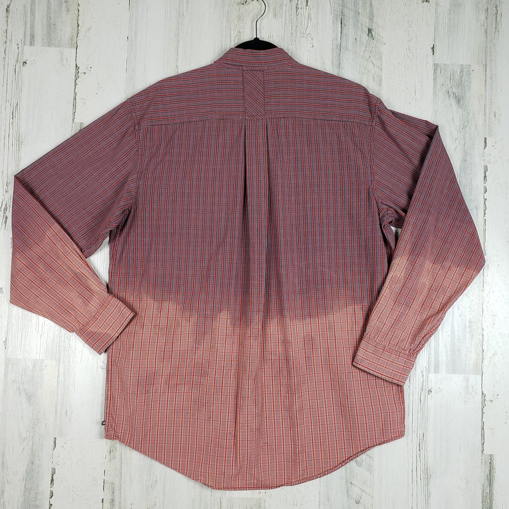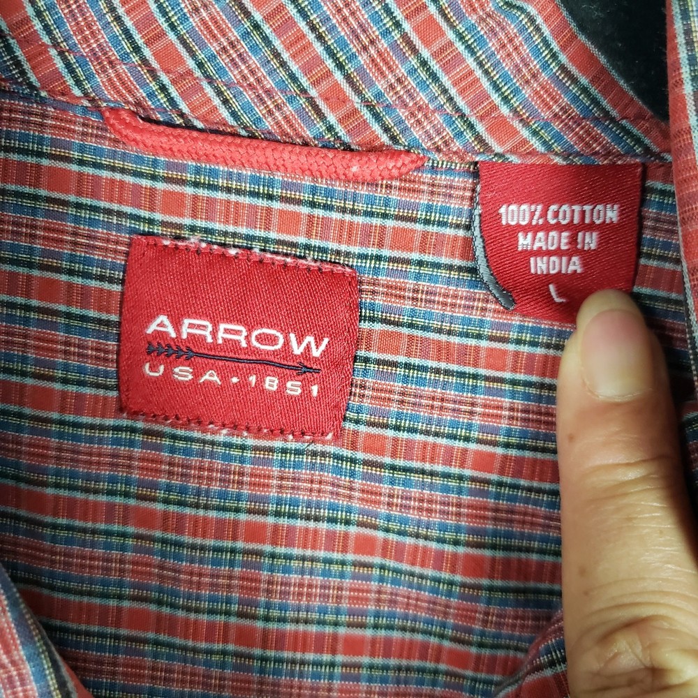 <![CDATA[<div>Arrow Dip-Dye Long Sleeve Red & Blue Plaid Shirt Men’s Size Large Bleach ombre dip style tie dye Primarily red & blue plaid Long sleeve w/ buttoned cuffs Collared Button front closure Chest pocket Excellent condition 100% Cotton Chest: 24” Length: 31.5” Sleeve: 25” AP-1201