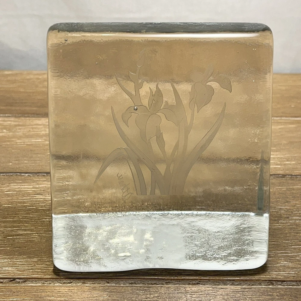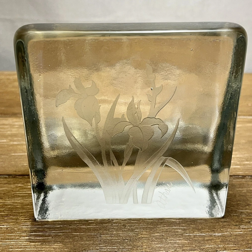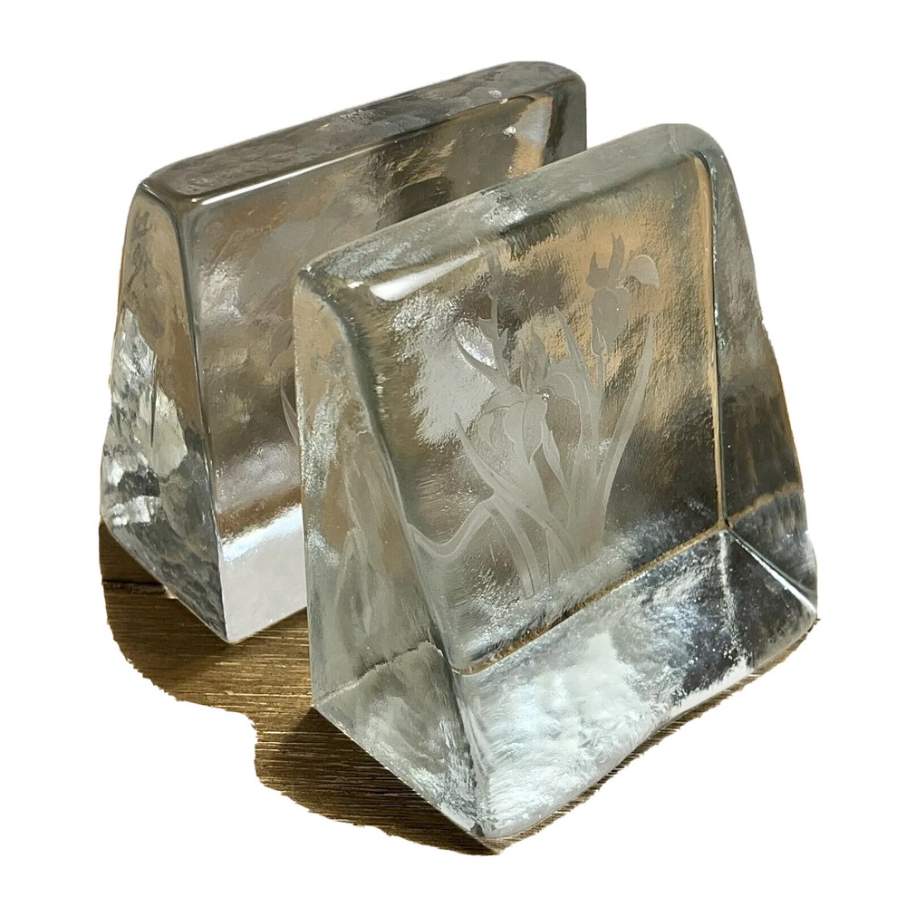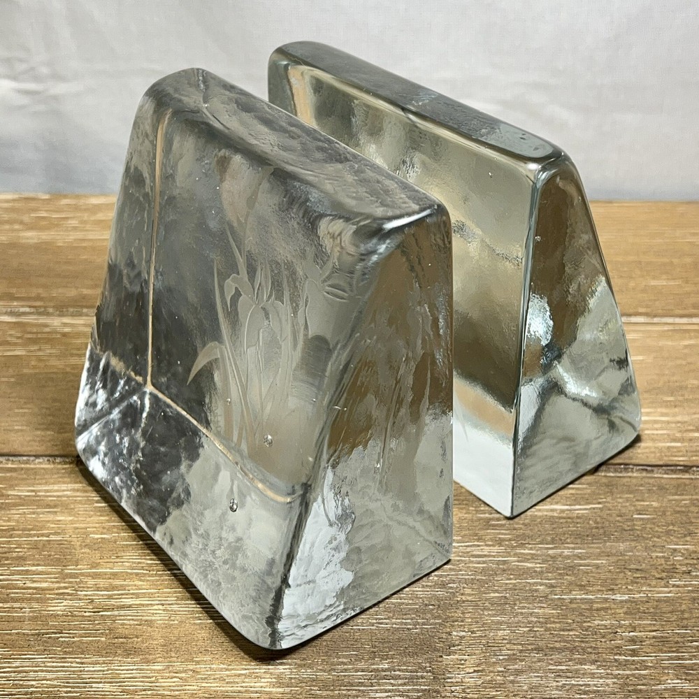 RARE Shawn Athari Signed Studio Art Glass Bookends Handcrafted Iris Design. Artist Shawn Athari is a celebrated glass sculptor who is known for her expertise and artistry with combining and designing glass. She is usually known for her amazing masks and panes she has done for many different public buildings. Featured here are some rare glass bookends. They are handmade, you can see a few bubbles inside each and there is a beautiful iris flower on each. Both are signed by etching "Athari." They weigh 2 lbs 5 oz. (each one). They have a contemporary wedge style. They are in near perfect condition--see photos--no chips or cracks!