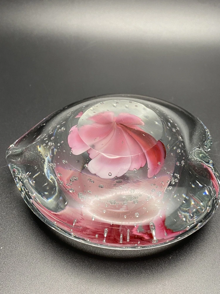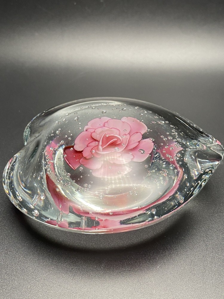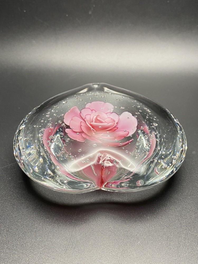 Please see photos for details of color and condition. 4” heart shaped art glass paperweight with controlled bubbles. No chips or cracks. Unsigned.