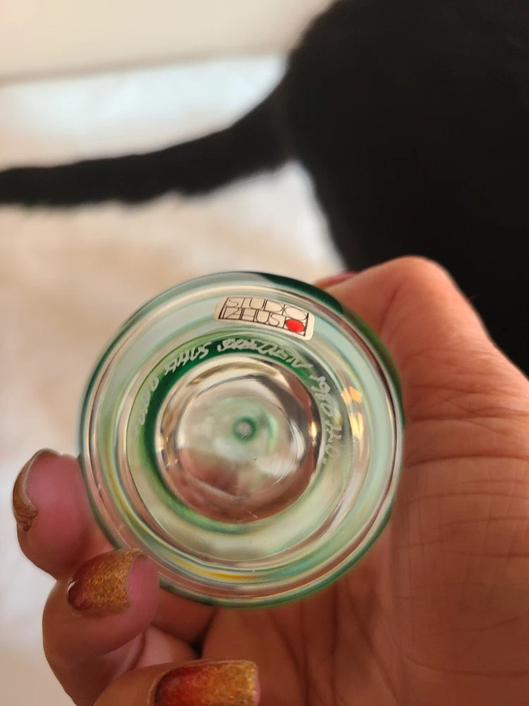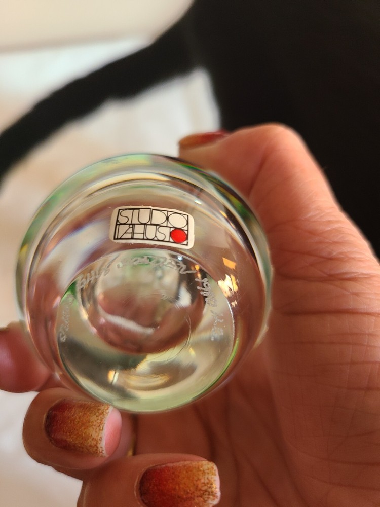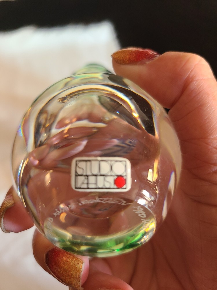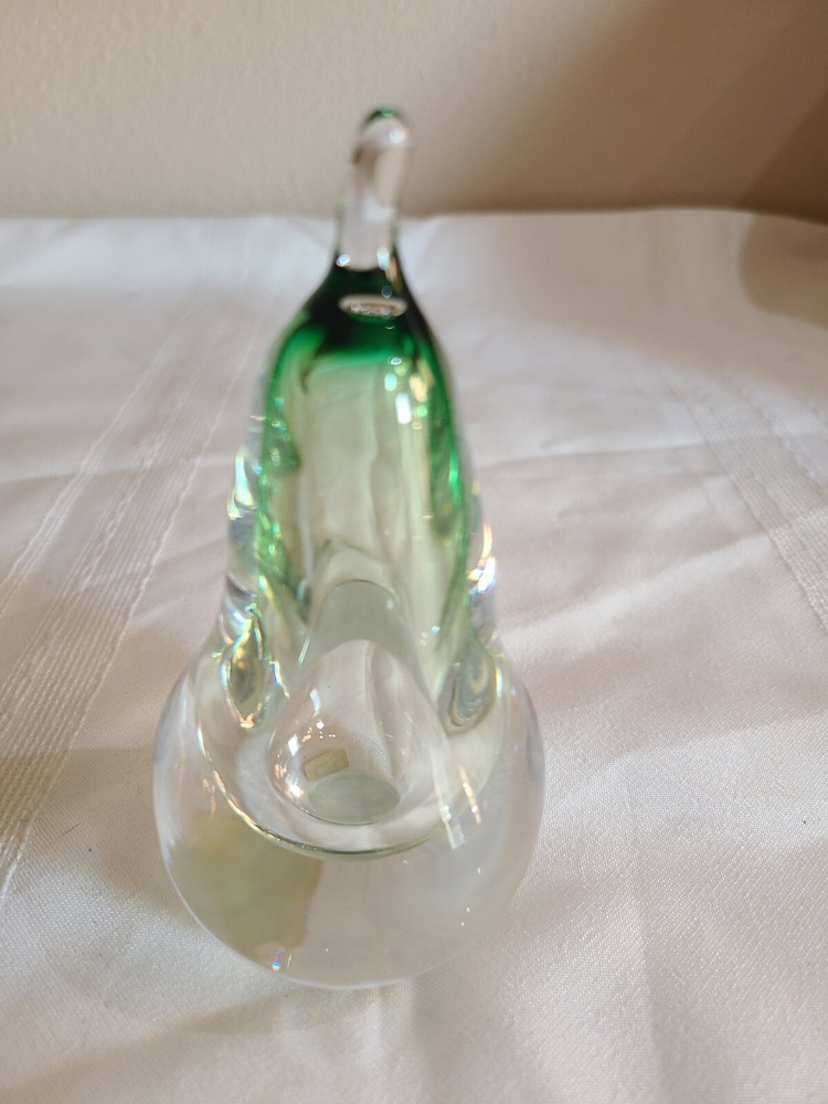 Art Glass Pear Paperweight by Studio Ahus Sweden, Clear + Green, Signed....