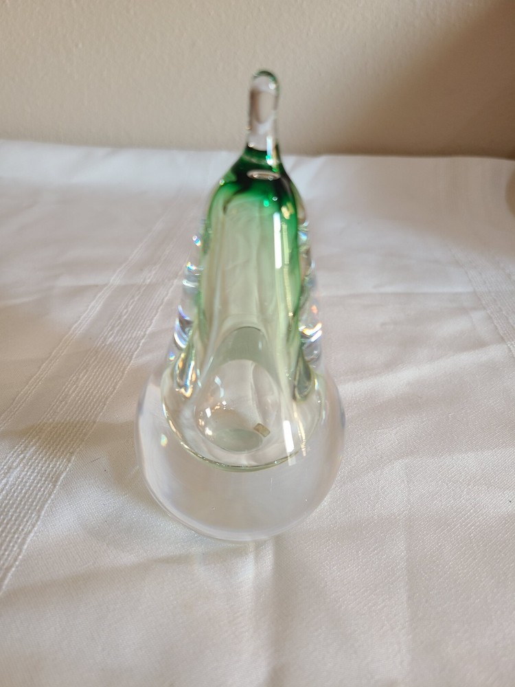 Art Glass Pear Paperweight by Studio Ahus Sweden, Clear + Green, Signed.