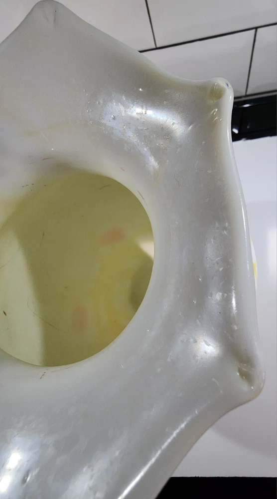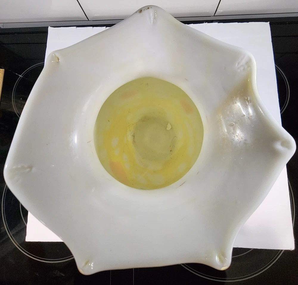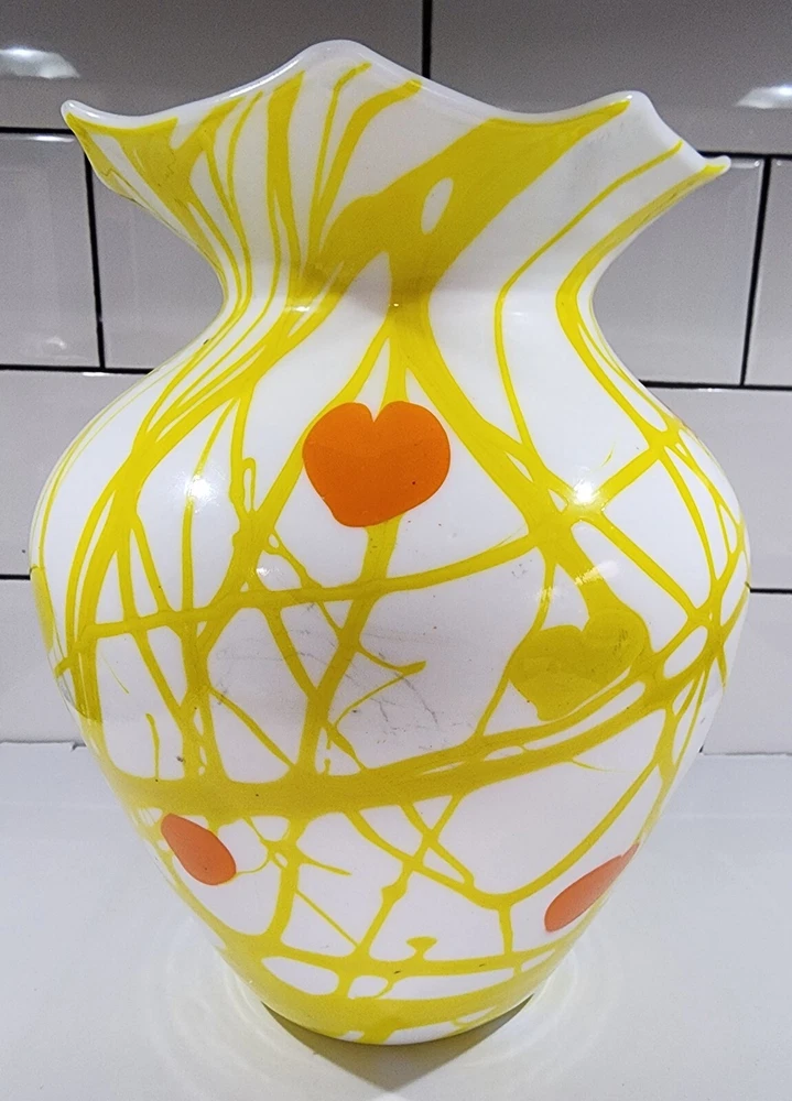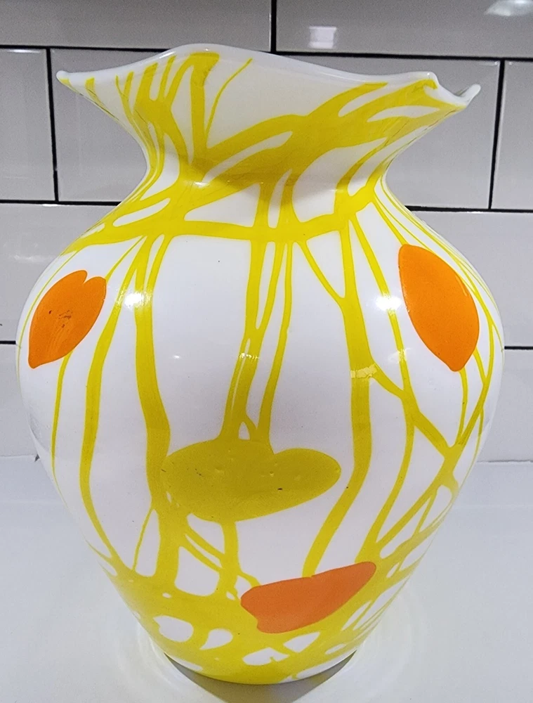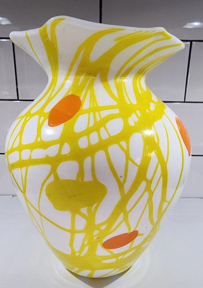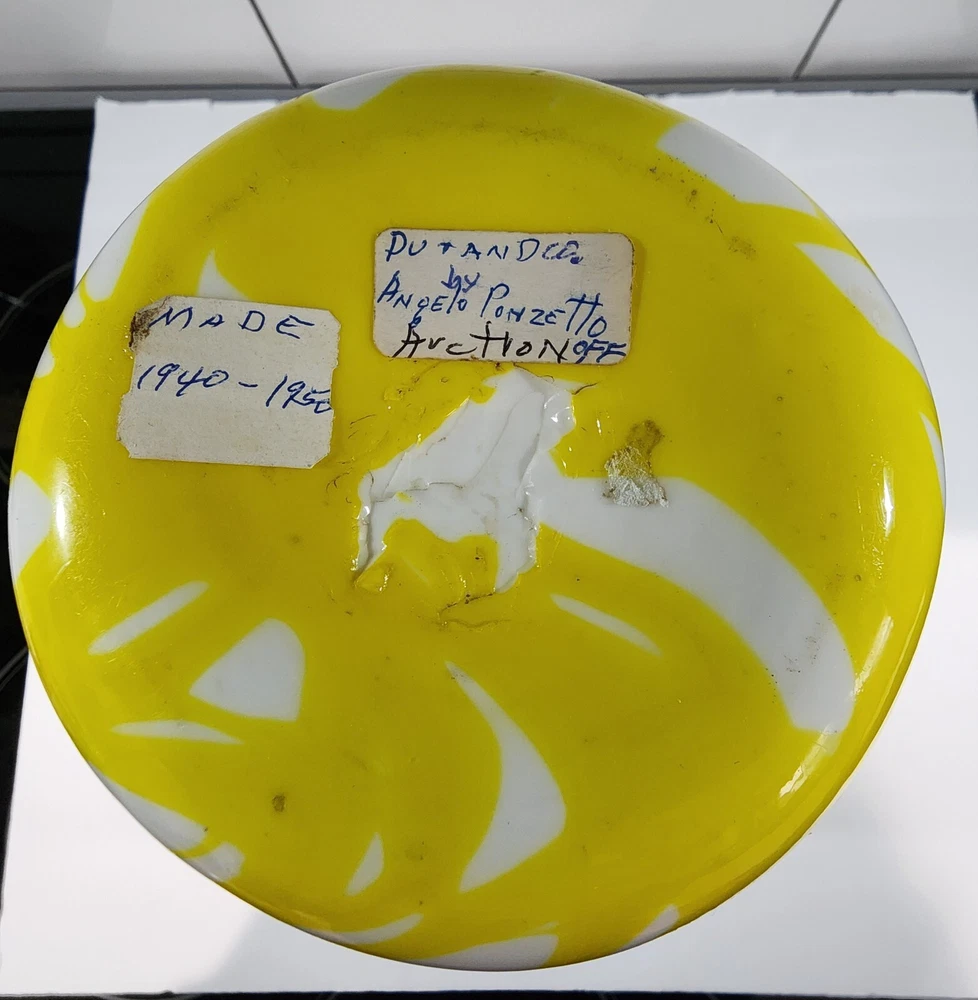 This is a hand blown vase by Angello Ponzetto, who worked for Durand glass in millville, NJ. Made sometime between 1940-1950, According to stickers of bottom. It is white with yellow and orange abstract wrapped around. This is a one of a kind and would look amazing in any MCM decor. Please ask any questions.