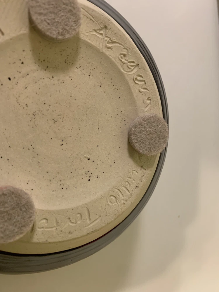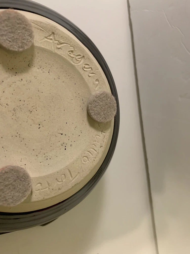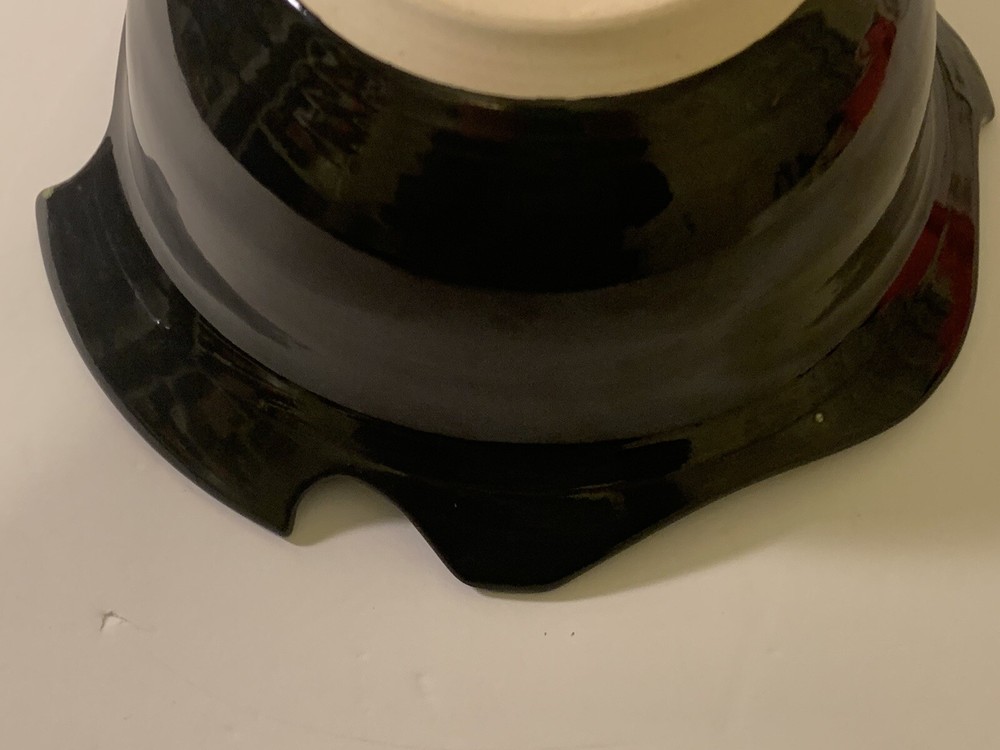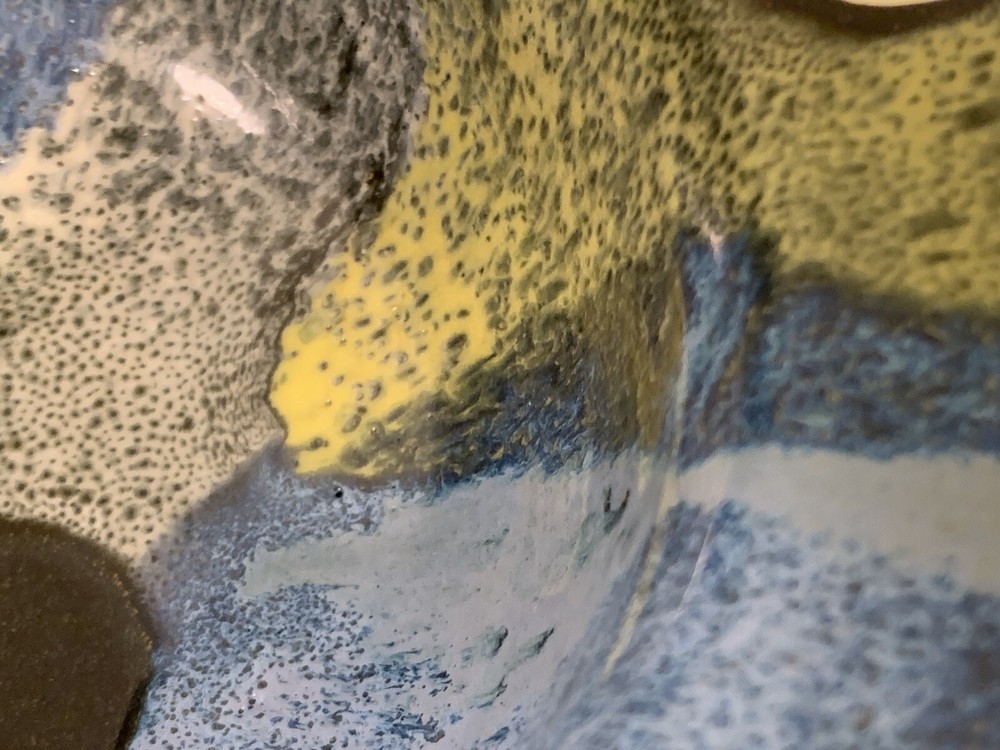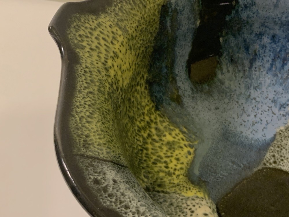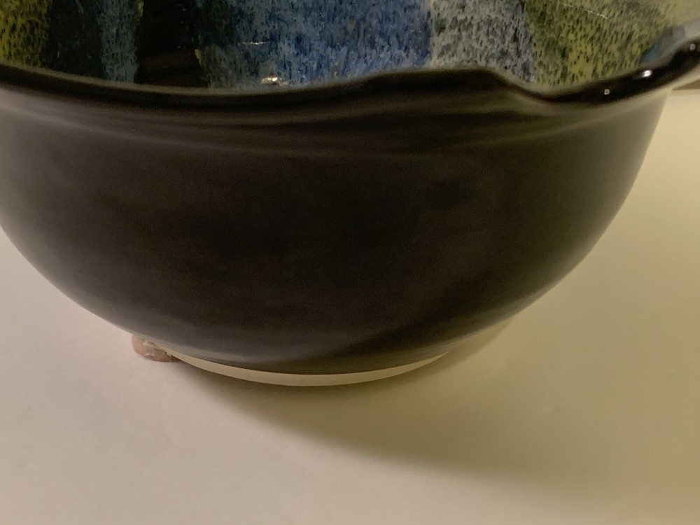 Art Pottery Fish Bowl. Signed Aragorn Studio Tortola BVI. Excellent Pre-Owned Condition. 3 felt surface protectors on bottom. Black exterior and rim with blues, white, black, and yellow interior. Indented fisheye. Weighs 2lb 7oz. Measures approximately: 9" x 8.5". Sits 3.75" high. Base 4". No chips or cracks. Any surface "imperfections" are part of the natural pottery/glaze. Very lovely bowl. I ship fast and wrap carefully. 30-day return policy if not satisfied. (SKU875ST)