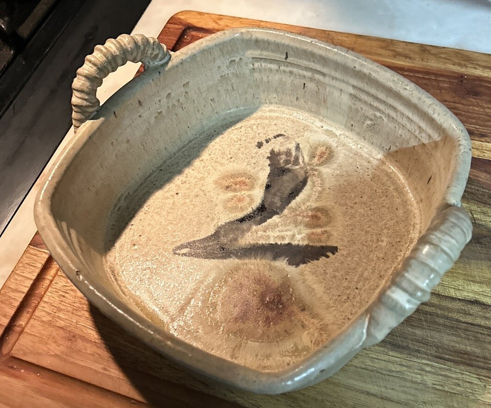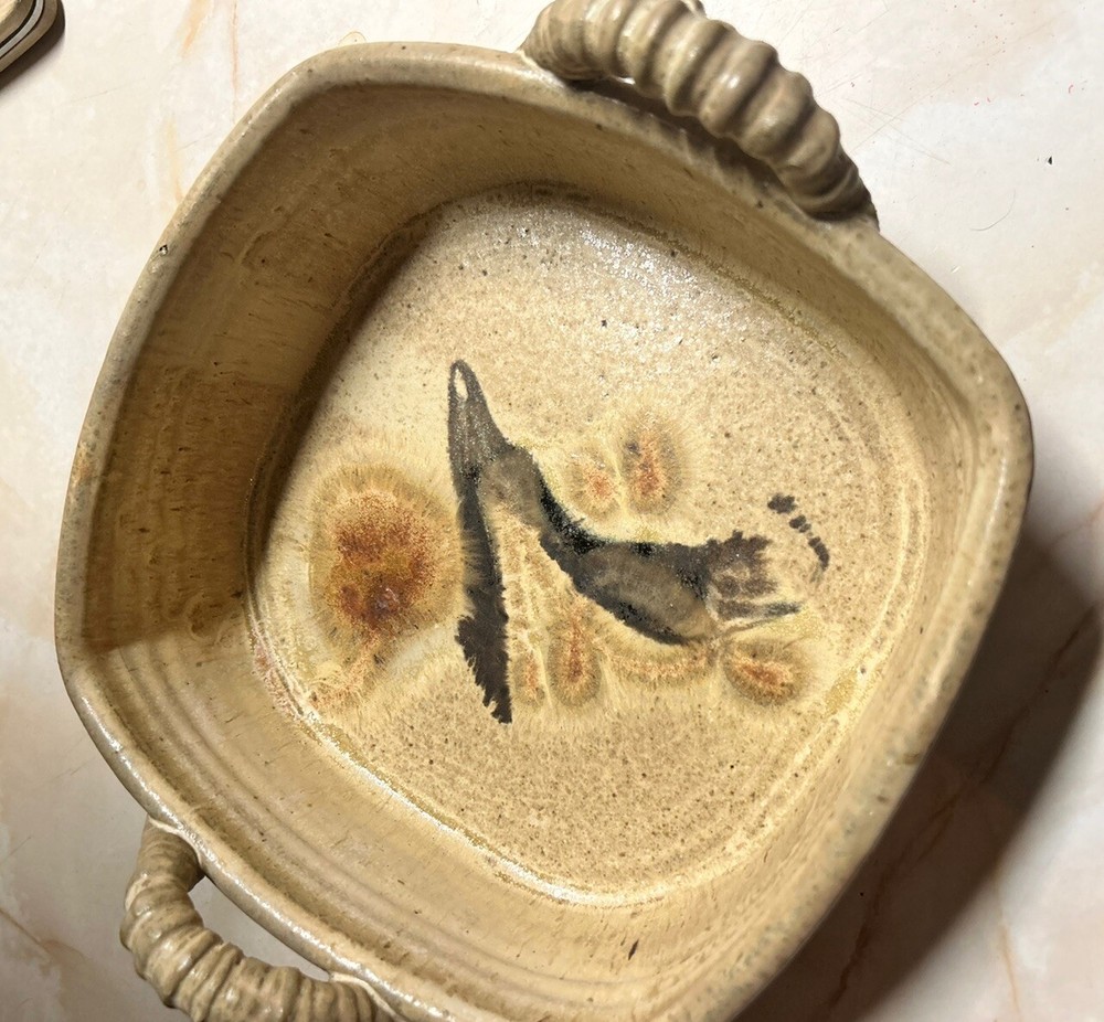 Art Pottery Sq Ceramic Bowl Vintage Preowned Wheat Color With Black Design