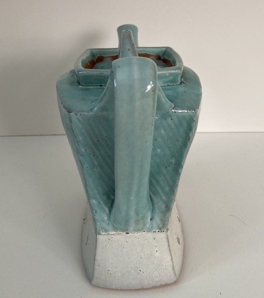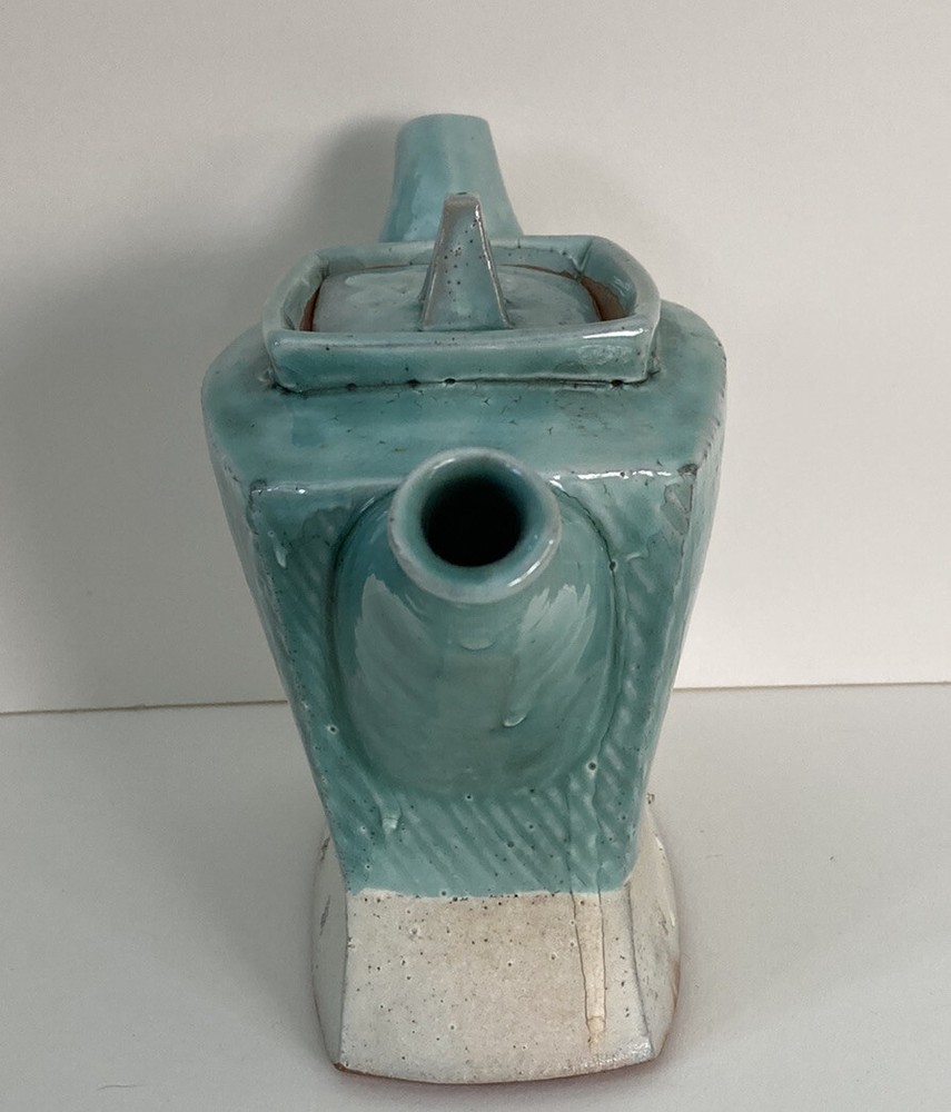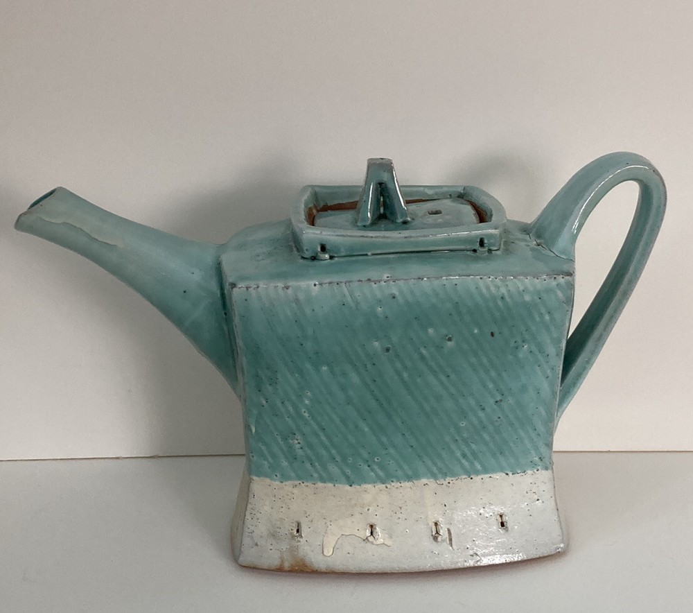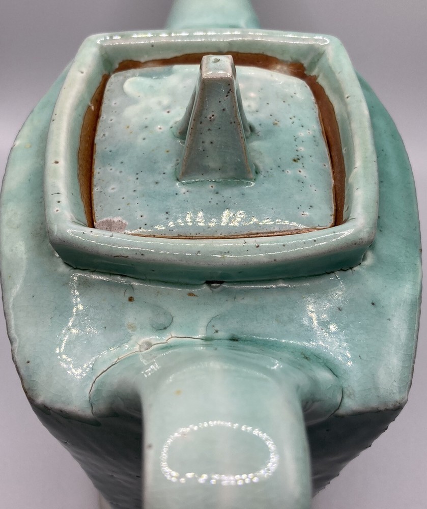 Studio Art Pottery Teapot Made By Composite Clay Studio Signed. There is a chip on top of the lid and a larger on on the underneath side of the lid. There are cracks in the glaze where one piece joins another on the teapot. Please see photos.