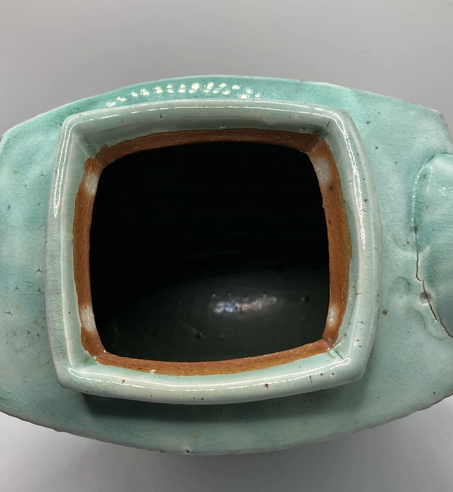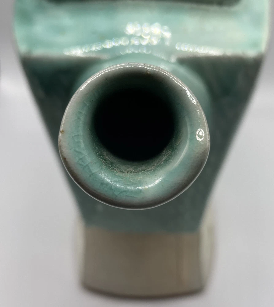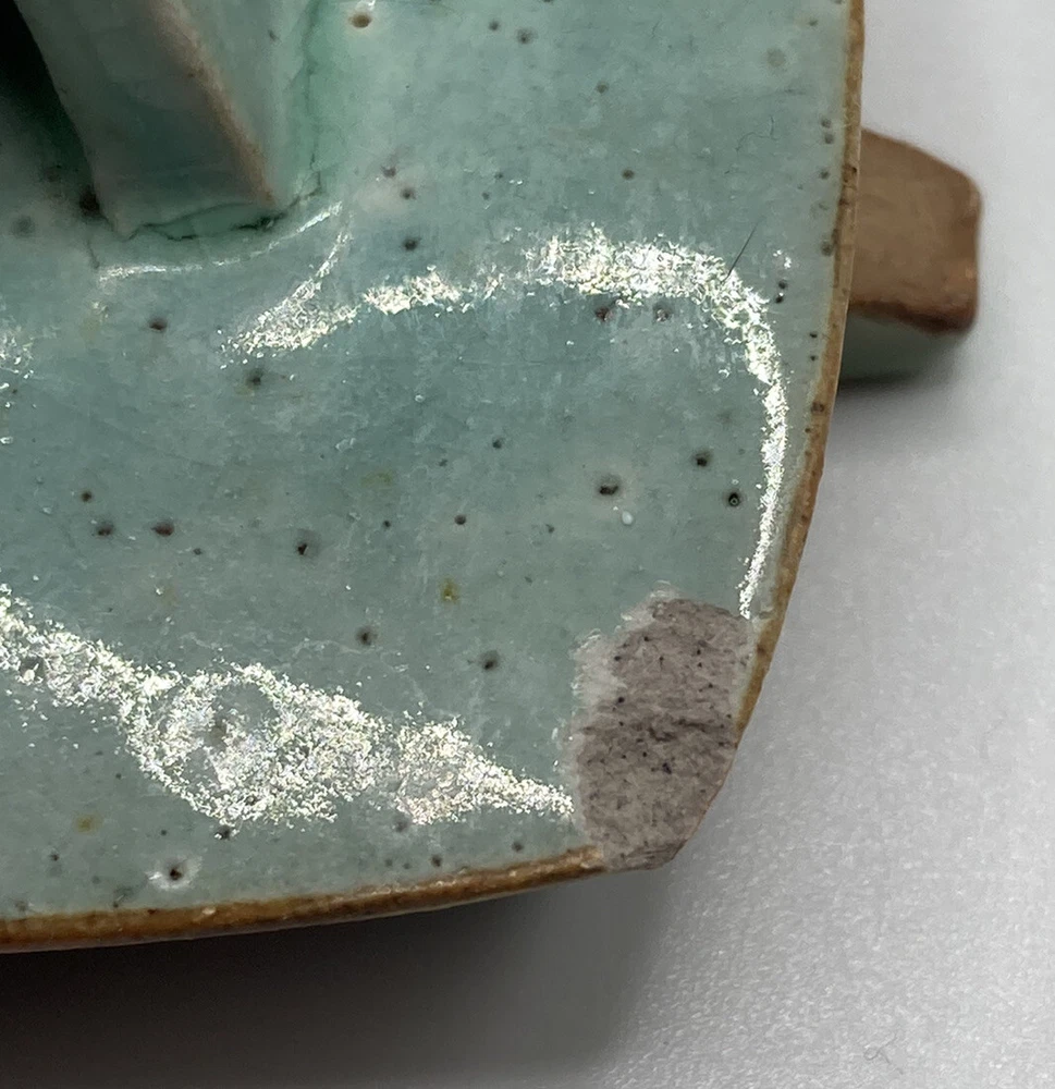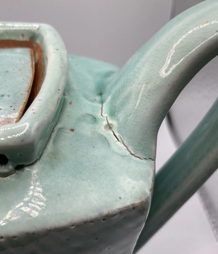 Studio Art Pottery Teapot Made By Composite Clay Studio Signed. There is a chip on top of the lid and a larger on on the underneath side of the lid. There are cracks in the glaze where one piece joins another on the teapot. Please see photos.