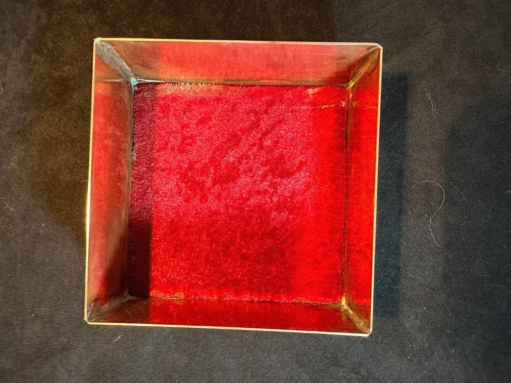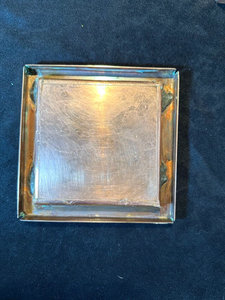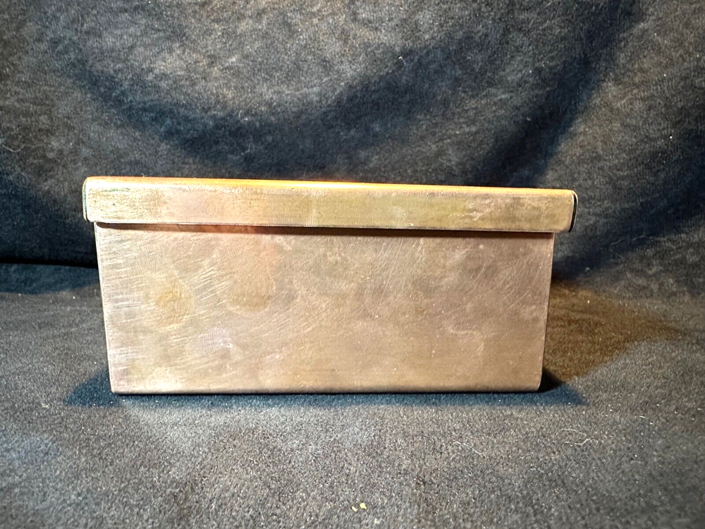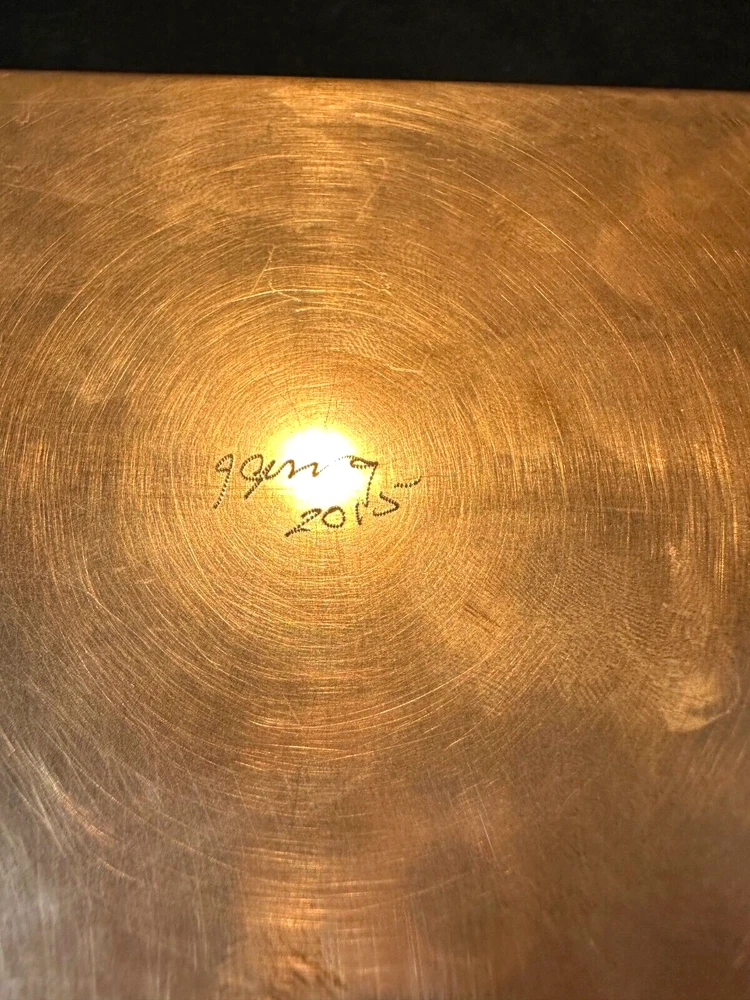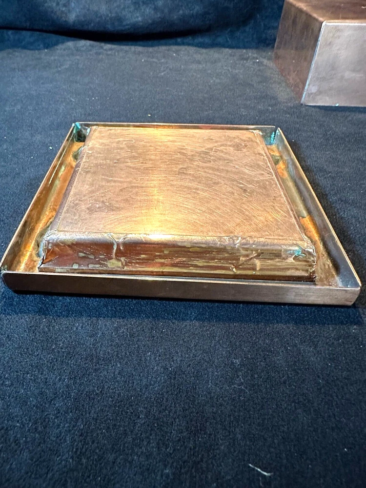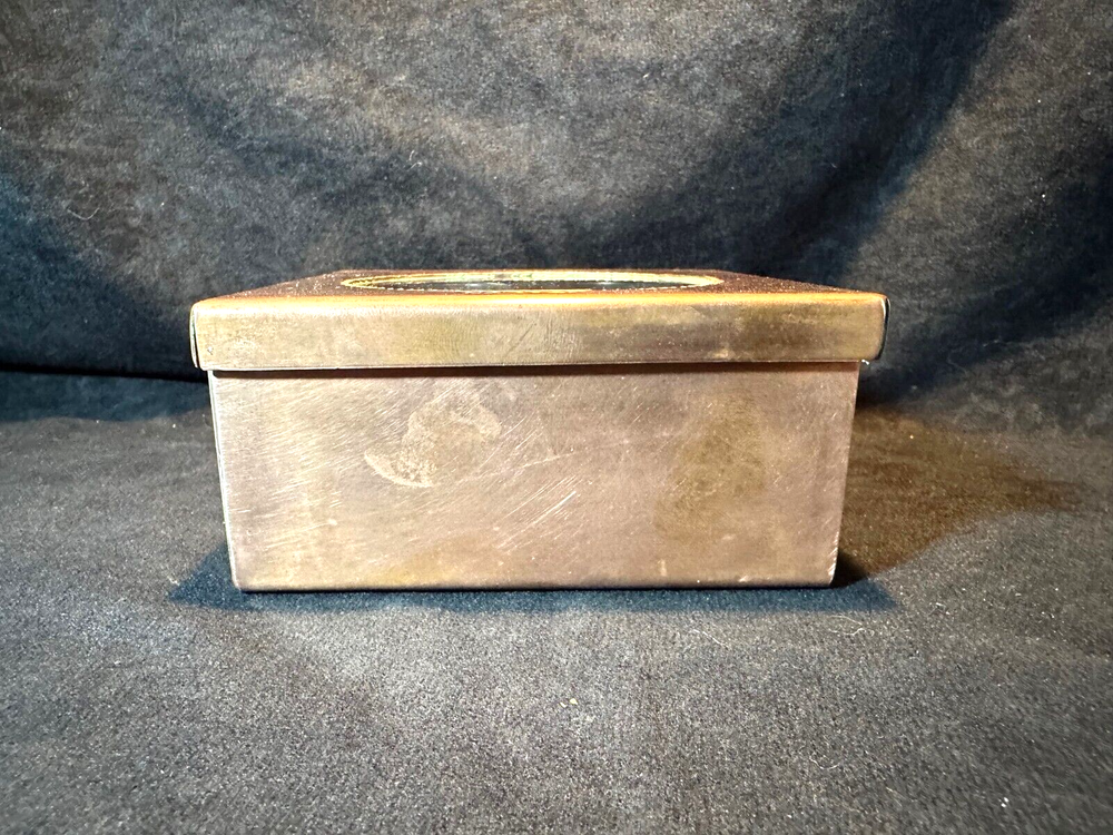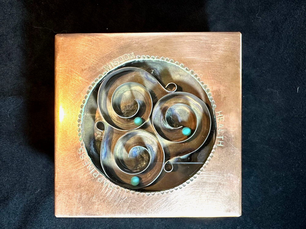 Art Studio Crafted Copper Jewelry Trinket Box Puzzle Top Artist Signed J Gung This is a very unique trinket box in excellent condition with only light scratching from age and use. It's made of solid copper that has been formed and welded into a box. The lid has a glass panel to show the swirl puzzle with turquoise colored beads. The words Happiness, Wisdom and Health are embossed around the window. Supposedly if you can all the beads in the center of the swirls you will achieve all those. The interior has a red velvet lining. It's 2 1/4" high and 4 1/2" square. The artist J Gung (I think) and the year 2015 are inscribed on the bottom. See Pics.
