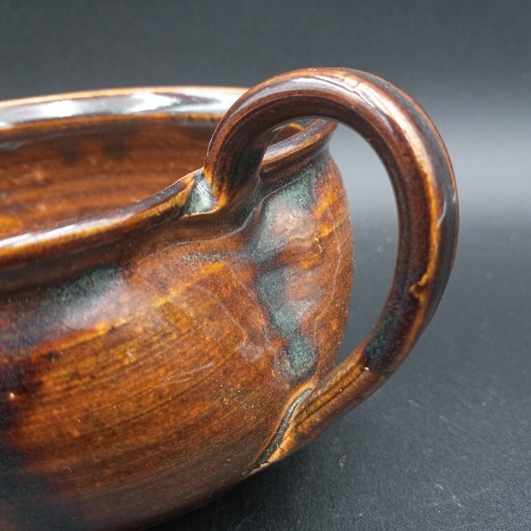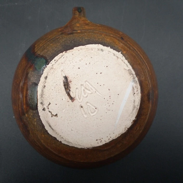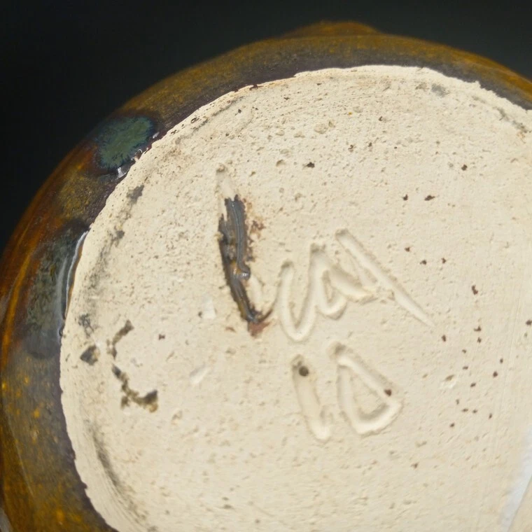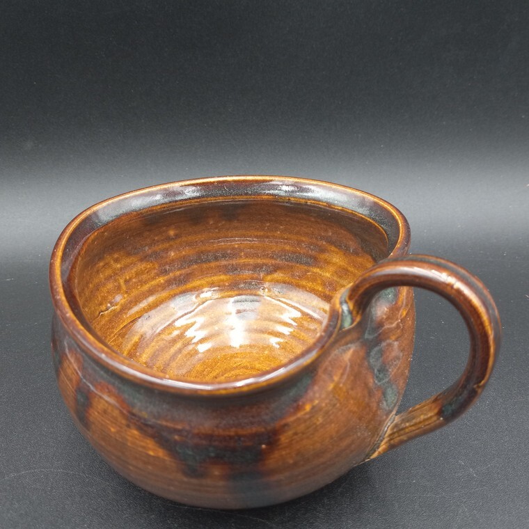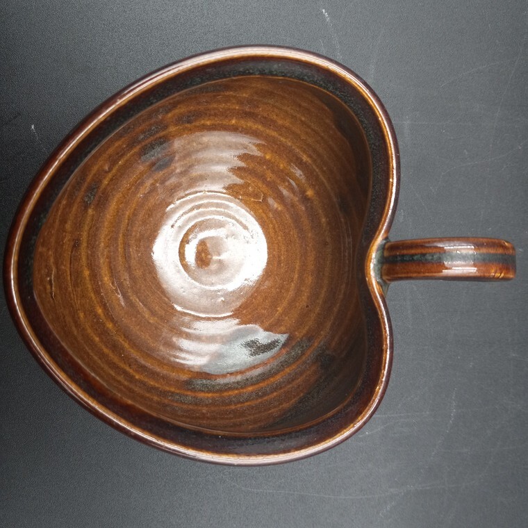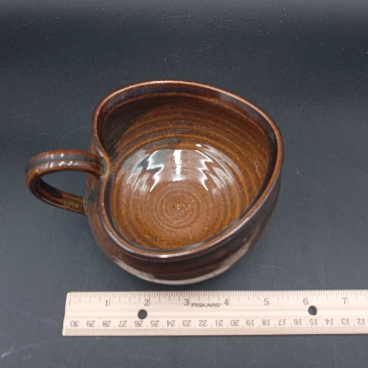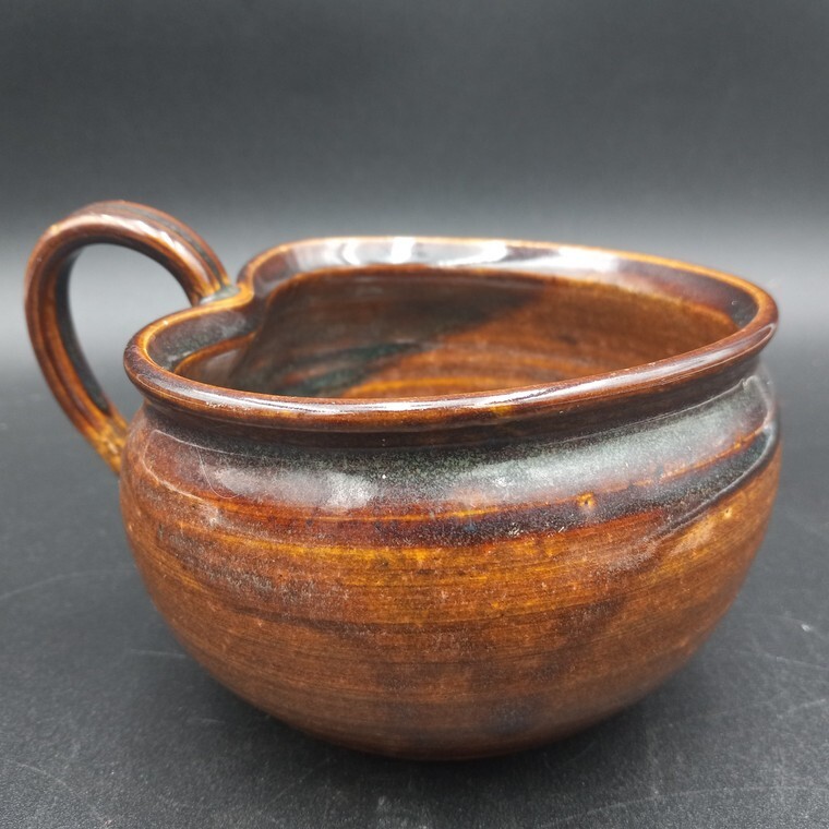 Add a touch of country charm to your table setting with this handmade stoneware soup bowl. Crafted with care by an artisan, this heart-shaped bowl features a beautiful brown drip glaze finish. Measuring 5.5 inches in length and 4.5 inches in width, it fits nicely in your hands and is the perfect size for a hearty serving of soup or stew. This beautiful bowl is in excellent condition with no chips or cracks. It has an incised signature on the bottom but I could not decipher the writing.