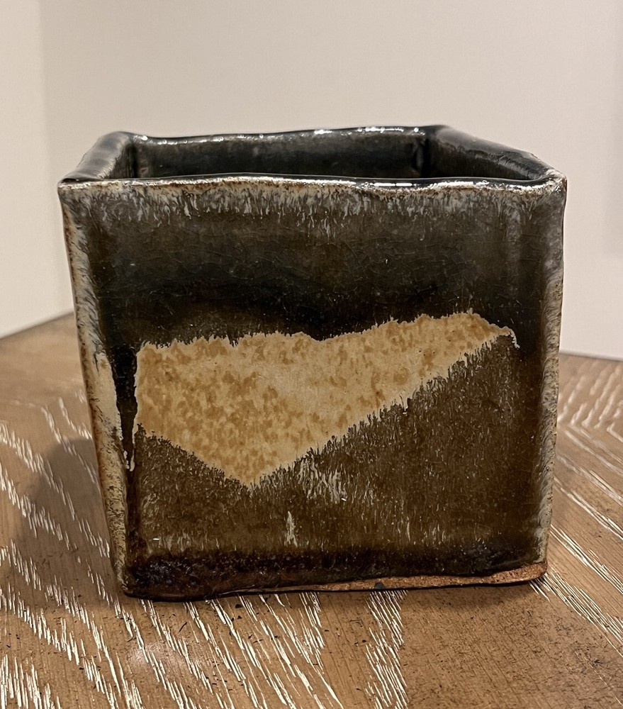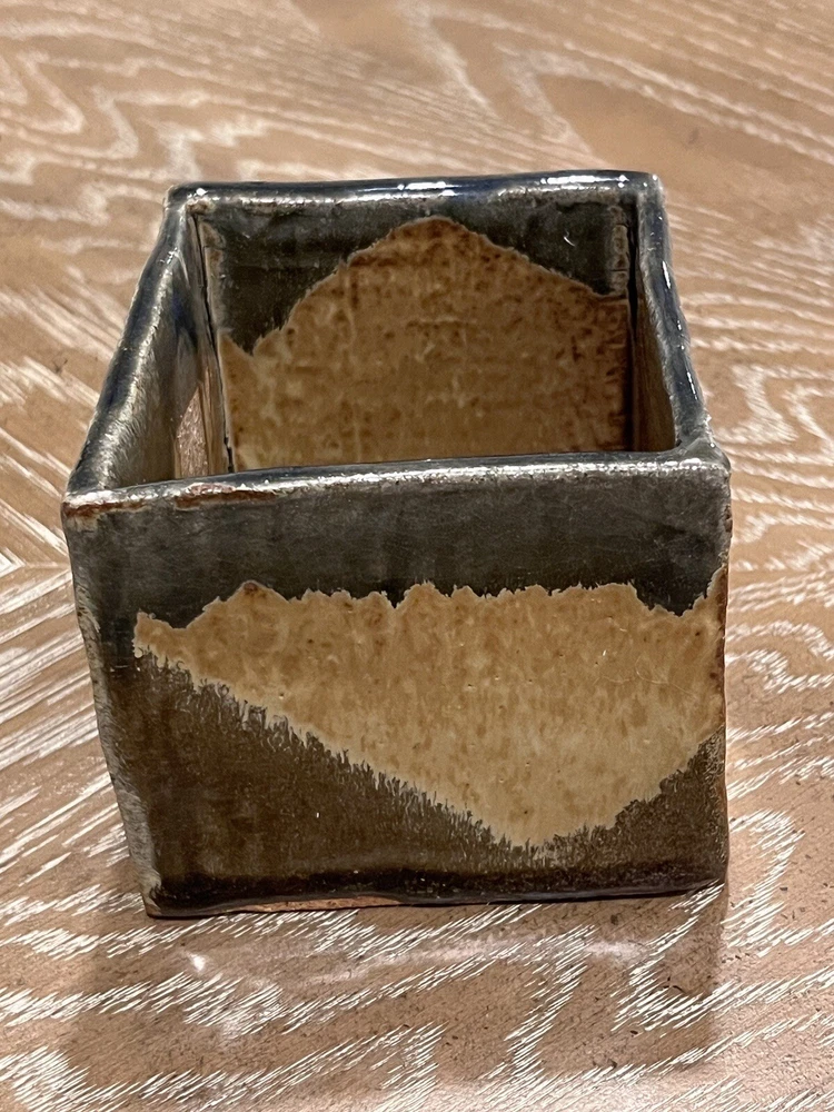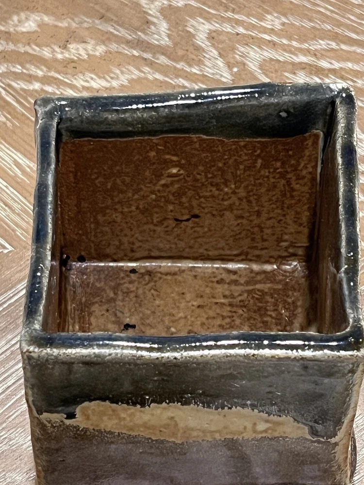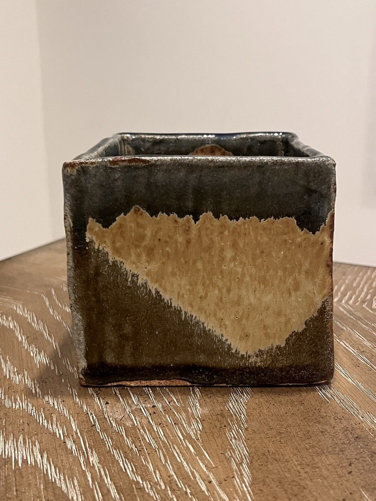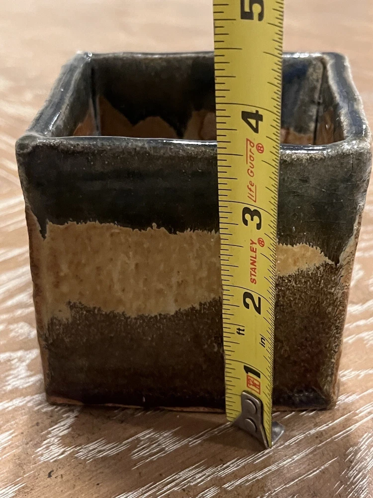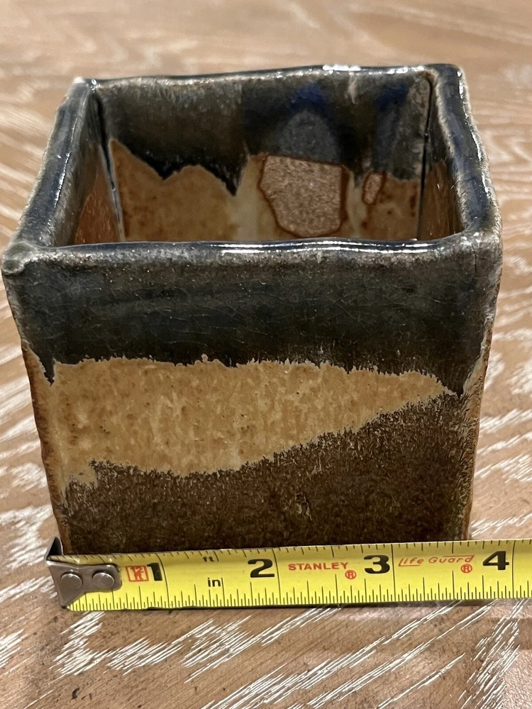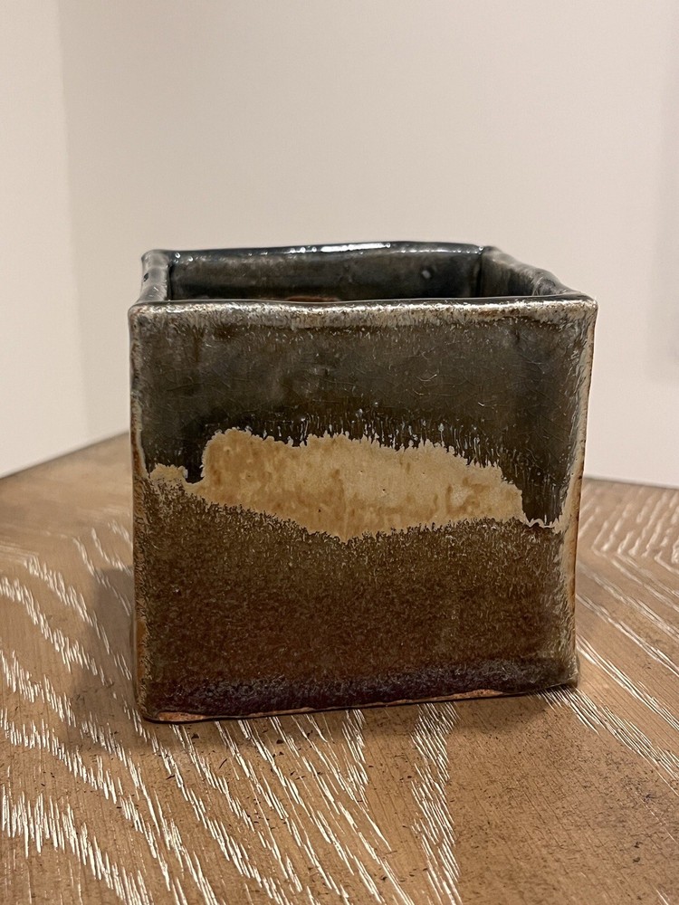 Art Studio Pottery Uneven Square Cube Pot Planter Vase Earth Tones Postmodern Signature not legible Nice used condition