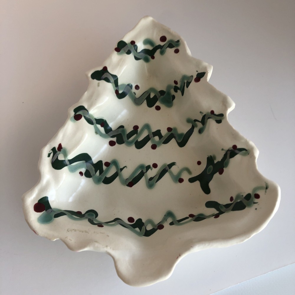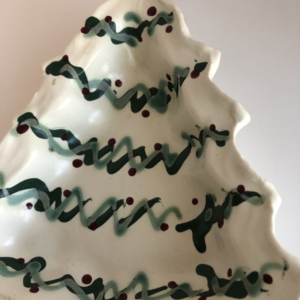 Christmas tree shaped pottery dish Signed by artist Please see photos Very good condition with no damage Measures: 9” long 7 1/2” wide 1 1/2” deep...
