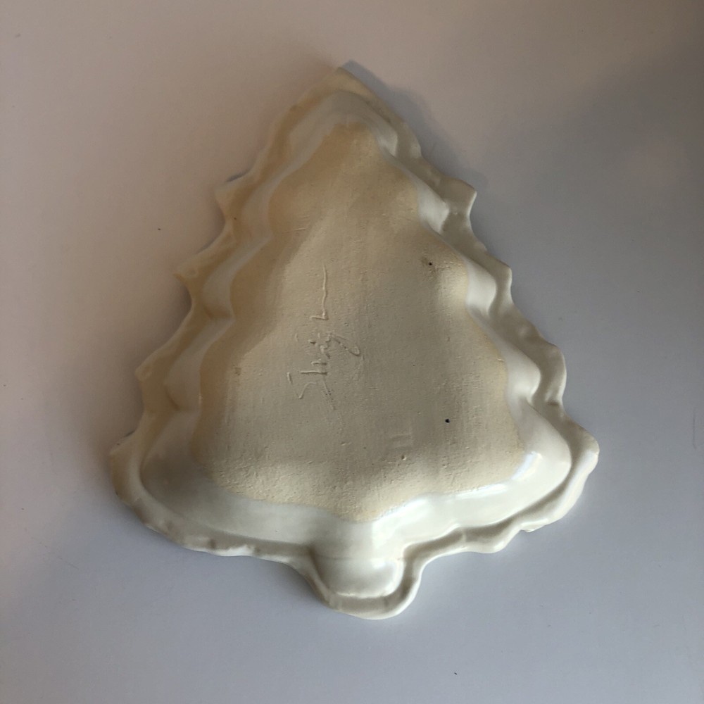 Christmas tree shaped pottery dish Signed by artist Please see photos Very good condition with no damage Measures: 9” long 7 1/2” wide 1 1/2” deep