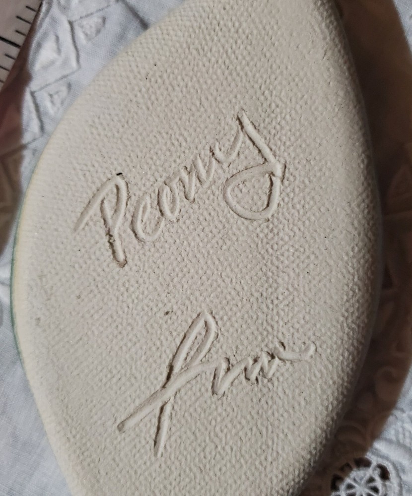 Pottery Leaf Trinket Dish Signed By Artist Shades of blue green beige. Imprint of leaf inside. Beautiful. Not dated....