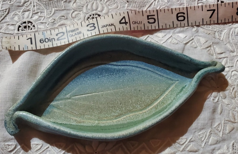 Pottery Leaf Trinket Dish Signed By Artist Shades of blue green beige. Imprint of leaf inside. Beautiful. Not dated.