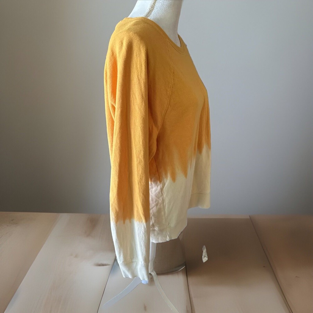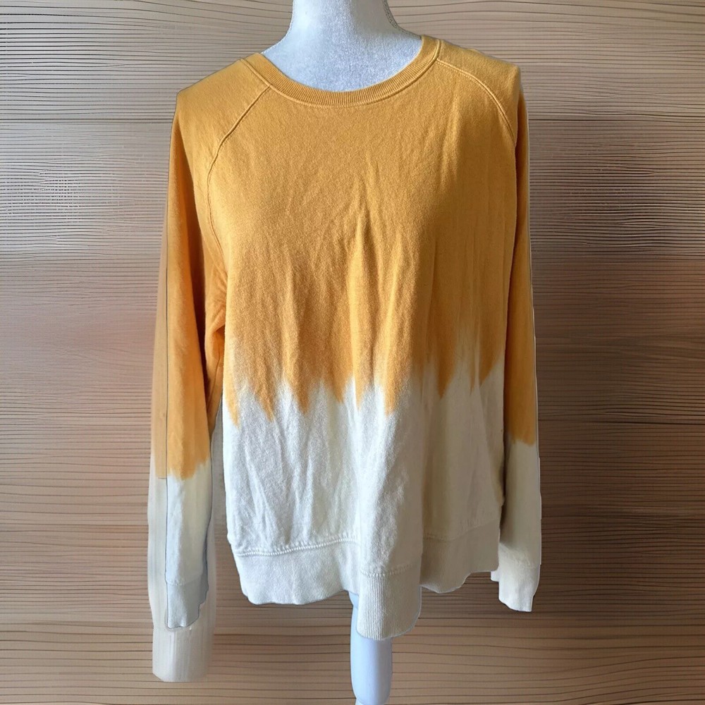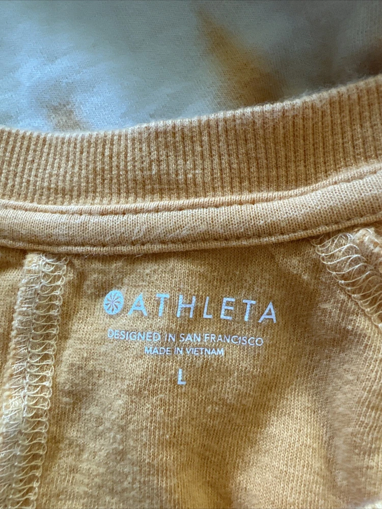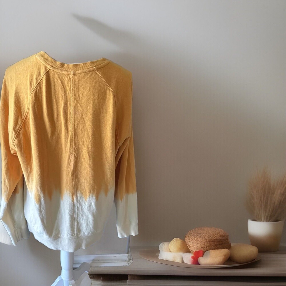 Add a touch of bohemian style to your wardrobe with this Athleta Sundown Dip Dye Sweatshirt in size Large. The pullover sweatshirt features a crew neckline, raglan sleeves, and a colorblock pattern in shades of yellow. It is made of a comfortable and stretchy blended fabric containing 98% cotton and 2% other fiber, as well as cotton and cotton blend. Perfect for any occasion, whether it be activewear or casual wear, this sweatshirt is machine washable and easy to maintain. Its collarless design and regular fit make it suitable for various activities, including gym and training, walking, cycling, school, cross-training, dance, driving, hiking, cheerleading, running, and jogging. The Athleta Sundown Dip Dye Sweatshirt is a must-have for anyone who wants to add a pop of color and a trendy touch to their outfit.