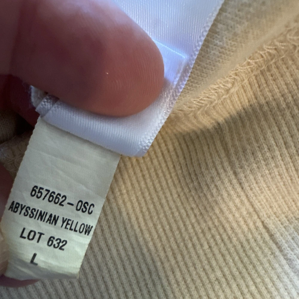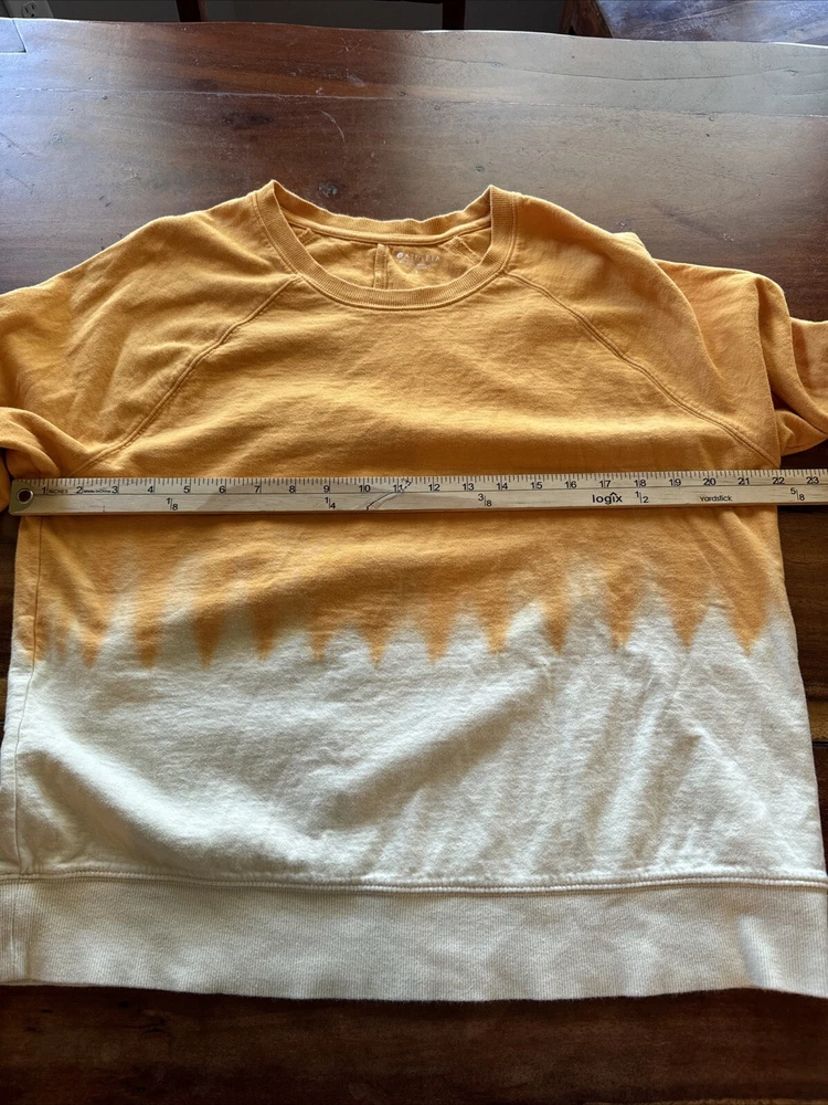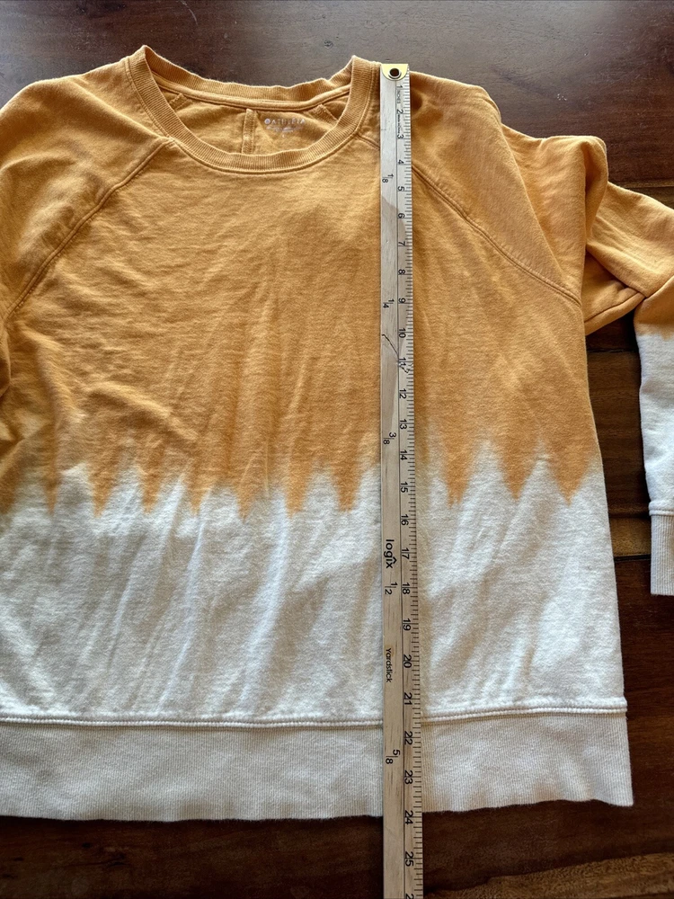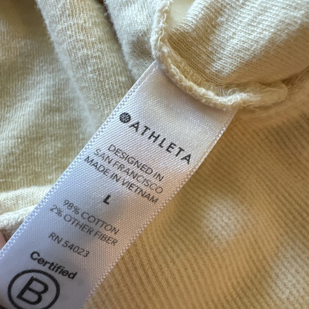 Add a touch of bohemian style to your wardrobe with this Athleta Sundown Dip Dye Sweatshirt in size Large. The pullover sweatshirt features a crew neckline, raglan sleeves, and a colorblock pattern in shades of yellow. It is made of a comfortable and stretchy blended fabric containing 98% cotton and 2% other fiber, as well as cotton and cotton blend. Perfect for any occasion, whether it be activewear or casual wear, this sweatshirt is machine washable and easy to maintain. Its collarless design and regular fit make it suitable for various activities, including gym and training, walking, cycling, school, cross-training, dance, driving, hiking, cheerleading, running, and jogging. The Athleta Sundown Dip Dye Sweatshirt is a must-have for anyone who wants to add a pop of color and a trendy touch to their outfit.
