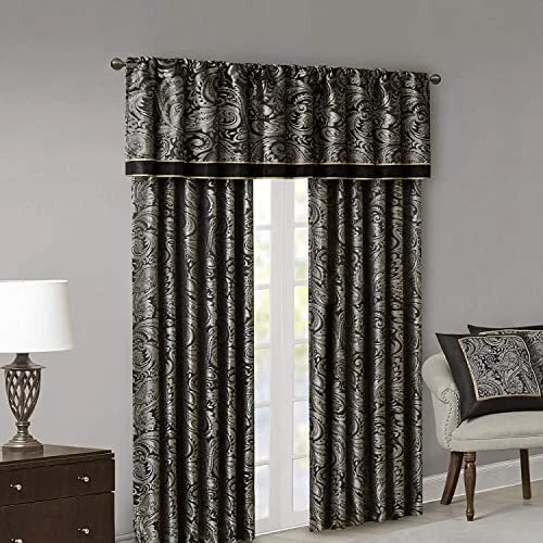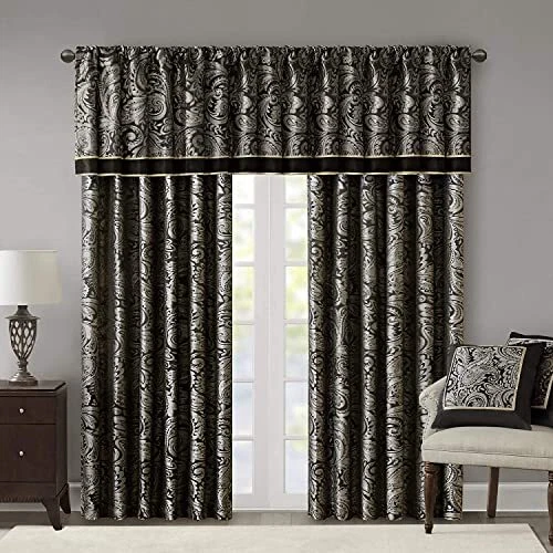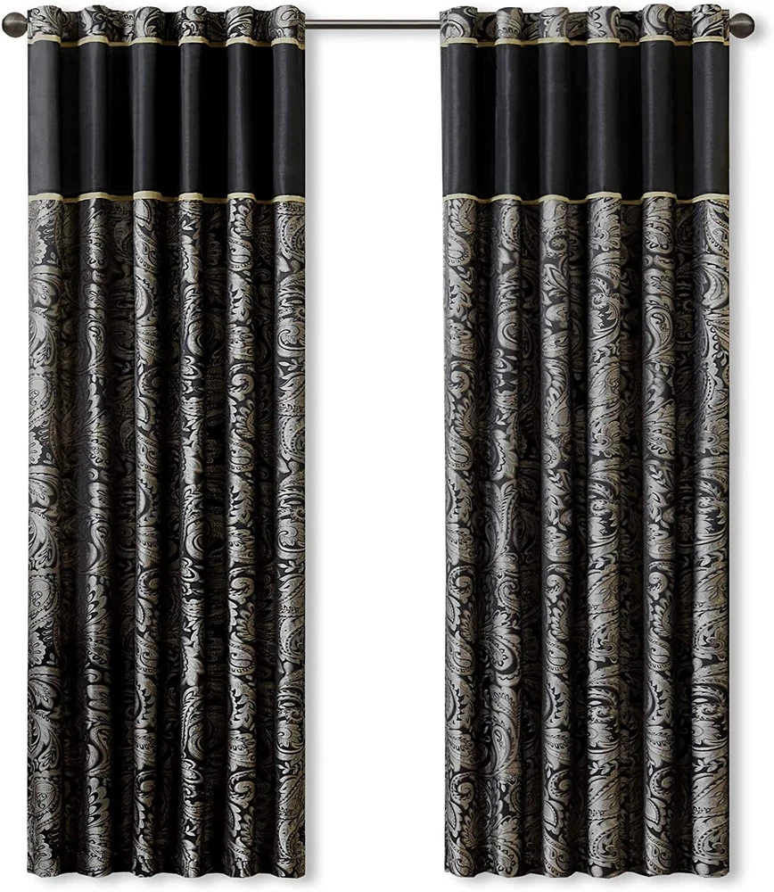 For a luxuriously classic style, our Aubrey Window Curtain Pair is the perfect touch to your decor. The alluring jacquard weave is inspired from an updated paisley motif and is woven in beautiful hues of black, gold, and a hint of platinum for a shimmering accent. The window panels are pieced with solid faux silk and beautiful flat piping details in gold, creating an elegant look. While also achieving the OEKO-TEX certification, meaning it does not contain any harmful substances or chemicals, ensuring quality comfort and wellness. Rod pocket or back tabs top finish makes this curtain easy to hang, open, and close panels throughout the day; while fitting up to a standard 1.25" diameter rod. Coordinating bedding is also available and sold separately. Set of 2 curtain panels showcasing an elegant paisley jacquard with a sophisticated natural luster, perfect for a fresh and stylish update For a luxuriously classic style, our Aubrey Window Curtain Pair adds an elegant touch to your décor while providing room darkening effect, for enhanced privacy The window panels are pieced with solid faux silk and beautiful flat piping details in gold, creating an elegant look OEKO-TEX certification, meaning it does not contain any harmful substances or chemicals, ensuring quality comfort and wellness. Simply hang on rod pocket or back tabs for a tailored finish; fits up to a 1. 25 diameter rod CARE - Machine wash cold on gentle cycle, tumble dry on low heat, wash alone, do not bleach