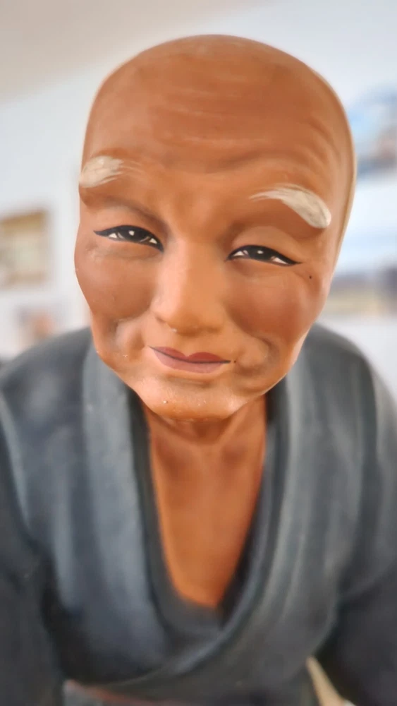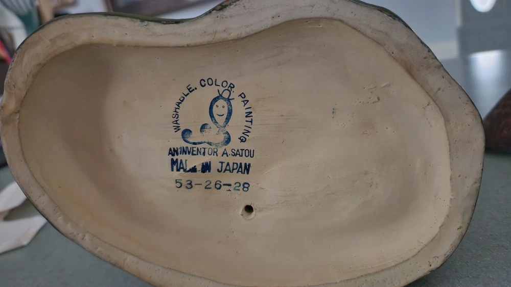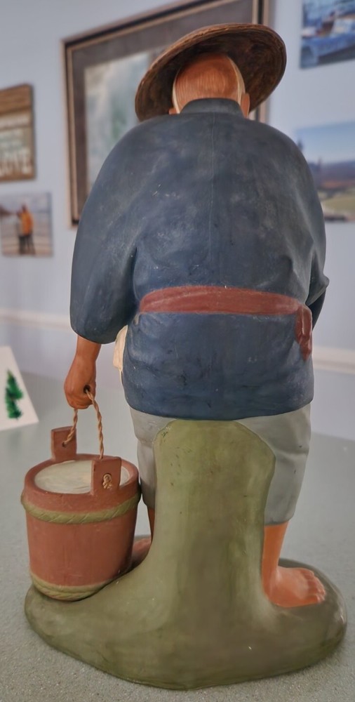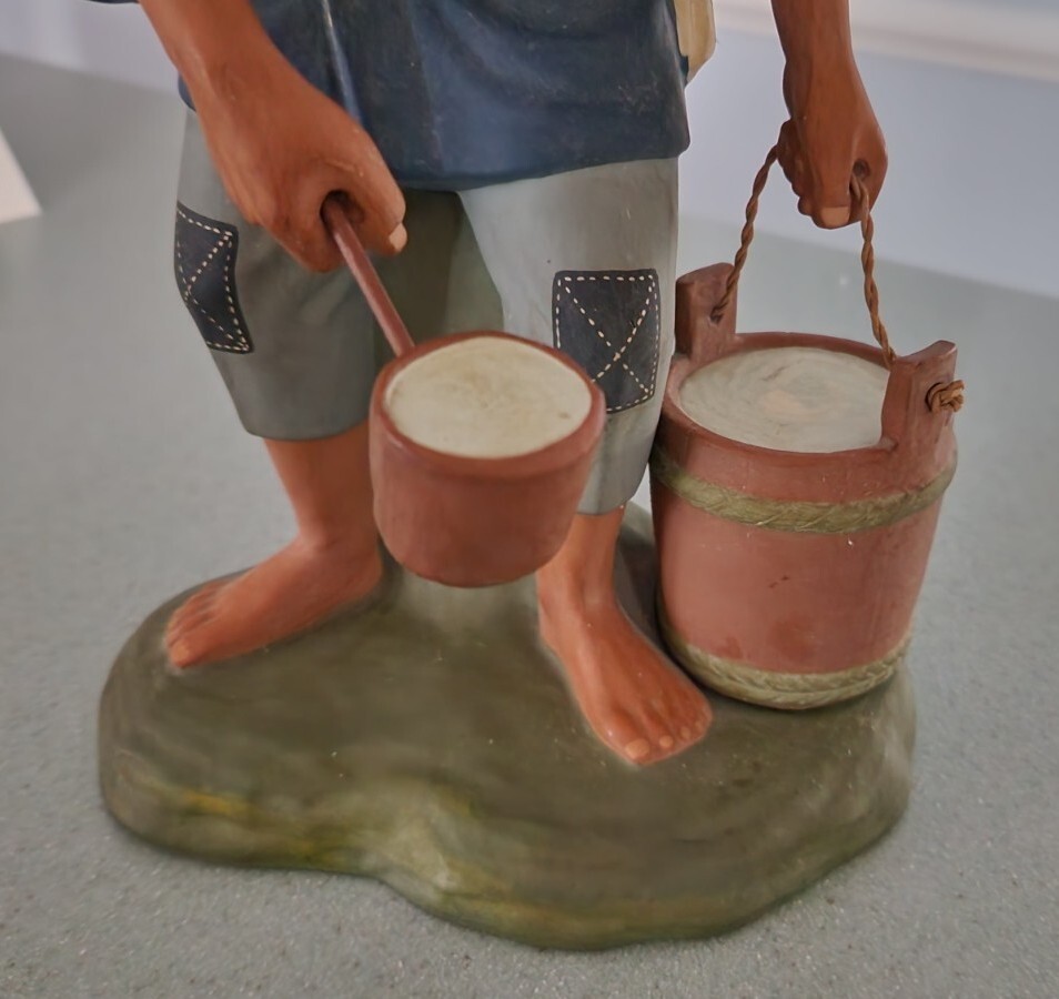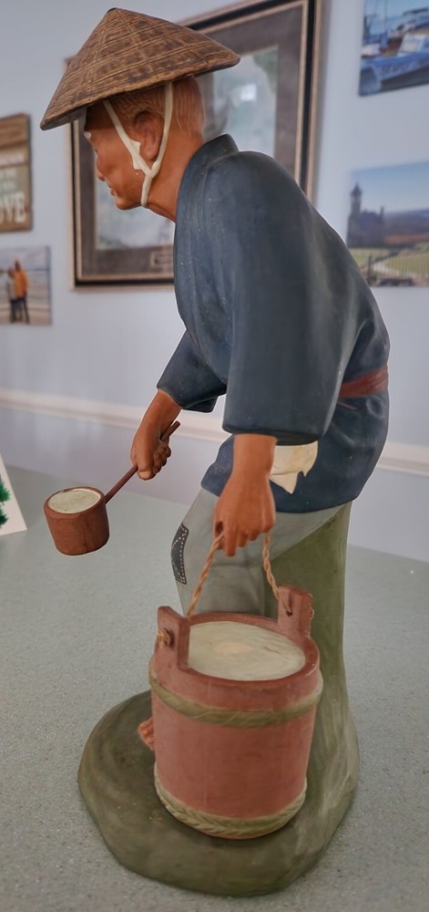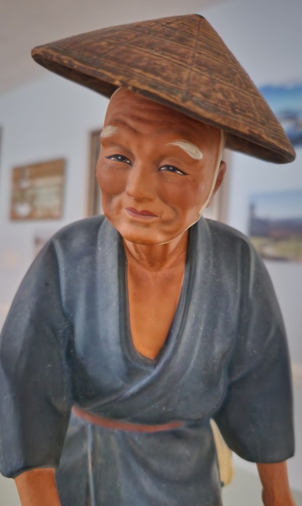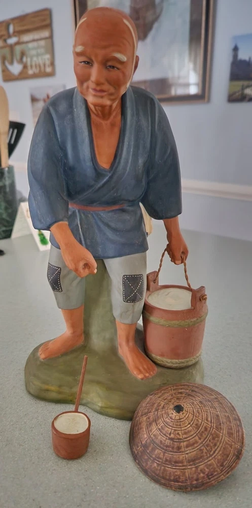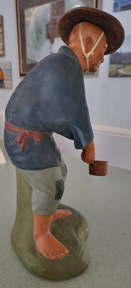 This authentic Japanese clay pottery figurine depicts a man dipping water and is a beautiful piece of art. The artist, A. Satou, carefully hand-painted the multicolor statue with intricate details that make it a great addition to any collection. The large size and weight of 13 inches and 5 pounds respectively make it a substantial piece that commands attention. The Hakata Urasaki (?) statue is made of clay and was manufactured in Japan during the time period of 1950-1959. It is perfect for all occasions and will add a touch of elegance to any space. The item features a man in motion and is a great representation of Japanese culture. I have wrapped his "hat" and dipper separately in bubble wrap and have wrapped him by section being careful that tape holding the wrap in place does not touch any of the paint. Please unwrap VERY carefully. Also, to clarify this does not have a Hakata Urasaki label but is definitely that style and composition so assuming this is correct.
