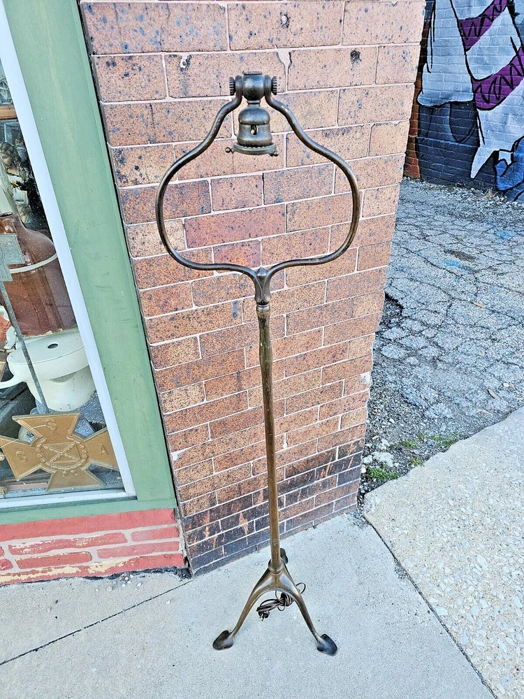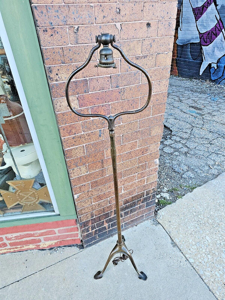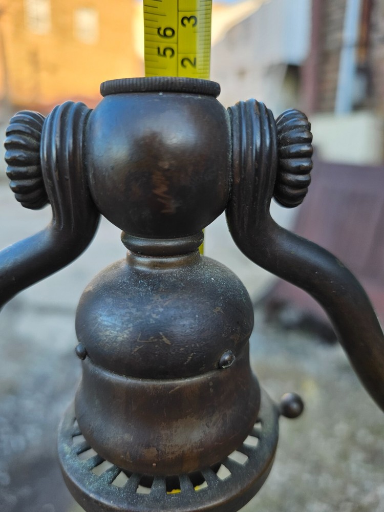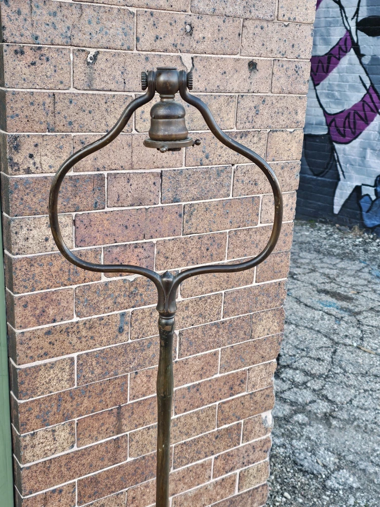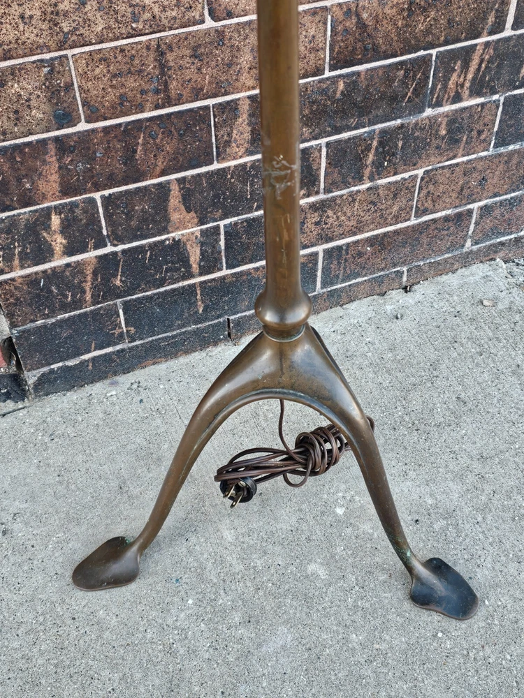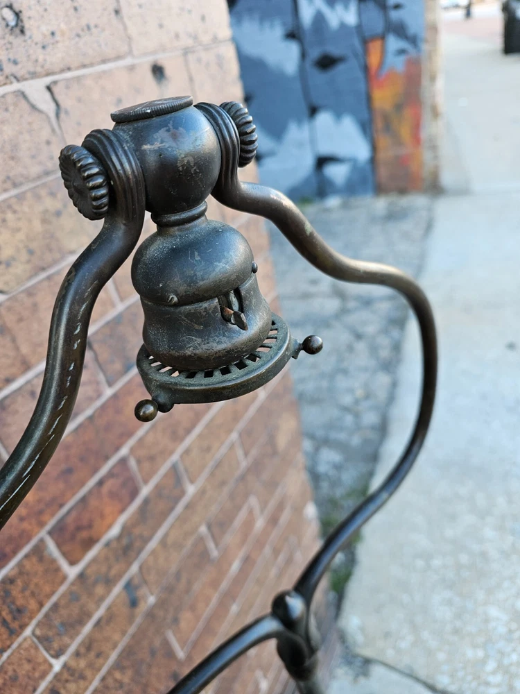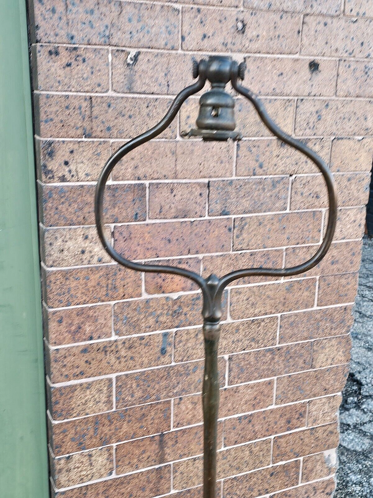 Beautiful + Authentic + Antique + Hallmarked " Tiffany Studio New York #423 " Bronze Harp tri - Foot Floor Lamp + Heirloom Quality + Elegant and Timeless! Measures avg. 55.0" tall with 12.0" wide Harp with 14.0" foot spread across. From socket to center base 7.0" tall ( 6.0" shade is best ) + ( please see photos ) Has title Socket + Original Turn screw knobs and switch. Condition report: Being offered with the understanding that this is an Antique that shows signs of age and wear: There is Tarnish especially at feet and some wear to finish and cord is not original + may need electrical update + Solid + Strong + Sturdy + Overall Beautiful Beautiful Fitter + Take type " A" bulb + Please review All photos as part of condition report and if more information and or photos needed please let us know. Shipping and Insurance is only $189.99 via UPS Or FedEx Ground insured delivery with New packing material within Continental USA. Floor Lamp May also be picked up at our Racine, WI 53403 location by appointment. We Will also work with your mover / shipper. Please see our other fine Lamps. Many Blessings!