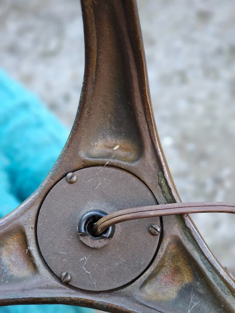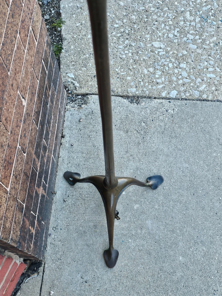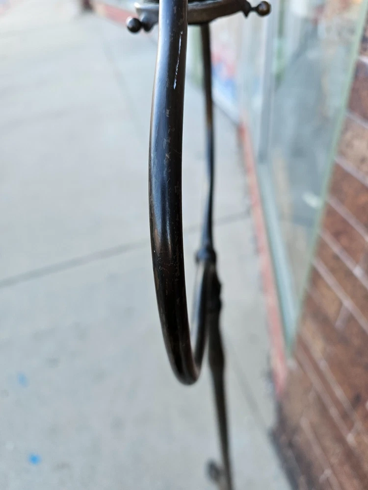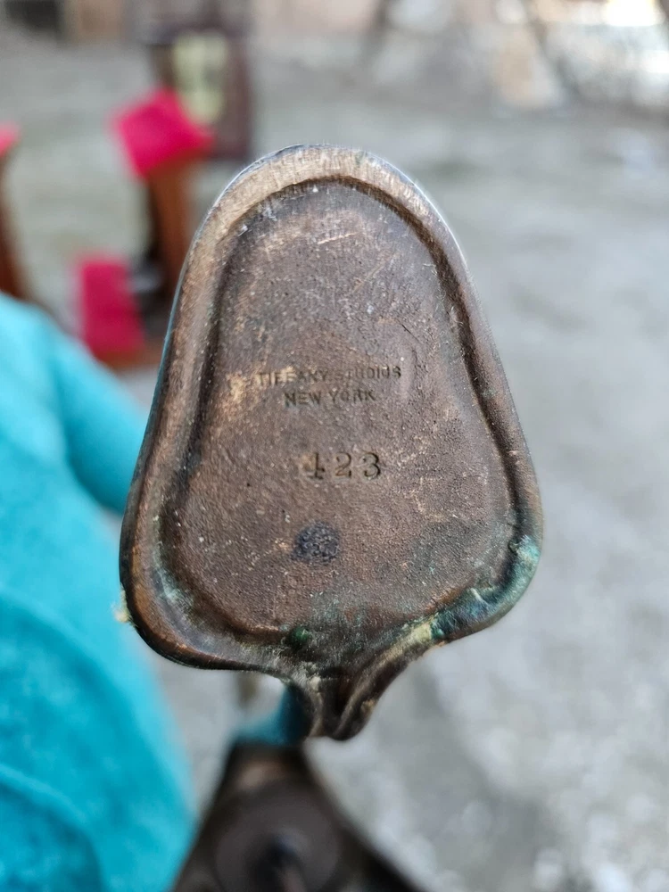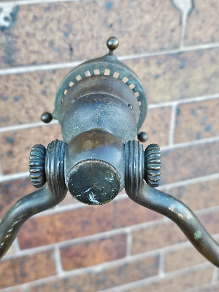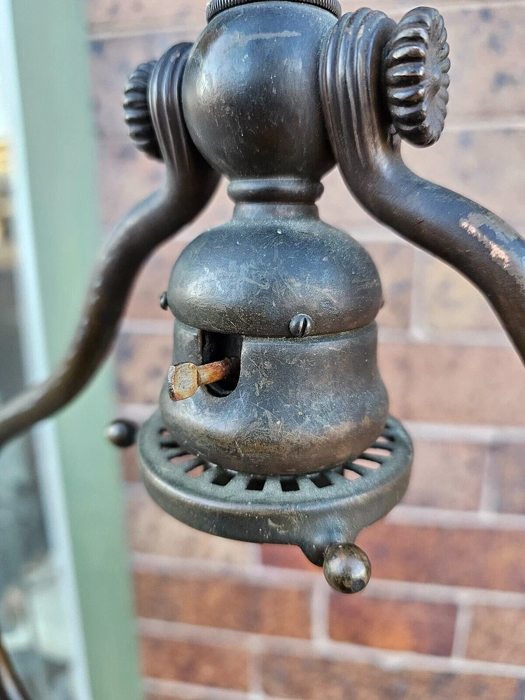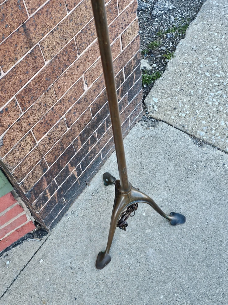 Beautiful + Authentic + Antique + Hallmarked " Tiffany Studio New York #423 " Bronze Harp tri - Foot Floor Lamp + Heirloom Quality + Elegant and Timeless! Measures avg. 55.0" tall with 12.0" wide Harp with 14.0" foot spread across. From socket to center base 7.0" tall ( 6.0" shade is best ) + ( please see photos ) Has title Socket + Original Turn screw knobs and switch. Condition report: Being offered with the understanding that this is an Antique that shows signs of age and wear: There is Tarnish especially at feet and some wear to finish and cord is not original + may need electrical update + Solid + Strong + Sturdy + Overall Beautiful Beautiful Fitter + Take type " A" bulb + Please review All photos as part of condition report and if more information and or photos needed please let us know. Shipping and Insurance is only $189.99 via UPS Or FedEx Ground insured delivery with New packing material within Continental USA. Floor Lamp May also be picked up at our Racine, WI 53403 location by appointment. We Will also work with your mover / shipper. Please see our other fine Lamps. Many Blessings!