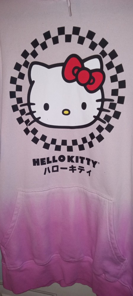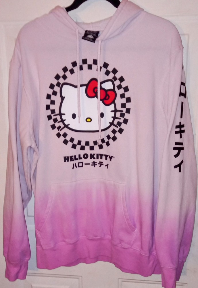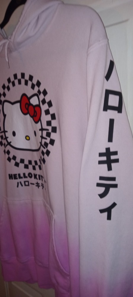 This authentic Sanrio Hello Kitty hoodie sweatshirt is a must-have for any fan of the beloved character. The pullover style and round neck design provides casual comfort. The long sleeve hoodie features a pink ombre color wash and a cute Hello Kitty logo accent. It is machine washable and perfect for any season. Preowned and in very good condition. The rubberized hello Kitty design is soft and flexible. Please see measurements below Length 29 inches Bust 48 inches Hem 38-inches unstretched to 48 inches comfortably stretched Sleeve inseam 22 inches Armhole opening 22 inches unstretched