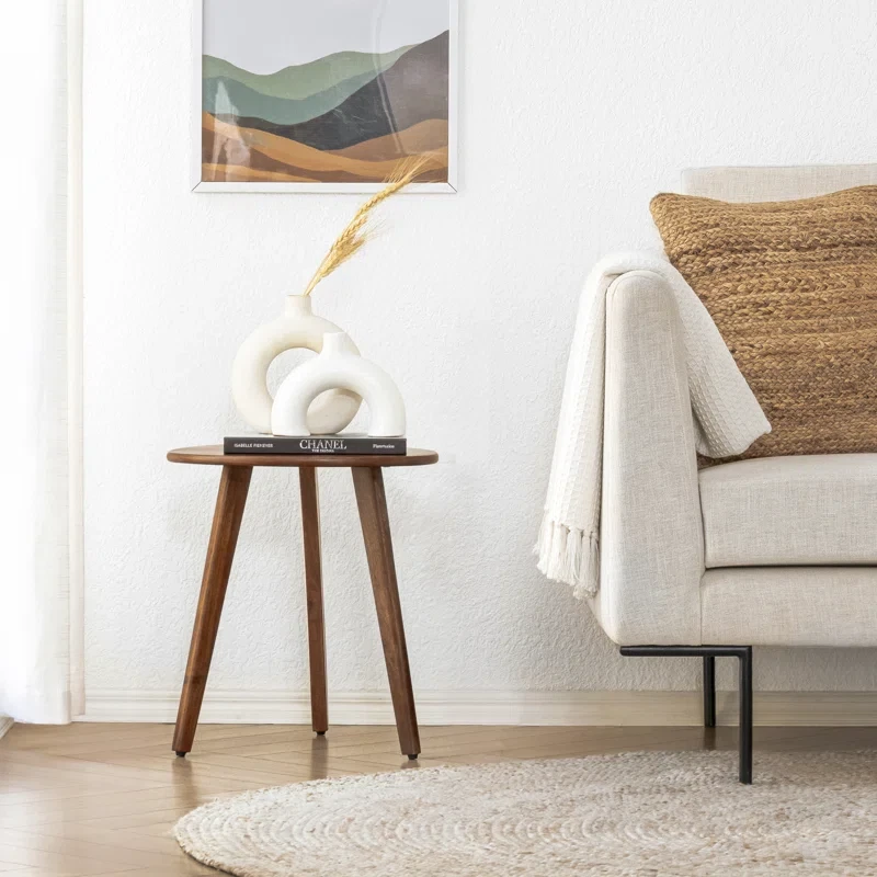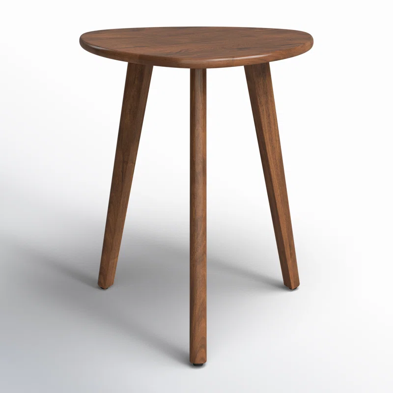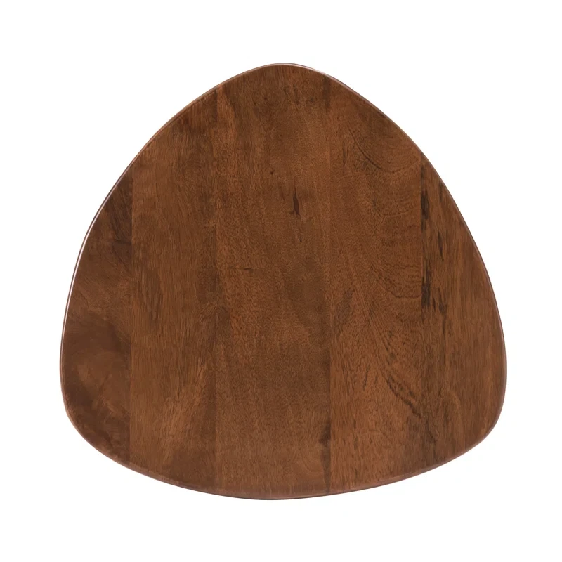 Handcrafted from solid mango wood, this end table embraces nature's beauty with a modern twist. The mid-century design showcases the natural wood grain variations, making it a statement piece in any room. Its rounded edges, tapered legs, and neutral finish evoke a Scandinavian elegance that complements your decor. We love that the triangular top offers ample space for your favorite books and lamps, while its 50.8 lbs weight capacity ensures it can handle your display needs. Features Handmade by skilled artisans. Made from solid mango wood. Features natural wood grains and variations. Comes with floor protectors. Purposeful Distressing Wood Scoring & Rub Through (Technique used to give item a distressed look.) Natural Variation Natural Wood Grain Color Variation (No item has the same grain color, finish, or wood knots due to natural factors.)