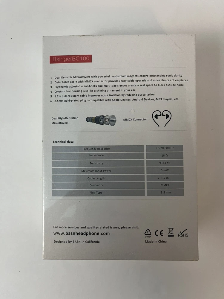 BASN BC100 Professional in Ear Monitor Earphones for Singers Drummers Musicians SEALED