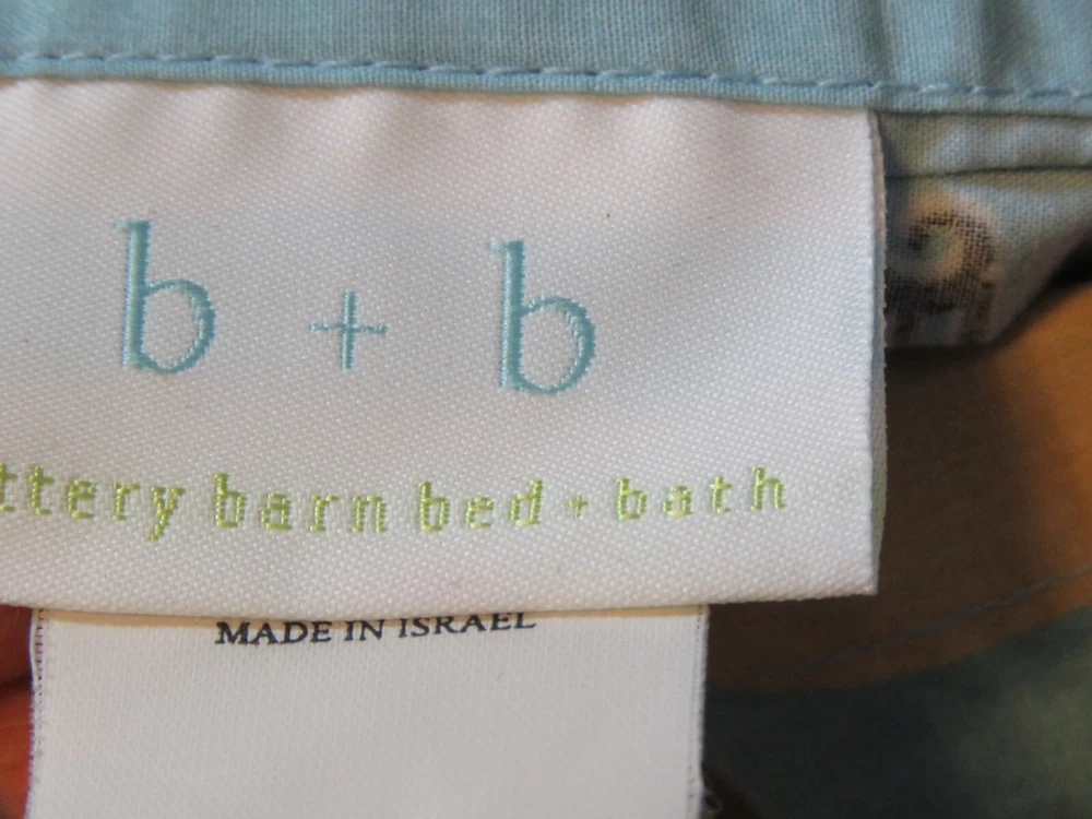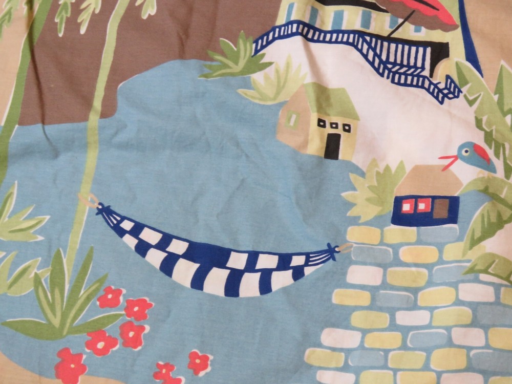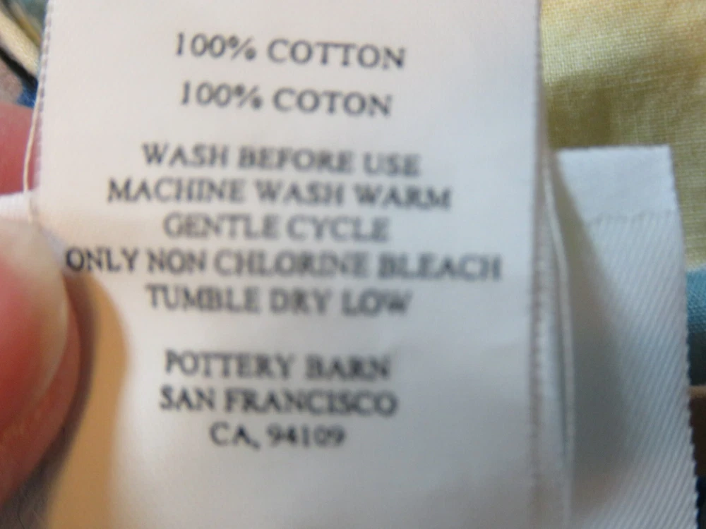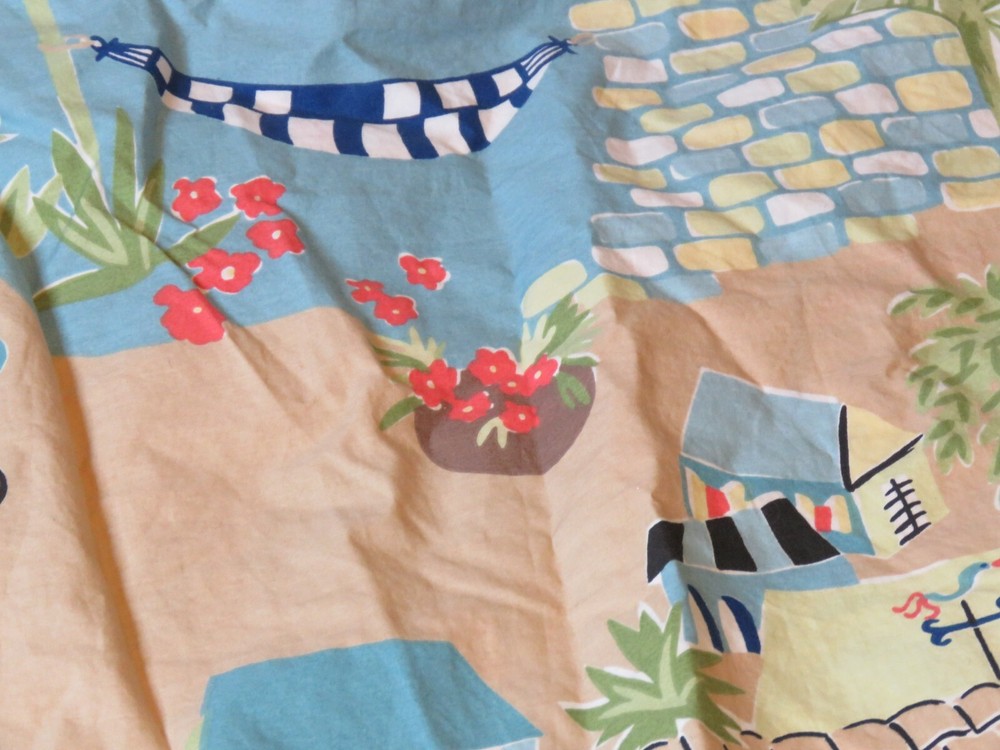 Item: Queen Size Duvet Cover Brand: B + B Pottery Barn Bed + Bath Number: 1 Fabric: 100% cotton Size: Queen 86 x 86 inches Problems: Description: Button closure, soft cotton, cute fun print of houses, water, hammocks, etc. This item has been folded and in storage for months. If there are spots or stains, I have not tried to remove them as it has been stored and wasn't needed in y current house. No rips or tears. Could use an airing out, possibly a wash and even an iron. Please note I have not washed it because I am unsure if someone may be allergic to the type of soap I use. If you decide to purchase this item, and you have problems with it upon receipt, please contact me about your issues, and I will be happy to work with you to reach a satisfactory resolution.
