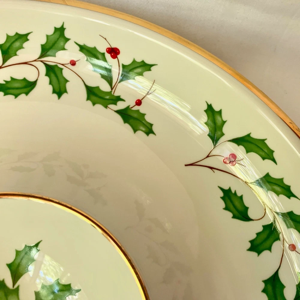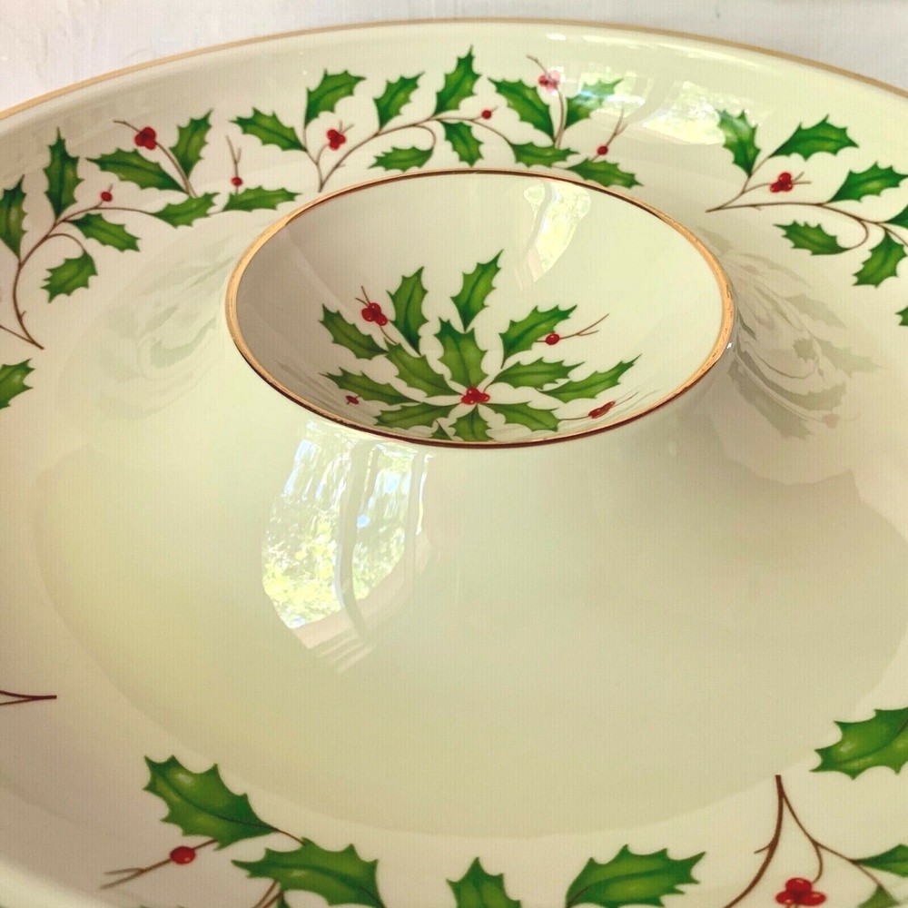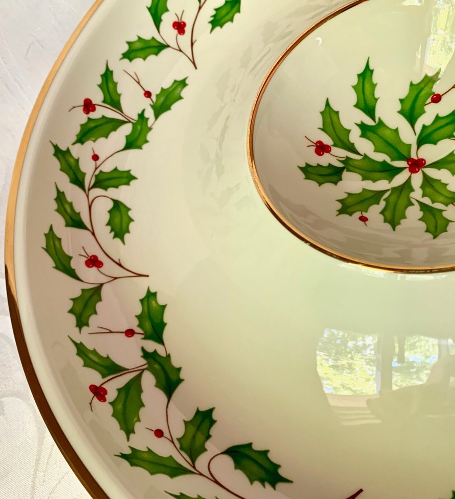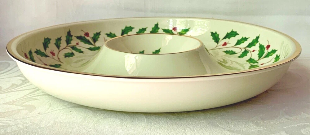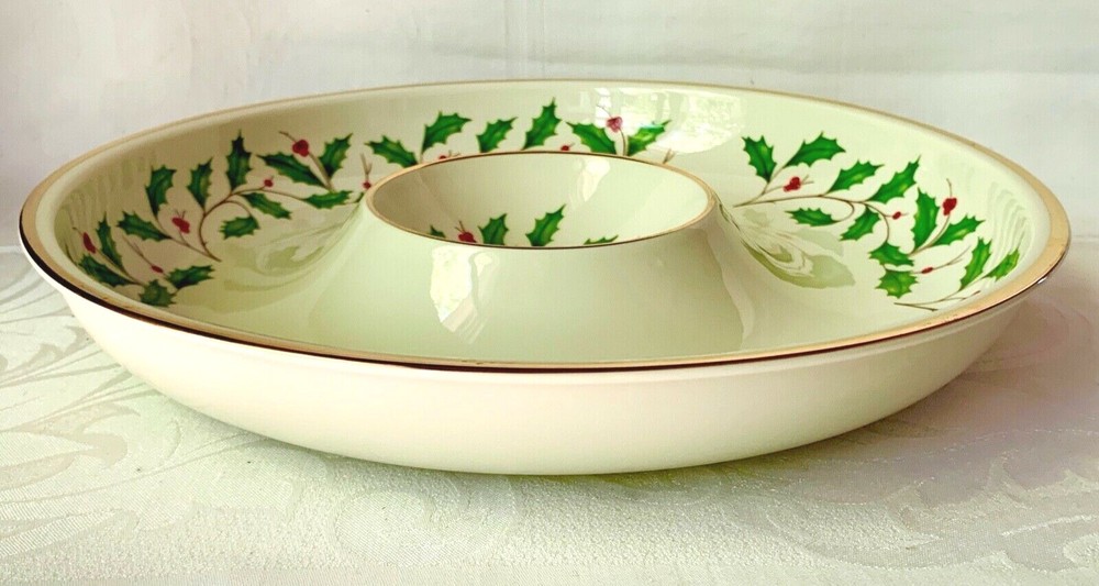 Maker and design : This beautiful large chip and dip serving dish is in Lenox China's festive Holiday pattern, bursting with bright green holly and red berries, elegantly trimmed in gold. It's in the company's Dimension shape. Holiday has been produced since 1974 and remains one of the company's most popular patterns. Size : The dish is 12 3/8 inches wide and 1 7/8 inches tall. The inner section is 4 1/2 inches wide. The dish weighs 2 pounds 7 ounces. Condition : It's in excellent condition with no nicks, chips, cracks, scratches, repairs, stains or utensil marks. There is a tiny bit of gold wear on the inner rim; it can be seen in the photos. Please check the photos very carefully - they are an important part of the description.