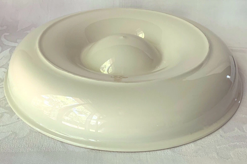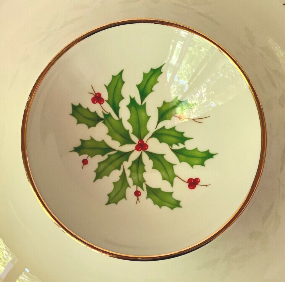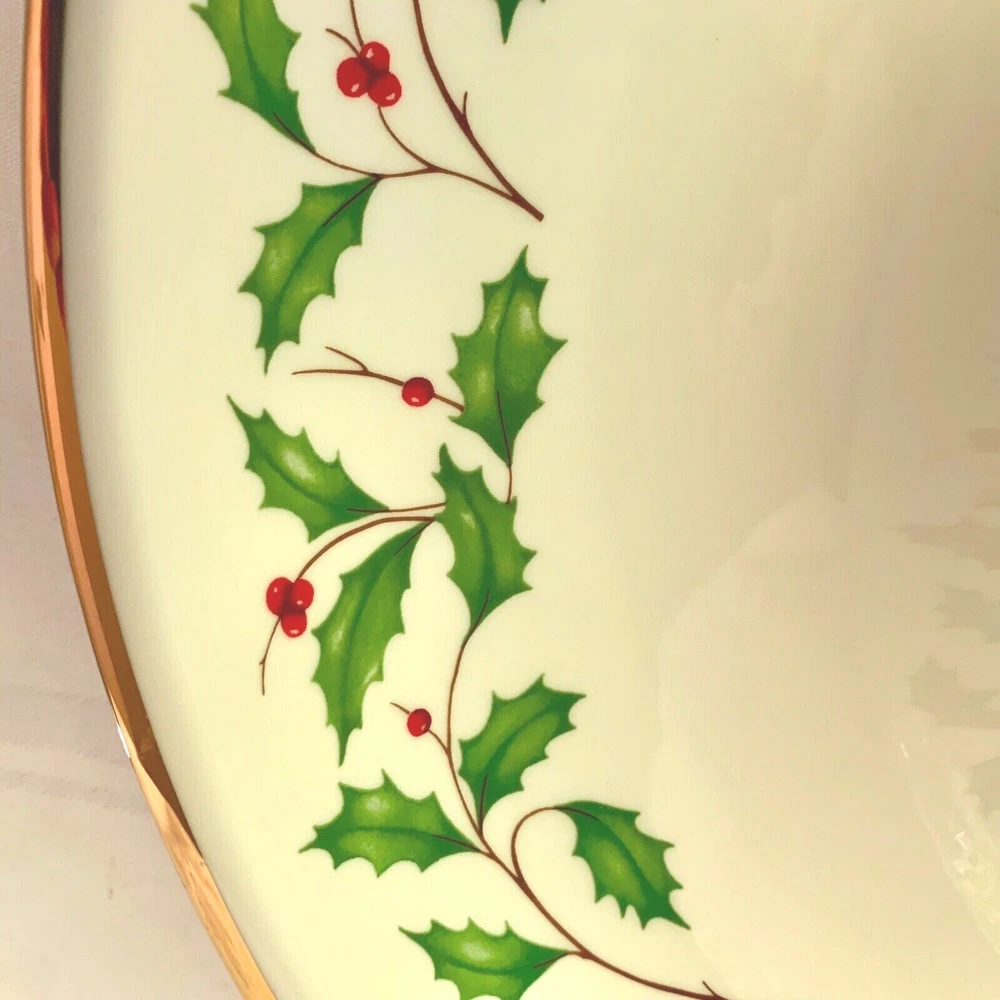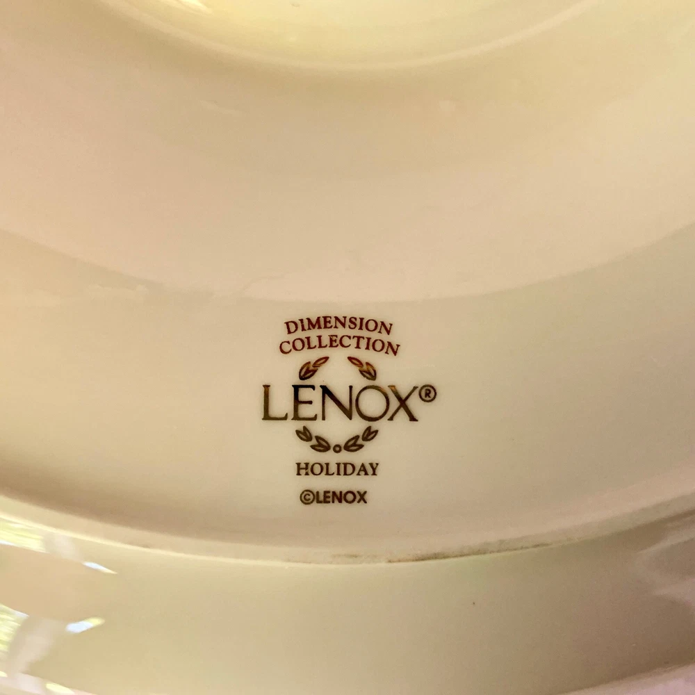 Maker and design : This beautiful large chip and dip serving dish is in Lenox China's festive Holiday pattern, bursting with bright green holly and red berries, elegantly trimmed in gold. It's in the company's Dimension shape. Holiday has been produced since 1974 and remains one of the company's most popular patterns. Size : The dish is 12 3/8 inches wide and 1 7/8 inches tall. The inner section is 4 1/2 inches wide. The dish weighs 2 pounds 7 ounces. Condition : It's in excellent condition with no nicks, chips, cracks, scratches, repairs, stains or utensil marks. There is a tiny bit of gold wear on the inner rim; it can be seen in the photos. Please check the photos very carefully - they are an important part of the description.