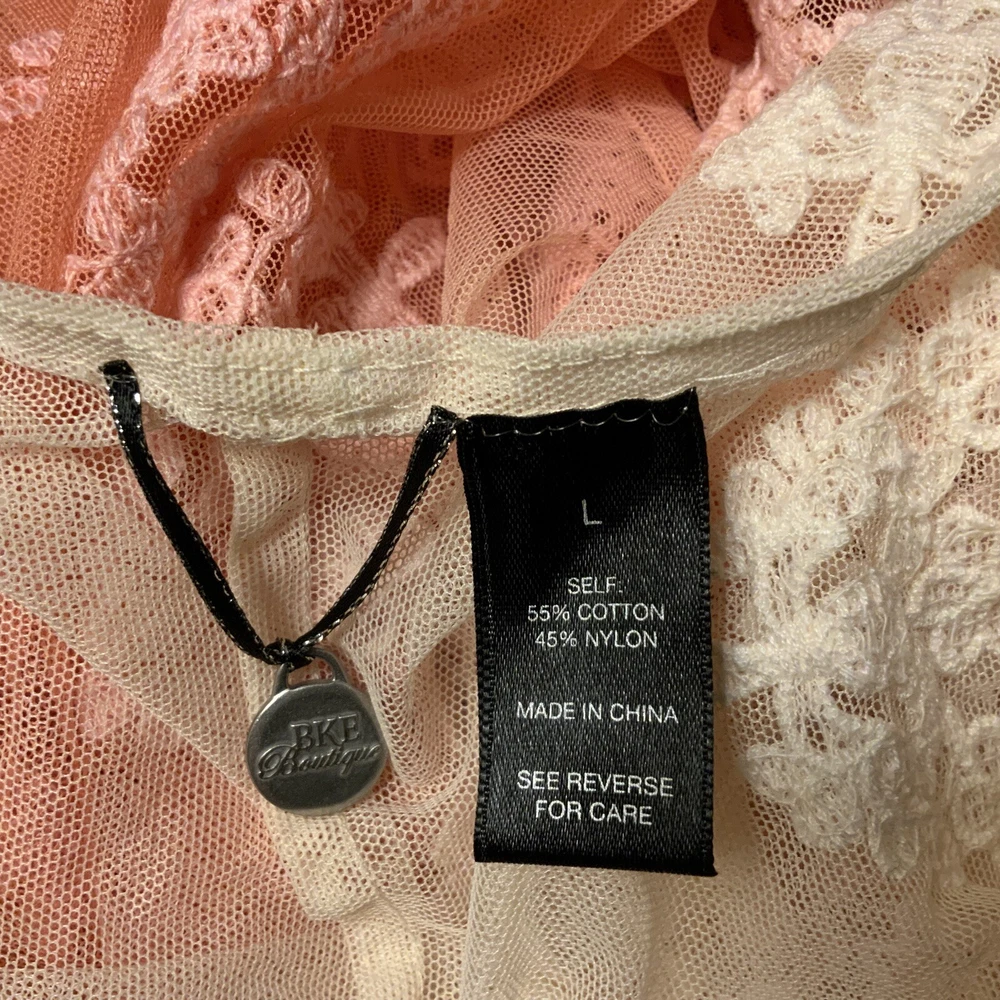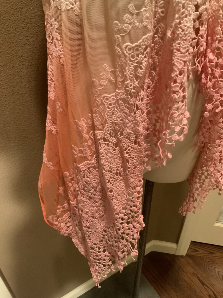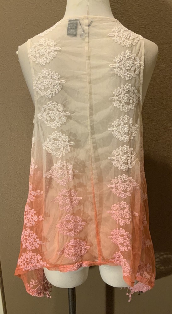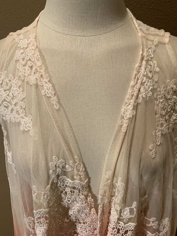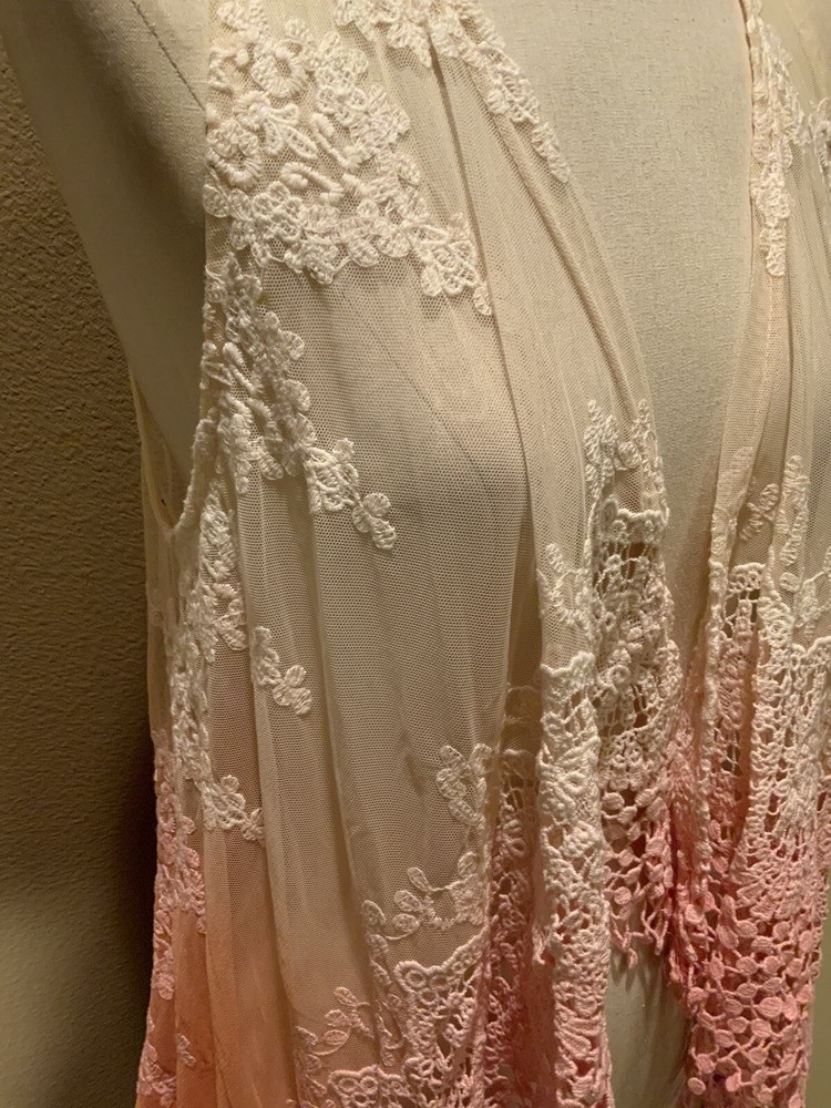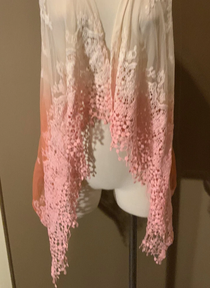 This BKE Boutique cardigan vest features a sleeveless design with an open front neckline, perfect for layering over your outfit. The dip dye pattern creates a unique and stylish look, while the lace fabric adds a touch of elegance. Made of polyester, this multicolor vest is suitable for various occasions such as travel, parties, workwear, or casual outings. With a regular fit and size L, this versatile piece can be worn throughout the seasons to add a fashionable touch to your wardrobe. bust 38’, length 37”