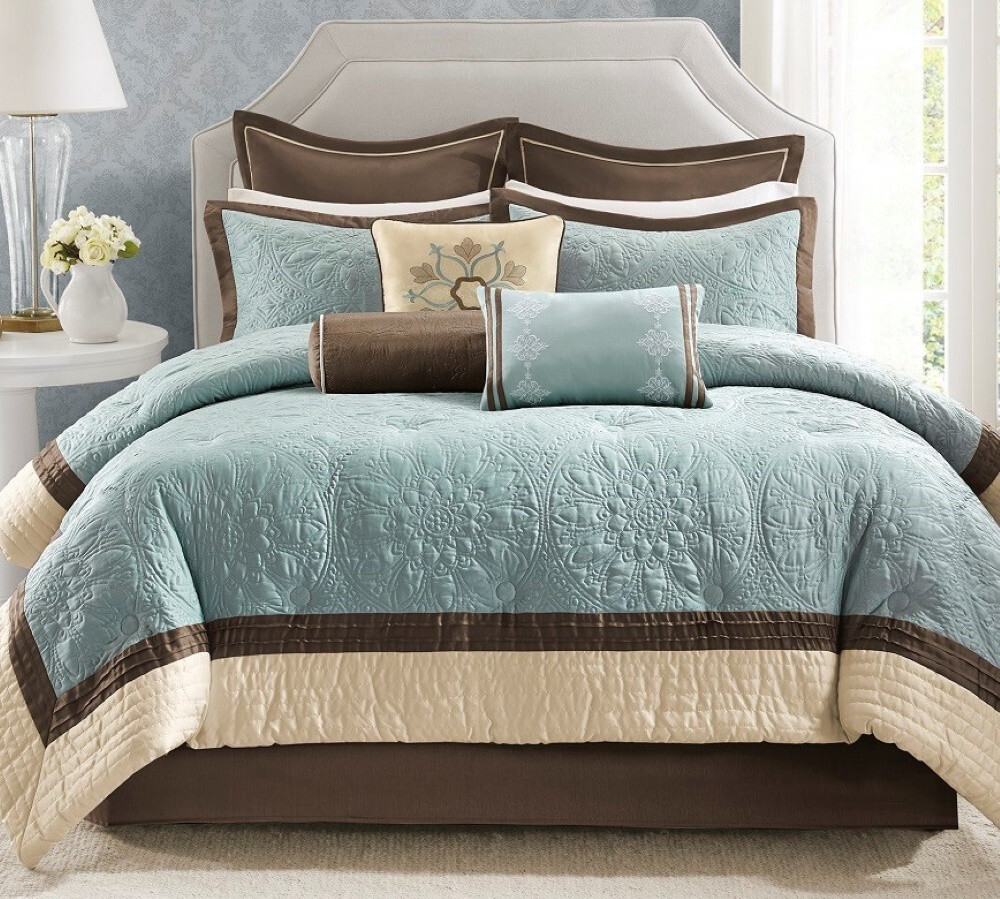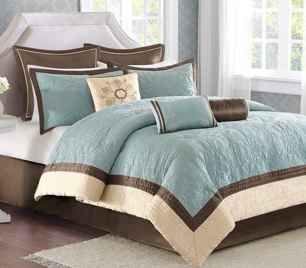9 Piece Comforter Set - KING Product Description: Bring elegance to your bedroom, and a pop of color, with this beautifully crafted comforter set. Made from polyester quilted charmeuse (woven with a satin weave), this decorative collection features chocolate brown, light blue and ivory accents. Includes three decorative pillows which play up embroidered details for a finished look. Two euro shams and a matching bedskirt give a dramatic backdrop to this striking collection. 9pc Set Includes: Comforter + 2 Shams + 2 Euro Shams + Bedskirt + 3 Accent Pillows (see below for sizes) Style: Elegant Chic Color: Light Blue, Chocolate Brown, Ivory Cover: 100% Charmeuse Poly Fill material: 100% Polyester Care instructions: Machine washable Dimensions: Comforter: King - 110"W x 96"L King Shams (two): 20 x 36 inches Euro Shams (two): 26 x 26 inches Bedskirt: King - 78 x 80 inches + 15" drop Accent Pillows (three): 18" x 18", 12" x 18", 6.5" x 18" Also available in OTHER SIZES Please Click Here ~~~~~~~~~~~~~~~~~~~~~~~~~~~~ ~~~~~~~~~~~~~~~~~~~~~~~~~~~~ Returns or Exchanges Please see the Shipping Tab above Shipping Locations: Shipping cost stated is to the 48 contiguous United States. We will gladly ship to Canada, Hawaii, Alaska, Puerto Rico and APO/FPO (Military) addresses, but there may be additional freight charges. Buyers living in these territories must email your zip code BEFORE bidding for a freight quote. Otherwise, we will assume your bid is an acceptance that there will be an additional shipping cost. Buyers are responsible for any and all Customs Fees and/or Duty Fees, or Taxes assessed by their Country.