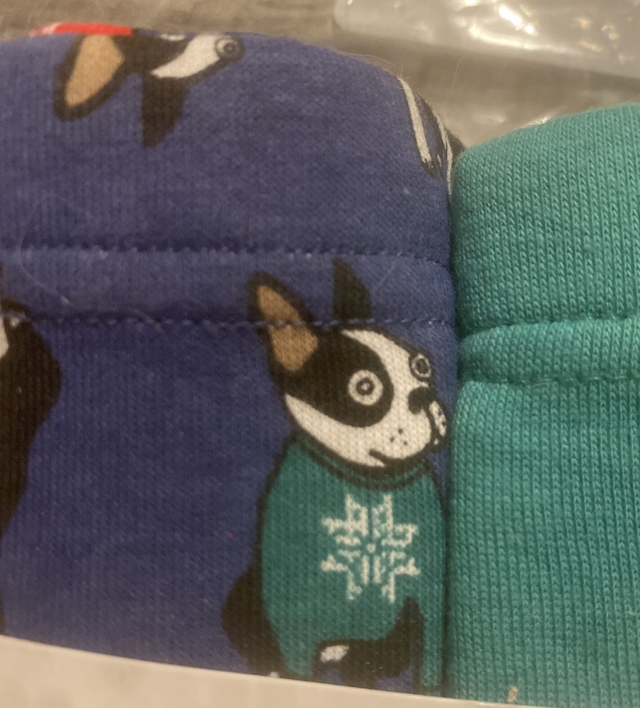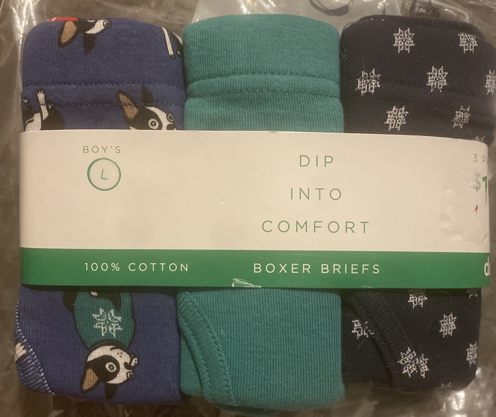 BOY’S BOXER BRIEFS, 3 PAIR, Royal Blue with Boston Terrier Wearing Snowflake Sweater, Solid Green, Navy With Snowflakes, LARGE, NIP. BOYDIP3PK9/1B