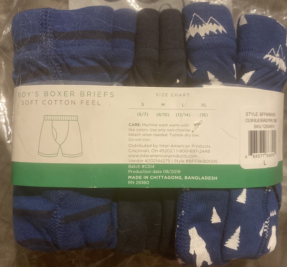 BOY’S BOXER BRIEFS, 3 PAIR, 1- Royal Blue with Bears, Mountains, and Trees, 1- Solid Black, 1- Royal Blue/Black Stripes, LARGE, NIP. BOYBEAR9/1B