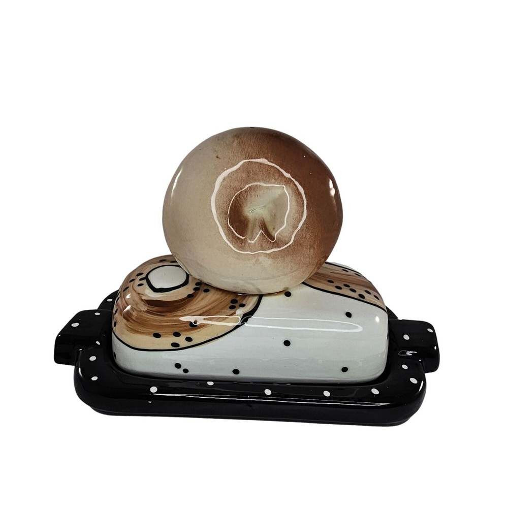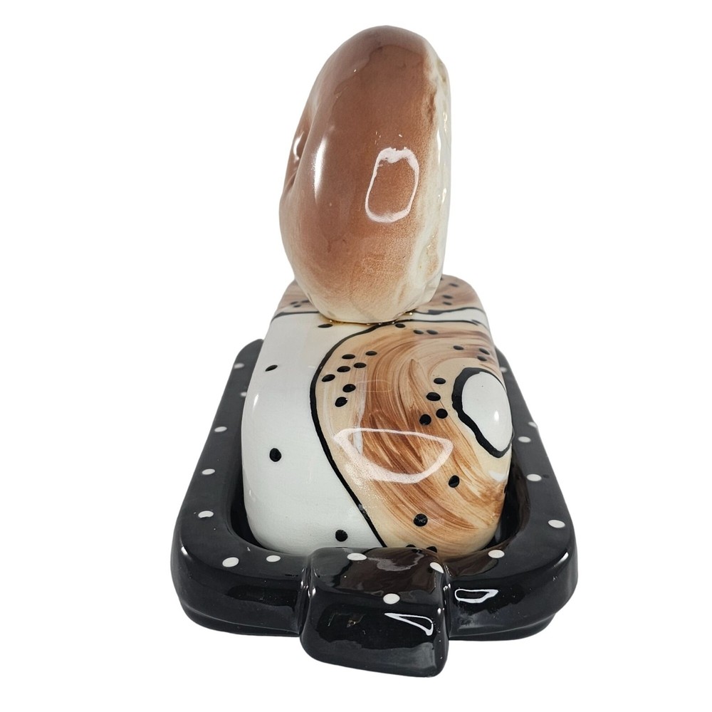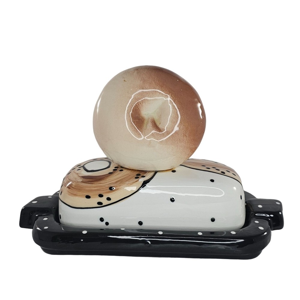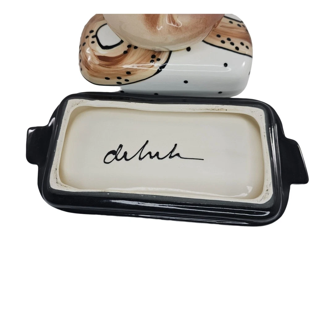 This Bagel Shaped Butter Dish is an unique piece of studio pottery, signed on the bottom. Made from ceramic, it adds a unique touch to your kitchenware. • Ceramic material • Bagel-shaped butter dish • Unique studio pottery • Signed on the bottom Features: • The signature on the bottom is difficult to make up. It looks like it says 'delish' or maybe 'deluk' Measurements: Height 6 in / 15 cm Length 9 in / 23 cm Width 4.25 in / 11 cm Condition: Pre-Owned Good Good condition. No chips or breaks. The glue can be seen under the bagel on top. See photos as they are part of the description.