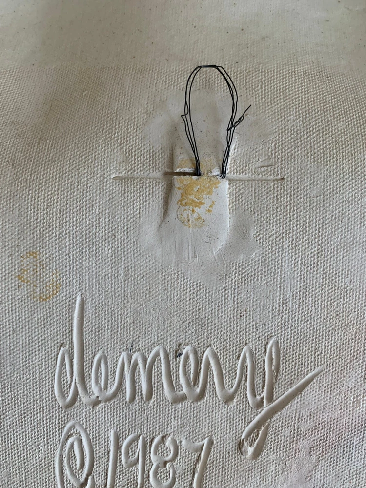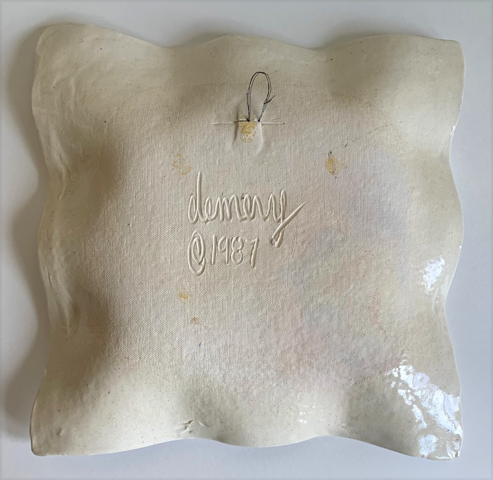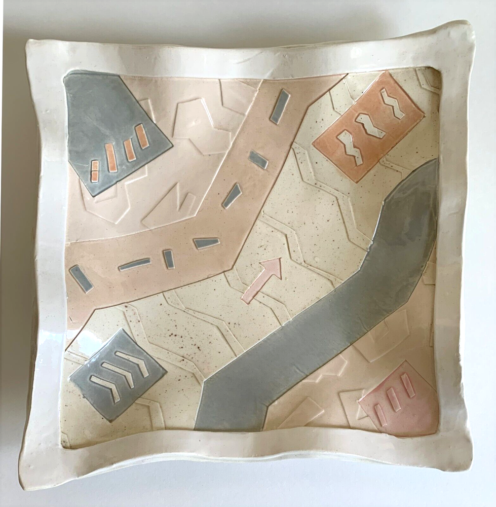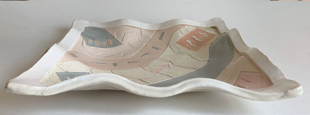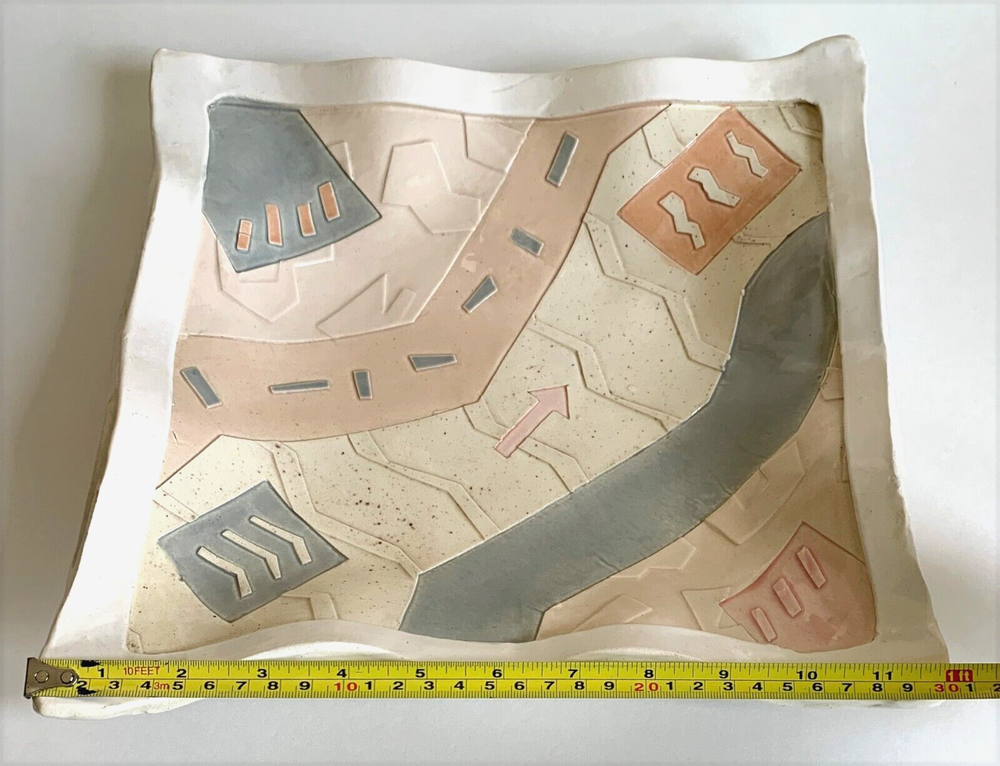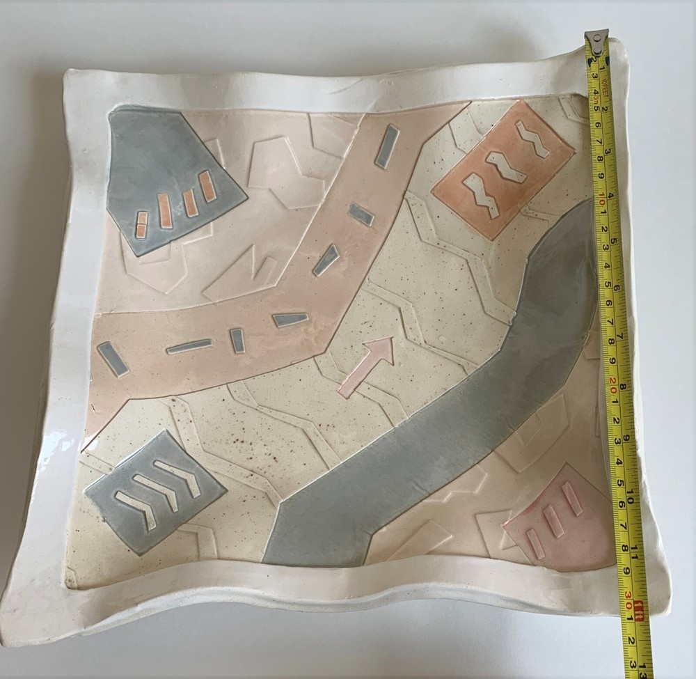 Vintage 80s Studio Pottery Wall Art Bowl Unique hand made abstract art bowl in pastel colors. Bowl measures 12" square. Good/Very good condition. Surface of bowl is clean, glossy finish. Minor edge wear/discoloration may be noticeable. Wire hanger on back is still holding, but the mount is worn and will likely need to be re-enforced prior to hanging. Please see photos for details.