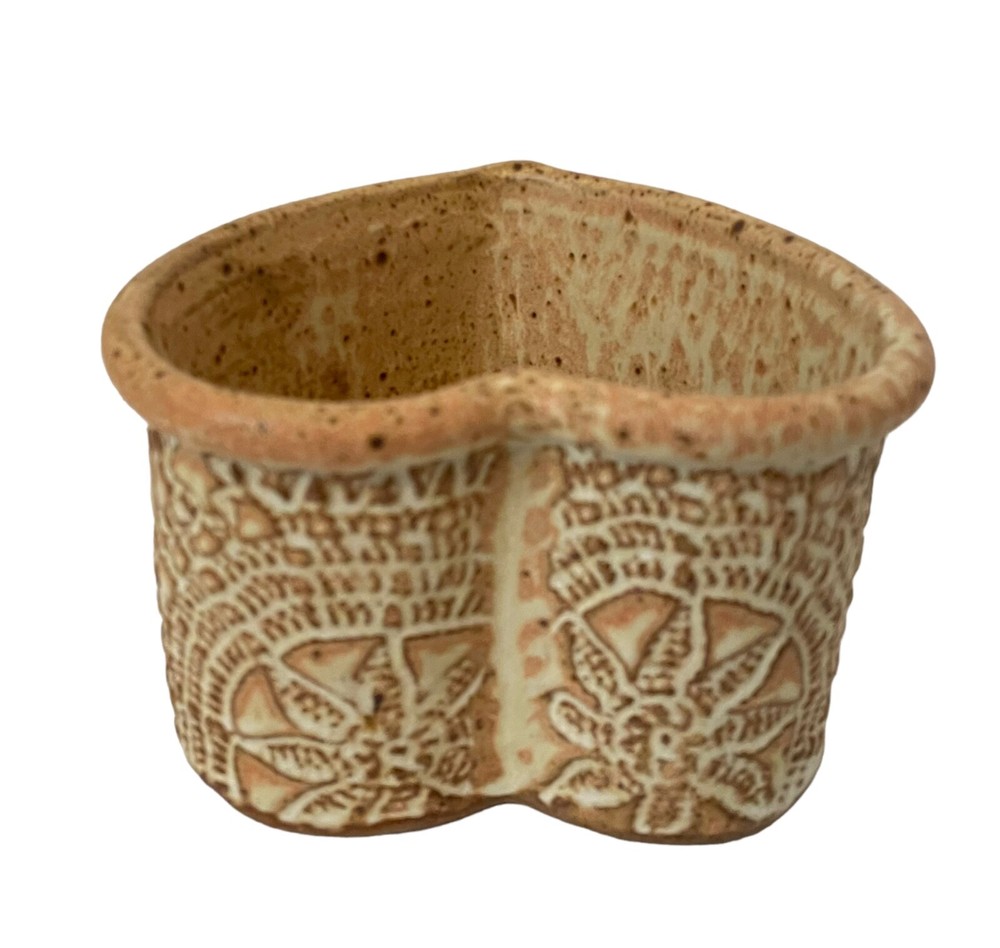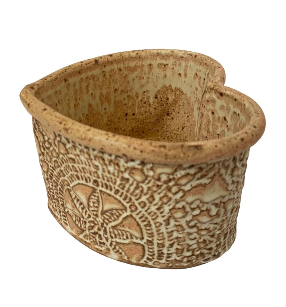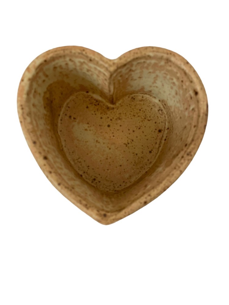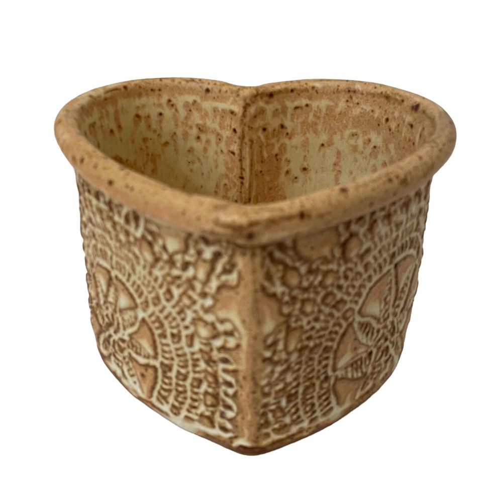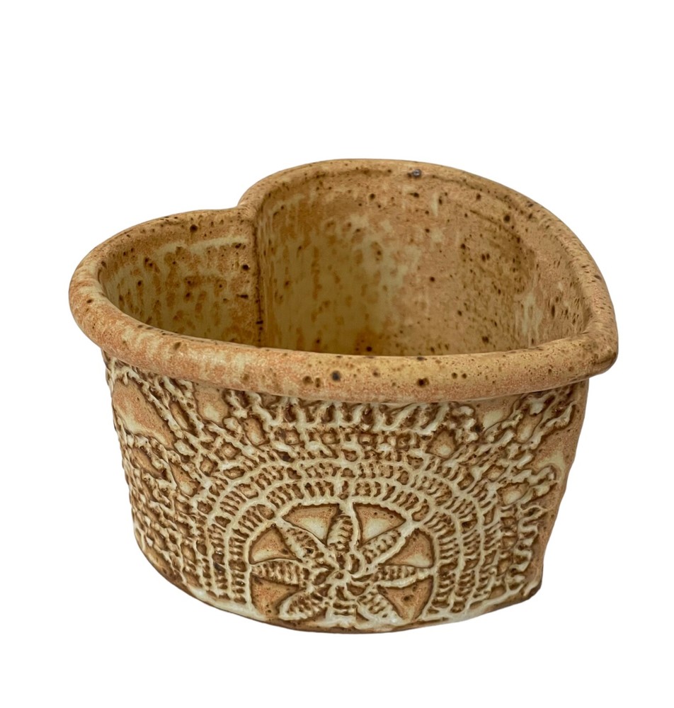 This heart-shaped baking pan is a charming addition to any kitchen. Made by Barbara Studio Art Pottery, this beige bread pan is perfect for baking homemade bread or even candy. With a depth of 3.75 inches and a width of 6 inches, it is just the right size for your baking needs. This vintage piece is an original and has a lovely art theme. It is made of pottery and was manufactured in the United States. No chips or cracks. Would also be great as a candy dish for Valentine’s Day.