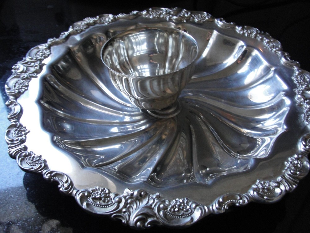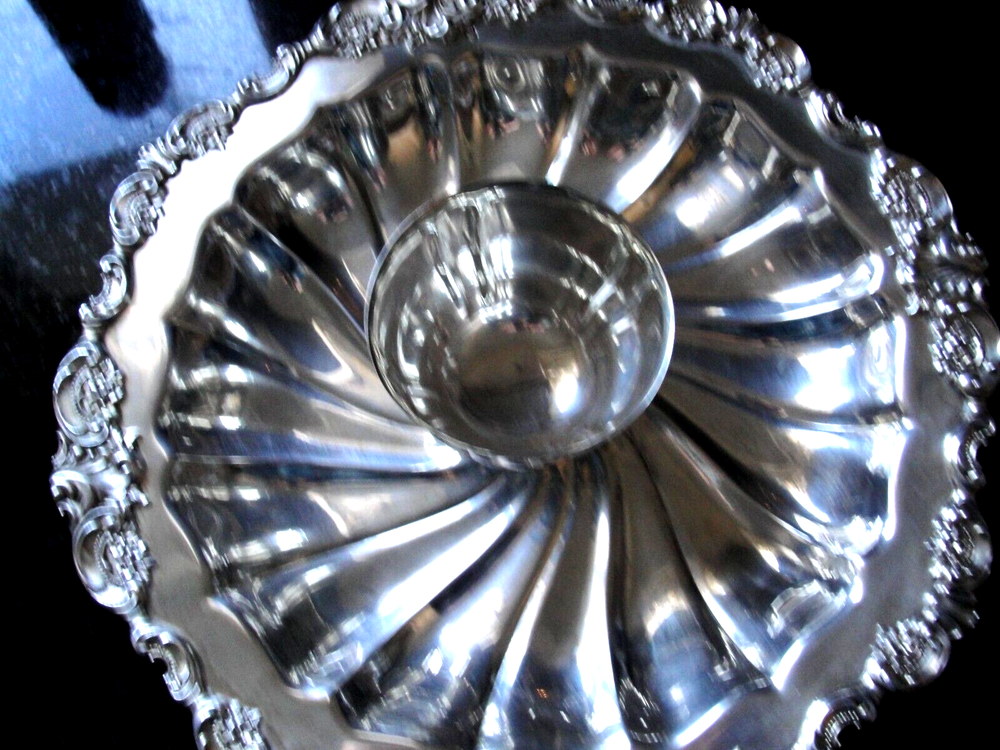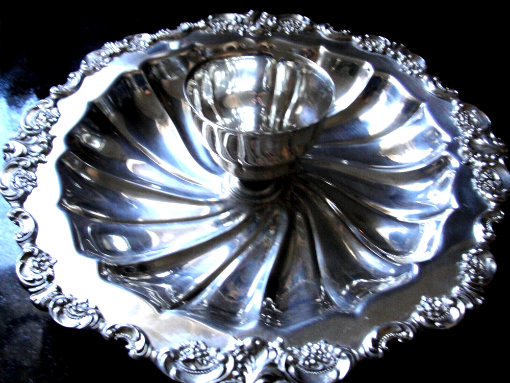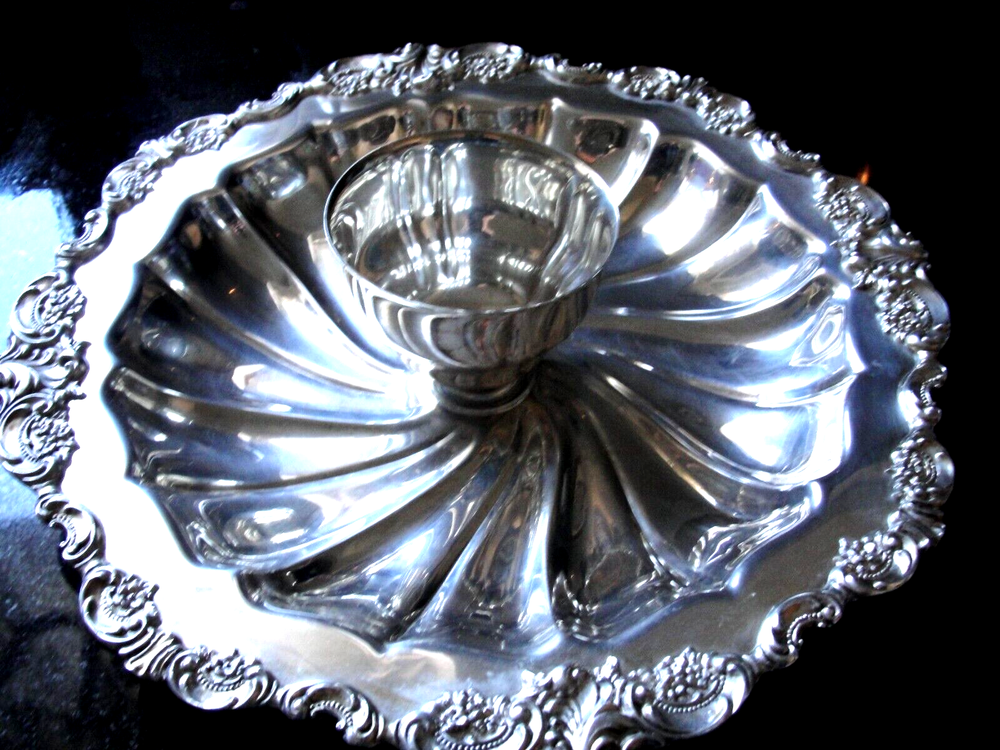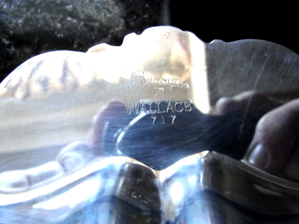 #717 Large Shrimp and dip server, Baroque by Wallace. Excellent condition. About 12 inches wide and 3 inches high. No returns, all sales are final. Add this beautiful piece to your collection today....