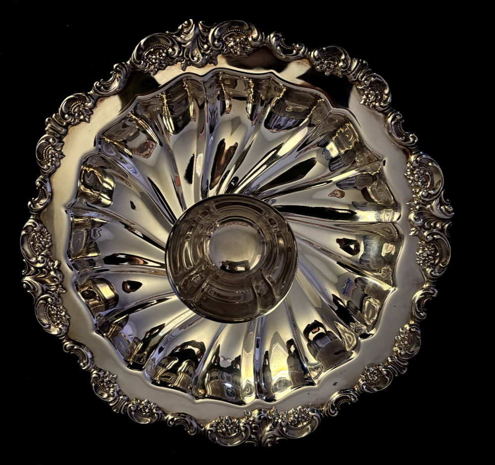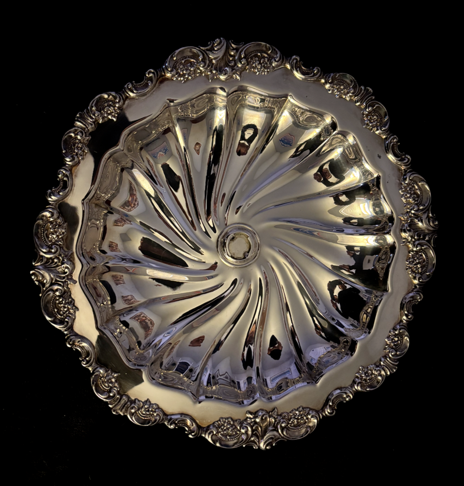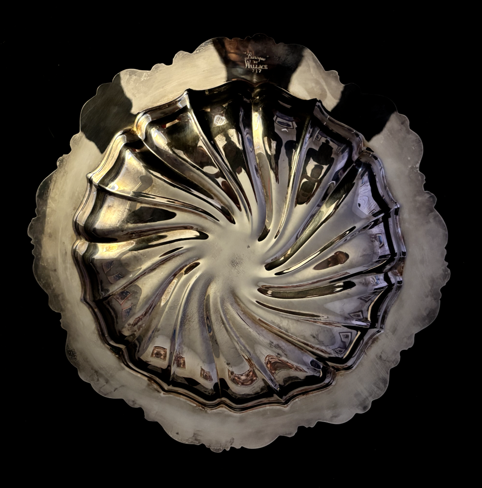 Baroque by Wallace Large Shrimp and Dip Server Silver Plated #717. EUC with no dents, scratches. There are a couple of spots of oxidation (please see pictures). Measures approximately 12 inches diameter wide, 2.5 inches tall. Dip cup screws into middle.