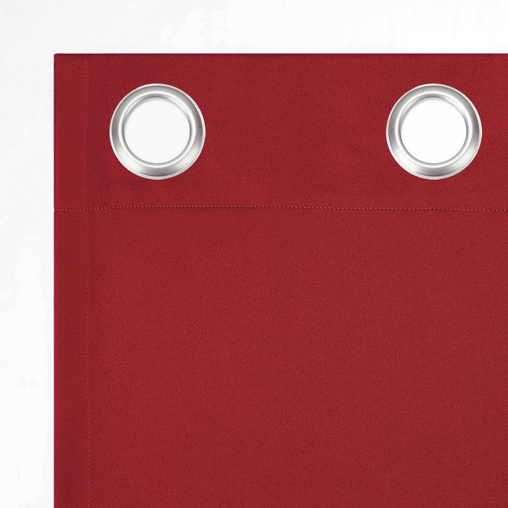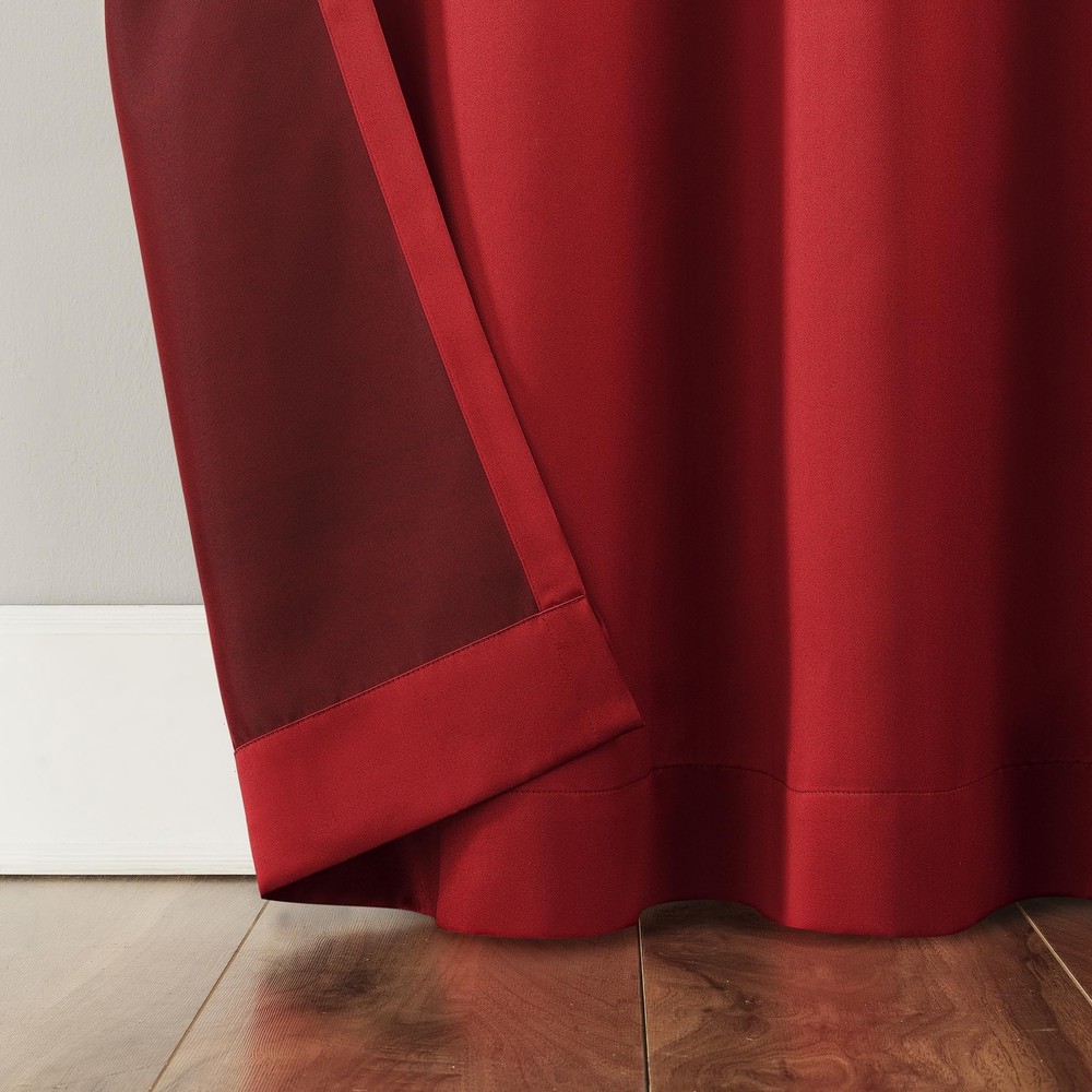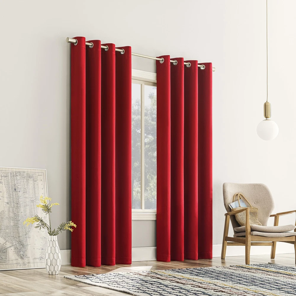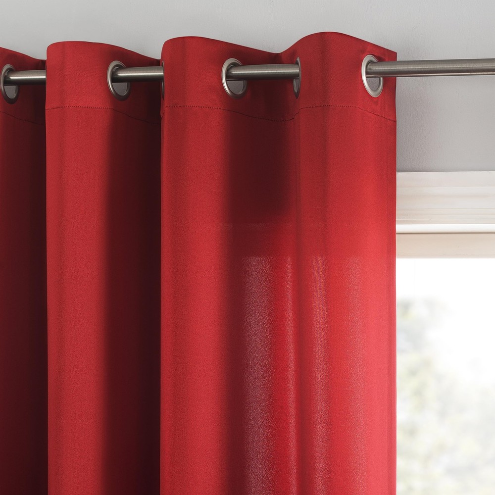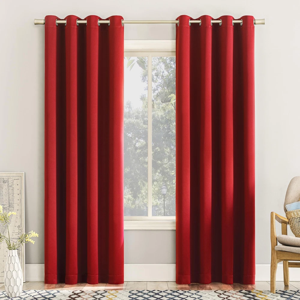 Barrow Energy Saving Energy Saving Grommet Curtain Panel Pair brings style and energy efficiency to any home. The woven solid design with an easy to hang grommet-top offers a classic style that fits in with any room decor while reducing light and noise for better sleep; help keep your home cooler in the summer and warmer in the winter. Curtain panel is made of materials that reduce light, and considerably darken the room. Some light will show through. These materials do not allow a view through and provide complete privacy. The darker the color the better the light reducing capabilities. Sold as a pair including panels. Hang on a rod up to 1.5 inch in diameter. Pair includes 2 holiday red panels, each measuring 54" width by 63" length. Measure carefully before selecting your desired size and quantity. Rod not included. Machine wash cold on gentle cycle. Use non-chlorine bleach when needed. Tumble dry on low heat, using a cool iron as needed. Room Darkening technology blocks out some unwanted light while enhancing privacy Energy efficient design reduces energy lost through your windows by up to 25% Thermal properties help keep summer heat and winter chill out of your home Noise reduction up to 25% helps you get a sounder, more uninterrupted sleep Built-in metal grommets fit curtain rods up to 1.5" in diameter Pair includes (2) panels. Measure carefully prior to purchase.